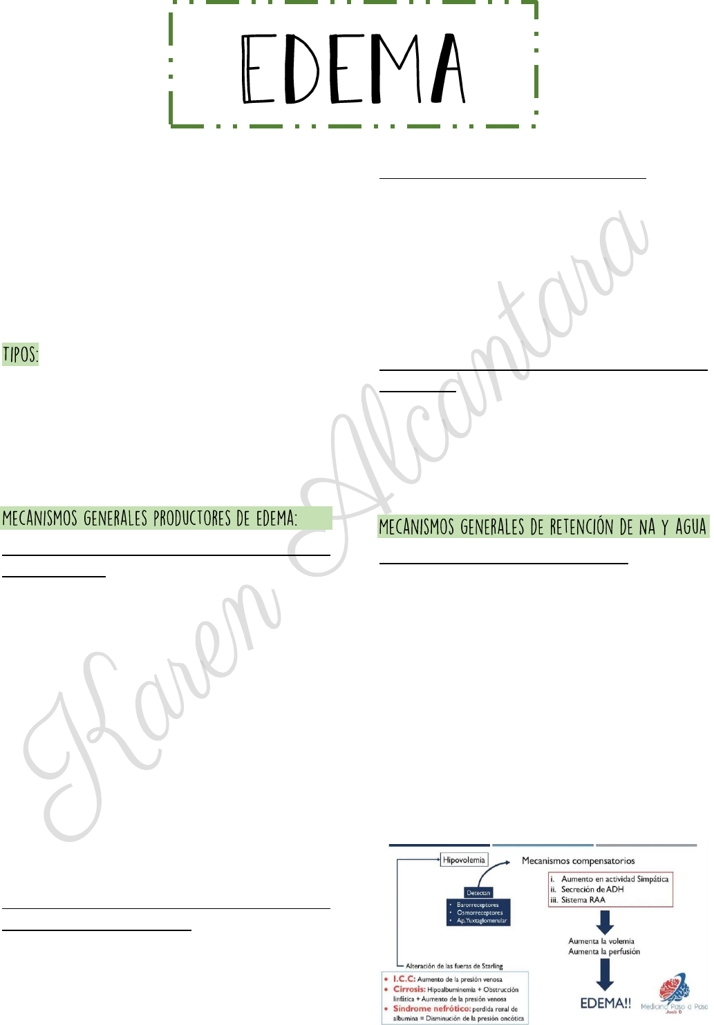 - Acúmulo de fluido en el TCS y en el intersticio de los órganos, que excede el volumen normal de líquido intersticial. - Se puede percibir y diagnosticar mediante el examen físico de la superficie corporal cutánea, a través de la tumefacción o hinchazón de la dermis y el TCS. 1. Localizados: ley de Starling, que regulan el intercambio de líquidos a través de la membrana capilar 2. Generalizados: ley de Starling + trastorno de retención de Na y agua. 1. Por disminución de la reabsorción debido al aumento de la presión venosa: Aumento presión hidrostática. ° Causas locales: - alteran el retorno por obstrucción (trombosis venosa, insuficiencia venosa crónica) - trastornos en la dinámica en circulación venocapilar (estado varicoso y alteración de la bomba musculo venosa) ° Causa general: - hipertensión venosa crónica, provocada por la insufic. cardiaca congestiva (+ importante) - pericarditis constructiva (- importante) - embarazo/menstruación ** 2. Por aumento en la filtración a causa de la disminución en la presión oncótica plasmática: - causada por dificultad de su síntesis, destrucción, pérdidas entéricas excesivas o renales y en casos de desnutrición grave. 3. Por el aumento de la permeabilidad capilar: - edema con características diferentes ya que es la presencia de proteínas que pasan al espacio intersticial - de etiología inflamatoria, problemas generales (alergias o hipersensibilidad, fármacos o tóxicos) - locales (traumatismos, celulitis, quemadura) 4. Por disminución de la reabsorción linfática (obstrucción): - como en el linfedema idiopático o primario - neoplasias, después de radioterapia, poscirugia (causas secundarias bien definidas) 1. Edemas con hipovolemia arterial efectiva: - volemia efectiva es la parte del liq. extracel. Que se encuentra dentro del espacio vascular. - se activa por los barroreceptores (bifurcación Ao, arco carotideo, arteriola yuxtaglomerular, pulmonar y articular) - se considera funcionalmente excluidos de la volemia efectiva los volúmenes alojados en las cavidades cardíacas y en las zonas venosas con gran capacitancia. - en los edemas con hipovolemia, el desplazamiento del liq. al espacio intersticial origina una depleción de volumen circulante “relleno insuficiente” con rtas fisiológicas para compensar. 2. Edemas con aumento de la volemia arterial efectiva: - Hipervolemia: edema menos frecuente que evoluciona con el aumento de la volemia efectiva - corresponde a una falla renal primaria que perturba la excreción de sodio y agua - evolucionan con exceso hidrosalino - provocados por la presión hidrostática capilar - C.C.: hipovolemia franca, hipertensión arterial, ingurgitación yugular. - El examen físico incluye la búsqueda del edema en los sitios donde es posible detectarlo en forma primaria - Cuando el pcte deambula normalmente se lo buscará en los pies y en las piernas y sobre todo en las zonas de los maléolos y adyacentes. - La presencia de edema provoca un cambio en el contorno usual de la zona anatómica. - Se aplica sobre la superficie de la piel, con el dedo índice, una cierta presión durante unos segundos y al retirarlo se ve una depresión, signo de la fóvea o de Godet, que persiste durante algún tiempo y que indica la existencia de edema. - Cuando el pcte está en cama, la investigación es hecha sobre la región sacra. - En edemas muy importantes, estos avanzan hacia las piernas y los muslos. - Pctes que están en cama el dorso y flancos son sitios electivos de la búsqueda. - La exploración de muslos y flancos deben hacerse toma de un grueso pliegue cutáneo con una o las dos manos en forma de pinza entre el pulgar y el índice, y luego algunos segundos al soltarlo suavemente se podrá en evidencia la depresión ejercida, que tiene el mismo de la fóvea descrita. se puede medir por el grado de depresión que puede provocarse y el tiempo de reparación de la forma. Grado 1: leve depresión sin distorsión visible del contorno y desaparición casi instantánea. Grado 2: depresión de hasta 4mm y desaparición en 15s. Grado 3: depresión de hasta 6mm y recuperación de la forma en 1 min. Grado 4: depresión profunda hasta de 1cm con persistencia de 2 a 5 min. - Existen causas generales que tienden a manifestarse en regiones corporales que favorecen la acumulación de líquido, como los parpados y las conjuntivas. - El examen comprende además de la búsqueda del signo de Godet el estudio de sus características semiológicas intrínsecas, que son: Distribución y localización: localizado (miembros, cara, palpebral, región pre-sacral); generalizado (anasarca). Intensidad: signo de Godet +, pesando al pcte diariamente, midiendo el perímetro de la región edematizada. Consistencia: blanda (renal) o dura (linfedema) Elasticidad: elástico (retorna inmediatamente; inflamatorio), inelástico (demora a retornar). Temperatura: inflamatorio (se acompaña de dolor, rubor y calor) y no inflamatorio. Sensibilidad: doloroso o indoloro. Otras alteraciones: palidez, cianosis, eritema, piel lisa y brillante y arrugada. - Presencia de edemas muy importantes y generalizados: ANASARCA (puede agregarse la presencia de trasudados en las cavidades serosas) - aparece en el hipotiroidismo, - acumulación de mucpolisácaridos hidrófilos en la piel; - no presenta signo de fóvea; - no permite fácil desplazamiento por el material mucoide que infiltra la piel. - vasos linfáticos no drenan el exceso de proteína que pasan normalmente al intersticio; - no produce signo de Godet; - Unilaterales: cirugía radical de la mama; - Secundarios: infecciones de las vías linfáticas o de la piel. - Se debe efectuar el estudio de sus características y el contexto clínico en el que aparece. - El edema tiene como localización preferente los miembros inferiores y es importante el análisis según su presentación sea simétrica o asimétrica. ° Edemas simétricos: - cardiaco; - desnutrición; - hepático;