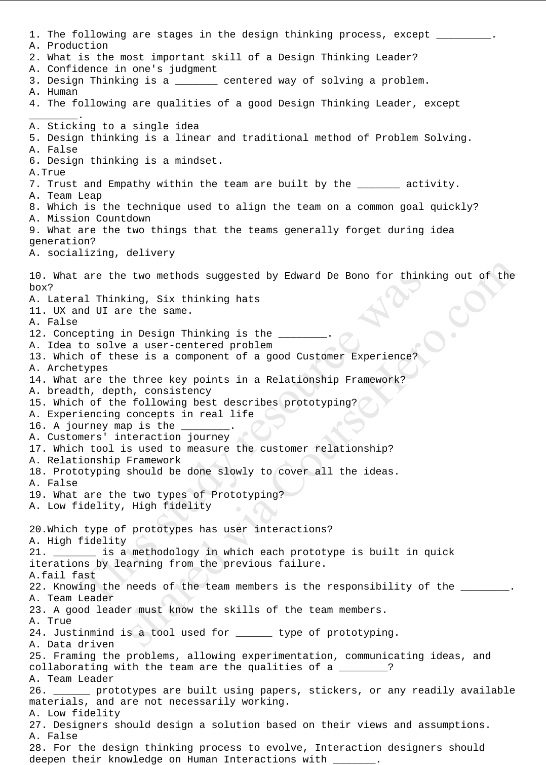 1. The following are stages in the design thinking process, except _________. A. Production 2. What is the most important skill of a Design Thinking Leader? A. Confidence in one's judgment 3. Design Thinking is a _______ centered way of solving a problem. A. Human 4. The following are qualities of a good Design Thinking Leader, except ________. A. Sticking to a single idea 5. Design thinking is a linear and traditional method of Problem Solving. A. False 6. Design thinking is a mindset. A.True 7. Trust and Empathy within the team are built by the _______ activity. A. Team Leap 8. Which is the technique used to align the team on a common goal quickly? A. Mission Countdown 9. What are the two things that the teams generally forget during idea generation? A. socializing, delivery 10. What are the two methods suggested by Edward De Bono for thinking out of the box? A. Lateral Thinking, Six thinking hats 11. UX and UI are the same. A. False 12. Concepting in Design Thinking is the ________. A. Idea to solve a user-centered problem 13. Which of these is a component of a good Customer Experience? A. Archetypes 14. What are the three key points in a Relationship Framework? A. breadth, depth, consistency 15. Which of the following best describes prototyping? A. Experiencing concepts in real life 16. A journey map is the ________. A. Customers' interaction journey 17. Which tool is used to measure the customer relationship? A. Relationship Framework 18. Prototyping should be done slowly to cover all the ideas. A. False 19. What are the two types of Prototyping? A. Low fidelity, High fidelity 20.Which type of prototypes has user interactions? A. High fidelity 21. _______ is a methodology in which each prototype is built in quick iterations by learning from the previous failure. A.fail fast 22. Knowing the needs of the team members is the responsibility of the ________. A. Team Leader 23. A good leader must know the skills of the team members. A. True 24. Justinmind is a tool used for ______ type of prototyping. A. Data driven 25. Framing the problems, allowing experimentation, communicating ideas, and collaborating with the team are the qualities of a ________? A. Team Leader 26. ______ prototypes are built using papers, stickers, or any readily available materials, and are not necessarily working. A. Low fidelity 27. Designers should design a solution based on their views and assumptions. A. False 28. For the design thinking process to evolve, Interaction designers should deepen their knowledge on Human Interactions with _______. This study source was downloaded by 100000774170107 from CourseHero.com on 09-29-2021 18:09:29 GMT -05:00 https://www.coursehero.com/file/61386928/DesignThinkingtxt/ Th is stu dy re so ur ce w as sh are d v ia Co ur se He ro .co m https://www.coursehero.com/file/61386928/DesignThinkingtxt/ A. Organizations 29. Breadth, depth, and consistency are the key points of measurement in ________. A. Relationship Framework This study source was downloaded by 100000774170107 from CourseHero.com on 09-29-2021 18:09:29 GMT -05:00 https://www.coursehero.com/file/61386928/DesignThinkingtxt/ Th is stu dy re so ur ce w as sh are d v ia Co ur se He ro .co m Powered by TCPDF (www.tcpdf.org) https://www.coursehero.com/file/61386928/DesignThinkingtxt/ http://www.tcpdf.org