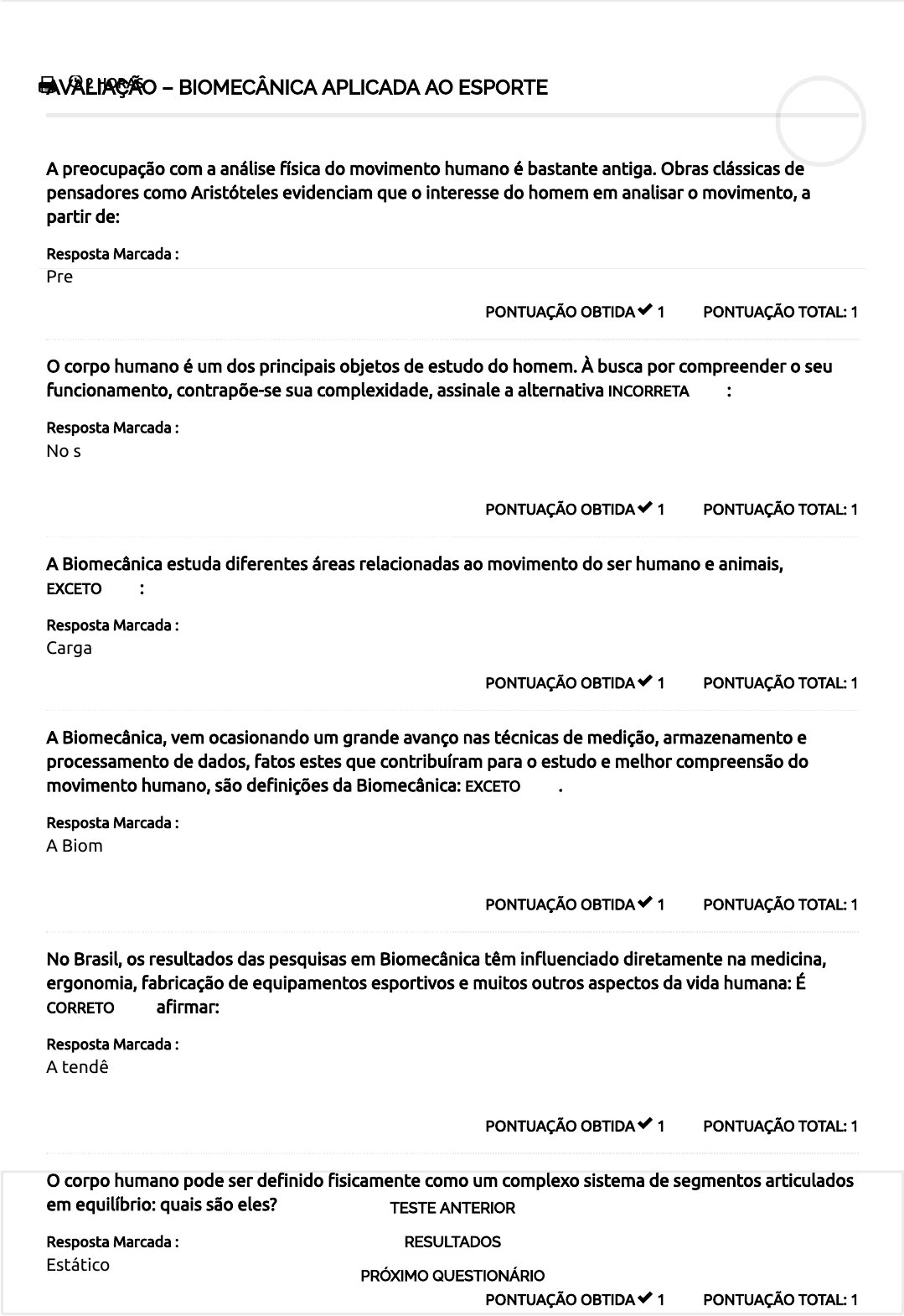 2 HORAS AVALIAÇÃO – BIOMECÂNICA APLICADA AO ESPORTE FIM TESTE ANTERIOR RESULTADOS PRÓXIMO QUESTIONÁRIO AVALIAÇÃO – BIOMECÂNICA APLICADA AO ESPORTE PONTUAÇÃO TOTAL: 1PONTUAÇÃO OBTIDA 1 A preocupação com a análise física do movimento humano é bastante antiga. Obras clássicas de pensadores como Aristóteles evidenciam que o interesse do homem em analisar o movimento, a partir de: Resposta Marcada : Preceitos físicos e antiquíssimo PONTUAÇÃO TOTAL: 1PONTUAÇÃO OBTIDA 1 O corpo humano é um dos principais objetos de estudo do homem. À busca por compreender o seu funcionamento, contrapõe-se sua complexidade, assinale a alternativa INCORRETA : Resposta Marcada : No século XX não ocorreram grandes avanços tecnológicos que se re�etiram nos métodos experimentais usados em praticamente todas as áreas de atuação cientí�ca, incluindo a Biomecânica PONTUAÇÃO TOTAL: 1PONTUAÇÃO OBTIDA 1 A Biomecânica estuda diferentes áreas relacionadas ao movimento do ser humano e animais, EXCETO : Resposta Marcada : Cargas e sobrecargas excessivas PONTUAÇÃO TOTAL: 1PONTUAÇÃO OBTIDA 1 A Biomecânica, vem ocasionando um grande avanço nas técnicas de medição, armazenamento e processamento de dados, fatos estes que contribuíram para o estudo e melhor compreensão do movimento humano, são de�nições da Biomecânica: EXCETO . Resposta Marcada : A Biomecânica do Esporte não enfatiza se dedica ao estudo do corpo humano e do movimento esportivo em relação a leis e princípios físico-mecânicos PONTUAÇÃO TOTAL: 1PONTUAÇÃO OBTIDA 1 No Brasil, os resultados das pesquisas em Biomecânica têm in�uenciado diretamente na medicina, ergonomia, fabricação de equipamentos esportivos e muitos outros aspectos da vida humana: É CORRETO a�rmar: Resposta Marcada : A tendência cada vez mais intensa de popularizar o exercício físico, além dos conhecidos benefícios para a promoção e manutenção da saúde PONTUAÇÃO TOTAL: 1PONTUAÇÃO OBTIDA 1 O corpo humano pode ser de�nido �sicamente como um complexo sistema de segmentos articulados em equilíbrio: quais são eles? Resposta Marcada : Estático e Dinâmico × https://ava.ead.abeu.edu.br/membros/12512173704/course/course-results/?action=222042 TESTE ANTERIOR RESULTADOS PRÓXIMO QUESTIONÁRIO AVALIAÇÃO – BIOMECÂNICA APLICADA AO ESPORTE PONTUAÇÃO TOTAL: 1PONTUAÇÃO OBTIDA 1 A preocupação com a análise física do movimento humano é bastante antiga. Obras clássicas de pensadores como Aristóteles evidenciam que o interesse do homem em analisar o movimento, a partir de: Resposta Marcada : Preceitos físicos e antiquíssimo PONTUAÇÃO TOTAL: 1PONTUAÇÃO OBTIDA 1 O corpo humano é um dos principais objetos de estudo do homem. À busca por compreender o seu funcionamento, contrapõe-se sua complexidade, assinale a alternativa INCORRETA : Resposta Marcada : No século XX não ocorreram grandes avanços tecnológicos que se re�etiram nos métodos experimentais usados em praticamente todas as áreas de atuação cientí�ca, incluindo a Biomecânica PONTUAÇÃO TOTAL: 1PONTUAÇÃO OBTIDA 1 A Biomecânica estuda diferentes áreas relacionadas ao movimento do ser humano e animais, EXCETO : Resposta Marcada : Cargas e sobrecargas excessivas PONTUAÇÃO TOTAL: 1PONTUAÇÃO OBTIDA 1 A Biomecânica, vem ocasionando um grande avanço nas técnicas de medição, armazenamento e processamento de dados, fatos estes que contribuíram para o estudo e melhor compreensão do movimento humano, são de�nições da Biomecânica: EXCETO . Resposta Marcada : A Biomecânica do Esporte não enfatiza se dedica ao estudo do corpo humano e do movimento esportivo em relação a leis e princípios físico-mecânicos PONTUAÇÃO TOTAL: 1PONTUAÇÃO OBTIDA 1 No Brasil, os resultados das pesquisas em Biomecânica têm in�uenciado diretamente na medicina, ergonomia, fabricação de equipamentos esportivos e muitos outros aspectos da vida humana: É CORRETO a�rmar: Resposta Marcada : A tendência cada vez mais intensa de popularizar o exercício físico, além dos conhecidos benefícios para a promoção e manutenção da saúde PONTUAÇÃO TOTAL: 1PONTUAÇÃO OBTIDA 1 O corpo humano pode ser de�nido �sicamente como um complexo sistema de segmentos articulados em equilíbrio: quais são eles? Resposta Marcada : Estático e Dinâmico × https://ava.ead.abeu.edu.br/membros/12512173704/course/course-results/?action=222042