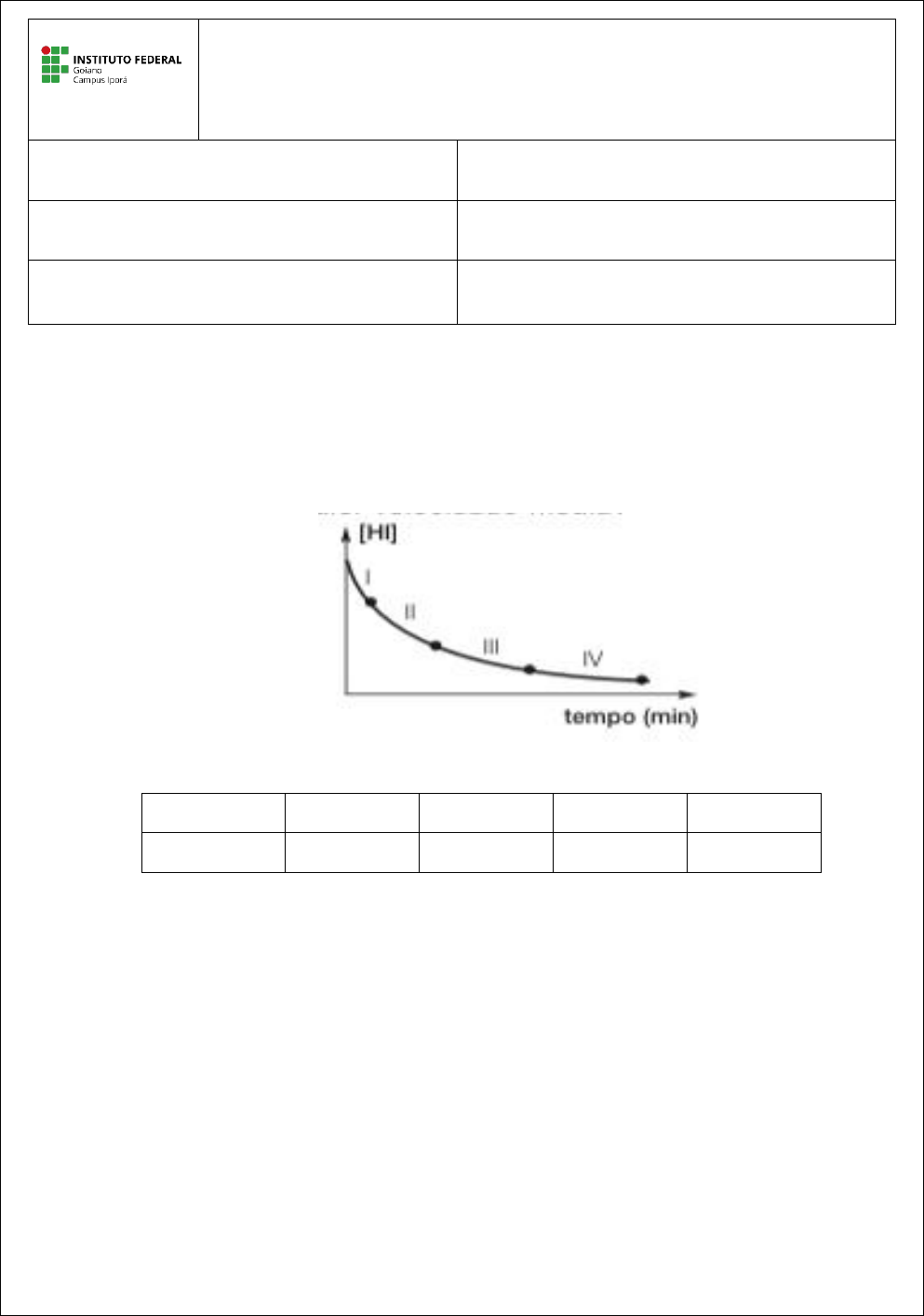 Questionário 1. (FUVEST-SP) O gráfico mostrado a seguir foi construído com dados obtidos no estudo da decomposição do iodeto de hidrogênio, á temperatura constante. Em qual dos quatro trechos assinalados n curva a reação ocorre com maior velocidade? 2. Seja a reação: X → Y + Z. A variação na concentração de X em função do tempo é: X( mol/L) 1,0 0,7 0,4 0,3 Tempo(s) 0 120 300 540 Determine a velocidade média da reação no intervalo de 2 a 5 minutos? 3. (PUC-RS) Numa experiência, a reação de formação de amônia (NH3), a partir do N2 e do H2, está ocorrendo com um consumo de 12 mols de nitrogênio (N2) a cada 120 segundos. Nesse caso, a velocidade de consumo de hidrogênio (H2) é: a) 6 mol L⁻ˡ.min. b) 12 mol L⁻ˡ.min. c) 18 mol L⁻ˡ.min. d) 24 mol L⁻ˡ.min. e) 36 mol L⁻ˡ.min. Instituto Federal de Educação, Ciência e Tecnologia Goiano Campus Iporá Professor (a): Jéssica Maria dos Santos Carvalho Data: 12/07/2021 Turno: Matutino Duração: 120 minutos Público Alvo: 2° ano do ensino médio Disciplina: Química 4. Uma mistura de vapor de gasolina e ar, á temperatura ambiente, não reage. Entretanto, no motor de carros, em presença de faísca elétrica, ocorre a combustão da gasolina. Dessa constatação são feitas as seguintes afirmações: I- A faísca fornece á mistura a energia necessária para iniciar a reação. II- A faísca é a única responsável pela combustão da gasolina, uma vez que ela ocorre mesmo em total ausência de ar. III- A reação que ocorre é exotérmica. IV- A faísca faz com que as moléculas de oxigênio se separem do ar e reajam com a gasolina. Das afirmações feitas, somente são corretas: a) I e IV b) II e III c) III e IV d) I e III e) I, III e IV 5. Sobre os fatores que influenciam a velocidade de uma reação química é INCORRETO afirmar que: a) Quanto maior a concentração dos reagentes, maior a velocidade da reação. b) Quanto maior a superfície de contato, maior a velocidade da reação. c) Quanto maior a pressão, maior a velocidade da reação. d) Quanto maior a temperatura, maior a velocidade da reação. e) A presença de um catalisador mantém constante a velocidade da reação 6. O dióxido de carbono é um gás formado pela reação entre os gases monóxido de carbono e oxigênio, conforme a equação química abaixo. CO(g) + ½ O2(g) → CO2(g) Sabendo-se que em 5 minutos de reação foram consumidos 2,5 mol de CO, qual a taxa de desenvolvimento da reação de acordo com o consumo de O2? a) 0,2 mol . min-1 b) 1,5 mol . min-1 c) 2,0 mol . min-1 d) 0,25 mol . min-1 1 mol CO – ½ mol de O2 2,5 mol CO – x de O2 x = 1,25 mol Vm= Consumo de O₂ /tempo Vm= 1, 25 mol/ 5 minutos Vm= 0,25 mol . min-1 7. O gráfico a seguir refere-se ao diagrama energético de uma reação química ( reagentes →produtos) onde se vêem destacados dois caminhos de reação. Após uma analise das entalpias dos reagentes, dos produtos e dos valores A, B , C e D podemos afirmar que a A) A reação é endotérmica e a presença do catalisador diminui o ΔH de A para B. B) A reação é endotérmica e A representa o ΔH com a presença do catalisador. C) Reação é exotérmica e a energia de ativação, sem a presença do catalisador, é representada por C. D) A presença do catalisador diminui o ΔH da reação representada por C. E) A presença do catalisador diminuir a energia de ativação de A para B e mantém constante o ΔH da reação representada por D. 8. (ENEM) – Alguns fatores podem alterar a rapidez das reações químicas. A seguir destacam-se três exemplos no contexto da preparação e da conservação de alimentos: 1. A maioria dos produtos alimentícios se conserva por muito mais tempo quando submetidos à refrigeração. Esse procedimento diminui a rapidez das reações que contribuem para a degradação de certos alimentos. 2. Um procedimento muito comum utilizado em práticas de culinária é o corte dos alimentos para acelerar o seu cozimento, caso não se tenha uma panela de pressão. 3. Na preparação de iogurtes, adicionam-se ao leite bactérias produtoras de enzimas que aceleram as reações envolvendo açúcares e proteínas lácteas. https://enem.inep.gov.br/ Com base no texto, quais são os fatores que influenciam a rapidez das transformações químicas relacionadas aos exemplos 1, 2 e 3, respectivamente? a) Temperatura, superfície de contato e concentração. b) Concentração, superfície de contato e catalisadores. c) Temperatura, superfície de contato e catalisadores. d) Superfície de contato, temperatura e concentração. e) Temperatura, concentração e catalisadores 9. Escreva as equações de velocidade considerando as reações elementares: A) 2 HCl(g) → H₂(g) + Cl₂ (g) B) H₂ + I₂ → 2 HI (g) C) 2 CO(g) + O₂(g) → 2 CO₂ (g) D) 2 NH₃ (g) → N₂(g) + 3 H₂(g) E) N₂(g) + 3 H₂(g) → 2 NH₃(g) 10. A seguir, estão representadas as etapas da reação: H₂ + Br₂ → 2 HBr I- Br₂→ Br•+ Br• (etapa rápida ) II- H₂ +Br• → HBr + H• (etapa lenta ) III- H• + Br₂ → HBr+ Br• (etapa rápida) IV- Br• + Br• → Br₂ ( etapa rápida) A velocidade da reação e determinada pela etapa: A) I B) II C) III D) IV 11. Para o processo químico, representado pela equação genérica a seguir, indique a equação de velocidade desse processo. 3X + 2 Y → Z + 5W V= K. [ X]³ + [Y]² 12. Você esta cozinhando batatas e fazendo carne grelhada em fogo baixo, em um fogão a gás. Se você passar as duas bocas do fogão para fogo alto, o que acontecerá com o tempo de preparo? Justifique.