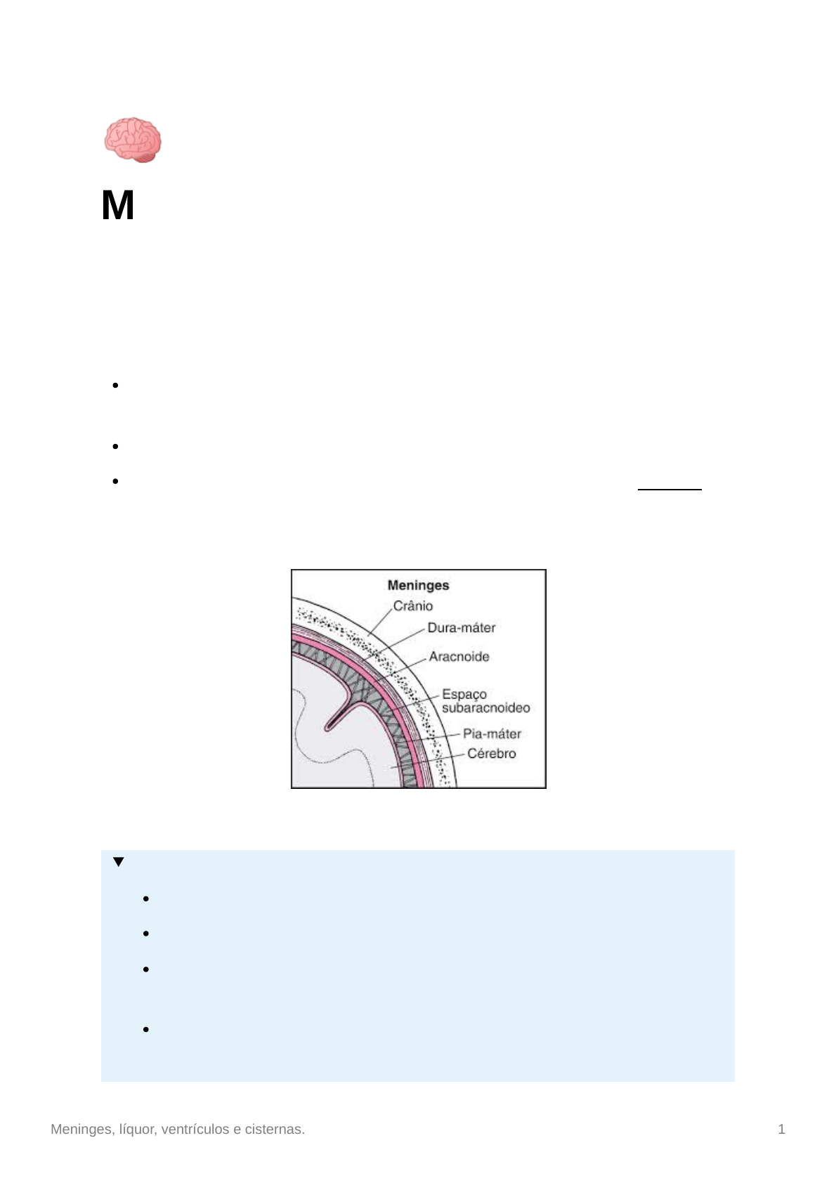 Meninges, líquor, ventrículos e cisternas. 1 🧠 Meninges, líquor, ventrículos e cisternas. O encéfalo e a medula espinal são recobertos por meninges, que são membranas de tecido conjuntivo. São formadas por três camadas: durá-máter (paquimaninge), aracnoide e pia- máter (leptomeninges). O espaço entre as meninges é onde transita o líquor. Momentos de dilatação onde esse líquor transita são chamados de cisterna; nesses momentos há maior quantidade de líquor e é usado para coleta liquórica. Dura-máter: meninge mais externa, resistente e espessa. Adjacente ao periósteo. Composta por células meningoteliais e tecido conjuntivo denso modelado. Reveste a face interna do crânio e tem 4 projeções que compartimentalizam a cavidade craniana. O seios da dura-máter, que são grandes veias decorrentes da delaminação, convergem para a jugular interna. Meninges, líquor, ventrículos e cisternas. 2 As veias da superfície cortical drenam para os seios durais. Se a estrutura na qual as veias estão aderidas atrofias, as veias serão tracionadas e tenderão a dilacerar. O suprimento dural é proveniente das artérias meníngea anterior, média e posterior. Espaço entre osso e dura-máter: epidural (o espaço epidural craniano não tem coleção gordurosa, já na medula tem tecido adiposo e o plexo venoso vertebral) Espaço entre dura-máter e aracnoide: subdural. Possui uma quantidade mínima de líquor e na medula espinhal ele é imaginário. Se estende ao longo do nervo onde é chamada de lâmina vaginal. Se aumenta a pressão intracraniana, aumenta a pressão no nervo óptico. Para visualização, faz-se o exame de fundo de olho. O saco dural é formado pela dura-máter na sua porção mais inferior quando ela se fecha sob si na altura da vértebra S2. No interior desse saco forma- se a cisterna lombar, onde é realizado punções liquóricas, pois nessa região já não há mais tecido nervoso. Diferenças entre cérebro e medula: -No crânio, é adjacente ao periósteo; na medula, é separada pelo espaço epidural. -Espinal é unilaminar, enquanto craniana é bilaminar. Injeções epidurais: -fluidos injetados no espaço extradural/epidural no nível sacral podem se disseminar para a base do crânio. -uma cateterização subdural acidental pode ocorrer durante injeções epidurais. Injeção subdural: -a injeção de fluido no espaço subdural pode lesar a medula por efeito tóxico direto ou por compressão da vasculatura. Meninges, líquor, ventrículos e cisternas. 3 💡 Compartimentos cranianos: -foice do cérebro: lãmina forte, ocupa a fissura longitudinal entre os dois hemisférios cerebrais -tenda do cerebelo: situa-se entre cerebelo e lobos occipitais dos hemisférios cerebrais; divide a cavidade do crânio em compartimentos supratentorial e infratentorial. -foice do cerebelo: prega pequena da dura-máter na linha média que se situa abaixo do tentório do cerebelo. O ápice da foice do cerebelo frequentemente divide-se em duas pregas pequenas, que desaparecem nas laterais do forame magno. É frequentemente dupla. -diafragma da sela: lâmina pequena circular e horizontal da dura- máter. Forma um teto sobre a sela turca e, muitas, vezes, cobre quase que completamente a glândula hipófise. 💡 HEMATOMA SUBDURAL: hematoma do velho. -côncavo-convexo (banana) -coleção sanguínea é lenta, portanto sintomas podem demorar uma semana para aparecer. -é comum em idosos porque, com a idade, o córtex tende a atrofiar. Meninges, líquor, ventrículos e cisternas. 4 💡 HEMATOMA EPIDURAL: hematoma do jovem. -bicôncavo (limão). -não se estende nem pra frente, nem pra trás devido a limitação das suturas cranianas. -sangramento rápido, portanto é necessário tratamento urgente e cirúrgico. -bastante relacionado a ruptura da artéria meníngea média. -relacionado a acidente automobilístico. -ocorre o intervalo lúcido, ou seja, rebaixamento do nível de consciência, retome e depois rebaixa abruptamente. -relacionado a desvio da linda média (estruturas internas do crânio são empurradas para o lado oposto, desviando a linda média; possui caráter urgente devido aumento de pressão e herniação de estruturas). -relacionado a hematoma subgaleal, que ocorrem em impactos de alta intensidade. 🗣 É importante saber que coleções sanguíneas aumentam a pressão dentro do crânio. Meninges, líquor, ventrículos e cisternas. 5 no espaço supratentorial, a pressão faz com que as estruturas desçam para o hiato da tenda. *hiato da tenda: espaço que permite a comunicação do tronco encefálico por meio do mesencéfalo, com o diencéfalo mais acima . no espaço infratentorial, a estrutura hernia pelo forame magno e compromete estruturas do bulbo e da medula espinal. artéria lacerada > sangramento rápido >coleção sanguínea >empurra tecido nervoso >aumenta pressão > fenômenos citados anteriormente. A formação reticular está associada ao nível de consciência. Quando ocorre coleção sanguínea, a pressão aumenta, as estruturas herniam e há compromentimento do mesencéfalo, ocorre perda de consciência. Aracnoide: Composta por células meningoteliais e tecido conjuntivo denso avascularizado. Suas superfícies são revestidas por epitélio simples pavimentoso e de origem mesenquimatosa. Formada por tecido fibroso e elástico que reveste o saco dural espinal e as bainhas durais da raiz. Espaço entre ela e a pia-máter é o espaço subaracnoide. No espaço subaracnoide corre líquor, artérias e veias cerebrais. Vilosidades aracnoides perfuram a dura-máter e estabelecem conexão com os seios venosos subdurais. Essa vilosidades tem como função transferir líquor para o sangue. As cisterna ocorrem nos espaços subaracnoides. 🗨 A parte espinal da aracnoide não está fixada à dura-máter espinal, mas é mantida contra sua face interna pela pressão do líquor. Em uma punção lombar, a agulha atravessa simultaneamente a parte espinal da dura-m