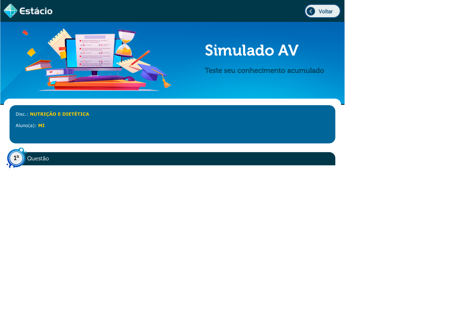Simulado AV Teste seu conhecimento acumulado Disc.: NUTRIÇÃO E DIETÉTICA Aluno(a): MICHELLE CORDOVIL YAMAMOTO DOS SANTOS 202001655778 Acertos: 9,0 de 10,0 29/09/2021 Acerto: 1,0 / 1,0 Manuella de 25 anos, 50 kg, 1,59 m, foi em uma consulta com nutricionista objetivando reeducação alimentar. Foi Questão1 a https://simulado.estacio.br/alunos/inicio.asp javascript:voltar();