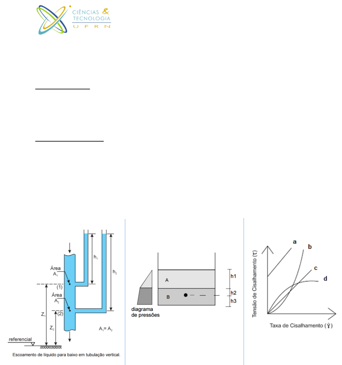 UNIVERSIDADE FEDERAL DO RIO GRANDE DO NORTE ESCOLA DE CIÊNCIAS E TECNOLOGIA Disciplina: ECT2413 - Mecânica dos Fluidos Profª Drª Nayára Bezerra Carvalho QUESTIONÁRIO 1 (10% DA NOTA DA UNIDADE I) 2021_1 Instruções iniciais: Este arquivo em PDF lista todas as questões do questionário da Unidade I de Mecânica dos Fluidos, podendo ser utilizados para aprofundar os conhecimentos na disciplina e preparação para a prova. Além disso, cada estudante deverá acessar o Multiprova diretamente para responder 6 questões que serão definidas aleatoriamente pelo sistema. Essa atividade tem o valor de 10% da nota final da primeira Unidade. Prazo para finalização: 05 de julho de 2021 até as 23:59h. Teoria Os aspectos teóricos e práticos da mecânica dos fluidos são de fundamental importância para a solução de diversos problemas encontrados habitualmente na engenharia, sendo suas principais aplicações destinadas ao estudo de escoamentos de líquidos e gases, máquinas hidráulicas, aplicações pneumáticas e hidráulica industrial, sistemas de ventilação e ar condicionado além de diversas aplicações na área de aerodinâmica voltada para a indústria aeroespacial. Acerca do que foi estudado na disciplina, observem as figuras 1, 2 e 3 e julgue os seguintes itens e marque as alternativas falsas. Figura 1 Figura 2 Figura 3 Na figura 1, analisando as alturas dos piezômetros pode-se afirmar que a pressão estática (efetiva) no ponto 2 é menor que no ponto 1. A Figura 2 mostra um reservatório de fundo horizontal, em repouso, que contém dois fluidos imiscíveis, identificado por A e B, no qual há uma esfera de diâmetro conhecido, está submersa. Afirma-se que o fluido B possui densidade relativa igual ou menor que a do fluido A. O empuxo que os fluidos exercem sobre a esfera na Figura 2 depende das alturas h1 e h2. A pressão em um ponto localizado na interface dos fluidos contidos no tanque da Figura 2 é igual ao produto do peso específico do fluido A pela altura h1. A pressão sobre o fundo do recipiente (Figura 2) é maior no centro do que nas proximidades das paredes verticais. O gráfico na Figura 3 representa também um fluido pseudoplástico (curva b), que possui características de sólidos e fluidos, conhecidos como viscoplásticos utilizados como fluidos não newtoniano de perfuração e completação. Dentre os fluidos não newtonianos, o tixotrópico são aqueles os quais as propriedades variam com o tempo de aplicação desta tensão e tem sua viscosidade aumentada com o tempo de aplicação da tensão de cisalhamento, voltando a ficar mais viscosos. Para os fluidos dilatantes, mostrado na Figura 3 (d), como por exemplo, as suspensões, à medida que se aumenta a tensão de cisalhamento, o líquido intersticial que lubrifica a fricção entre as partículas é incapaz de preencher os espaços devido a um aumento de volume que frequentemente acompanha o fenômeno e sua viscosidade assim é reduzida, facilitando o escoamento. O Fluido de Bingham mostrado na Figura 3 (a), por apresentar perfil de fluido newtoniano também é conhecido como fluido quase newtoniano, como por exemplo, a pasta de dente e o chantilly. O Fluido “d” na Figura 3 é um fluido pseudoplastico que não se comporta como fluido não newtoniano reopético. Reynolds e propriedade dos fluidos 2) O número de Reynolds é um número adimensional usado na mecânica dos fluidos para cálculo do regime de escoamento de determinado fluido sobre uma superfície. É utilizado, por exemplo, em projetos de tubulações industriais e asa de aviões. Considere as tubulações onde serão transportadas as correntes de fluidos 1, 2 e 3, em temperatura constante de 20ºC, deverão ter diâmetros diferentes. Com base nas características do escoamento e propriedades dos fluidos “a”, “b” e “d” descritas na tabela. Encontre os números de Reynolds: Os regimes de escoamento nas tubulações (corrente) 1, 2 e 3 são respectivamente: Tensão - Lei da Viscosidade de Newton 3) observe a figura abaixo, uma placa de espessura desprezível e área de 1,5 m², desloca-se com velocidade v = 5 m/s constante, gerando uma tensão de 50 N/m² e um diagrama parabólico dado por v(y) = ay² + by + c. De posse dessas informações e das informações que constam na figura, determine a tensão de cisalhamento na metade da altura de lâmina de fluido (viscosidade de 4 Pa.s). 3) Na figura abaixo, uma placa de espessura desprezível e área A1 = 2 m², desloca-se com velocidade v = 5 m/s constante, na interface de dois fluidos, tracionada por uma força F = 400 N. Na pare superior (y = 1 mm) o diagrama de velocidades é considerado linear. Na parte inferior, o diagrama é dado por v(y) = ay² + by + c. De posse dessas informações e das informações que constam na figura, determine a tensão de cisalhamento na parte superior da placa em movimento e a tensão na parte inferior da mesma placa. Manometria 4) Os reservatórios fechados R e S da figura, contém respectivamente, água (1000 kgf/m³) e um líquido de peso específico X. Sabe-se que a pressão em R é igual a 1,1 kgf/cm² e no ponto S a pressão é igual a 0,8 kgf/cm². Calcular o valor do peso específico (X) do líquido S. 4) Dentre os manômetros, os manômetro de tubo U utilizam o próprio geralmente mercúrio como fluido manométrico no sistema para aferir a pressão. Com base nos conhecimentos de estática dos fluidos analise a figura considerando a leitura barométrica de 1 atm, peso específico do óleo de 9500 N/m³, do mercúrio 136000 N/m³ e gravidade 9,81 m/s² e determine as pressões efetivas e absolutas do ar no topo do reservatório e a pressão efetiva no ponto M. 4) Qual a pressão no centro do recipiente A da figura abaixo. Dados: γH2O= 1000 kgf/m³ e γHg= 13600 kgf/m³ e d óleo = 0,8. 4) Dentre os manômetros, os manômetros de tubo U são utilizados para medir diferencial de pressão entre dois pontos de uma tubulação por onde esco