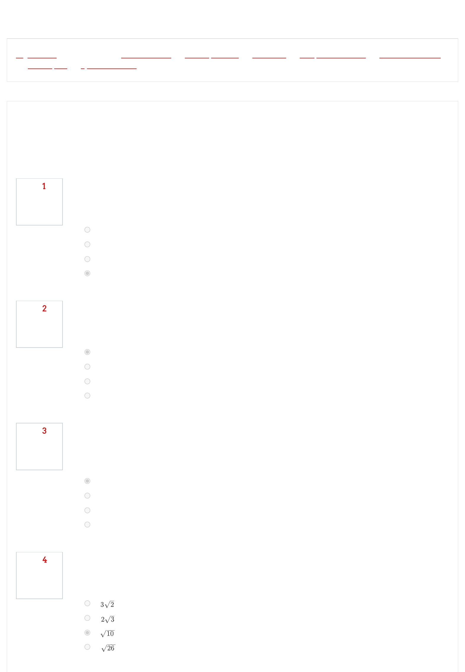 Página inicial / Meus cursos / CURSOS FUNEC / Graduação - EAD / Aluno EAD / JUNÇÕES DE TURMA / Geometria Analítica / AVALIAÇÕES / QUESTIONÁRIO 1 Questão 1 Completo Atingiu 2,00 de 2,00 Questão 2 Completo Atingiu 2,00 de 2,00 Questão 3 Completo Atingiu 0,00 de 2,00 Questão 4 Completo Atingiu 2,00 de 2,00 Iniciado em Saturday, 2 Oct 2021, 13:45 Estado Finalizada Concluída em Friday, 8 Oct 2021, 20:33 Tempo empregado 6 dias 6 horas Avaliar 18,00 de um máximo de 20,00(90%) Sabendo que os pontos A (2, 3), B (5, 3) e C (2, 7) fazem parte dos vértices de um triângulo retângulo, qual seria a área desse triângulo? Escolha uma opção: a. 8 unidades b. 7 unidades c. 5 unidades d. 6 unidades Sabendo que os pontos M, N e O são equidistantes entre si e que a coordenada dos pontos são M (−1; −1), N (5; −7) e O (c; 2), qual seria o valor de “c”? Escolha uma opção: a. c = 8 b. c = 10 c. c = 6 d. c = 12 Sabendo que a distância entre os pontos P (6, 7) e Q (-2, b) é 10, qual seria o valor de “b”? Escolha uma opção: a. b = −1 ou 10 b. b = 10 c. b = −1 d. b = 1 ou 13 Sabendo-se que a representação gráfica das funções reais f(x) = x² – 2x – 3 e g(x) = – x² + 4x – 5 são parábolas em um eixo ortogonal, qual seria a distância entre seus vértices? Escolha uma opção: a. b. c. d. 3 2 –√ 2 3–√ 10−−√ 26 −− √ https://ava.funec.br/ https://ava.funec.br/course/index.php?categoryid=10 https://ava.funec.br/course/index.php?categoryid=17 https://ava.funec.br/course/index.php?categoryid=19 https://ava.funec.br/course/index.php?categoryid=77 https://ava.funec.br/course/view.php?id=632 https://ava.funec.br/course/view.php?id=632#section-5 https://ava.funec.br/mod/quiz/view.php?id=7694 Questão 5 Completo Atingiu 2,00 de 2,00 Questão 6 Completo Atingiu 2,00 de 2,00 Questão 7 Completo Atingiu 2,00 de 2,00 Questão 8 Completo Atingiu 2,00 de 2,00 Questão 9 Completo Atingiu 2,00 de 2,00 Sabendo que a coordenada x do ponto médio entre os pontos C e D é 8 e que a=3b, determine “a”. Escolha uma opção: a. a = 13 b. a = 12 c. a = 14 d. a = 11 Usando determinantes, qual o valor de “a” que faz com que os pontos M (a, −4), N (−1, 5) e O (2, 8) sejam colineares. Escolha uma opção: a. a = 15 b. a = −8 c. a = −10 d. a = 12 Um paralelogramo ABCD possui vértices consecutivos os pontos A (0; 0), B (1; 4) e C (3; 6). Com essas informações, qual seria o valor do comprimento BD? Escolha uma opção: a. b. c. d. 5 3–√ 2 3–√ 5–√ Qual a distância entre os pontos A (2,4) e B (2,2)? Escolha uma opção: a. d = 7 b. d = 2 c. d = 10 d. d = 5 Qual a distância entre os pontos M (−7, 6) e N (5, −3)? Escolha uma opção: a. d = 10 b. d = 20 c. d = 15 d. d = 25 Questão 10 Completo Atingiu 2,00 de 2,00 Qual a distância entre os pontos (4, −2) e (−1, 3)? Escolha uma opção: a. b. c. d. 2 3–√ 5 2 –√ 2 5–√ 3 5–√ ◄ ASSOCIAÇÃO DE UMA EQUAÇÃO DE 1º GRAU A UMA RETA NO PLANO CARTESIANO Seguir para... CONTATOS Av. Moacyr de Mattos, 49 - Centro - Caratinga, MG Telefone : (33) 99986-3935 E-mail : secretariaead@funec.br REDES SOCIAIS https://ava.funec.br/mod/page/view.php?id=7077&forceview=1 mailto:secretariaead@funec.br https://www.facebook.com/caratingaunec https://twitter.com/caratingaunec