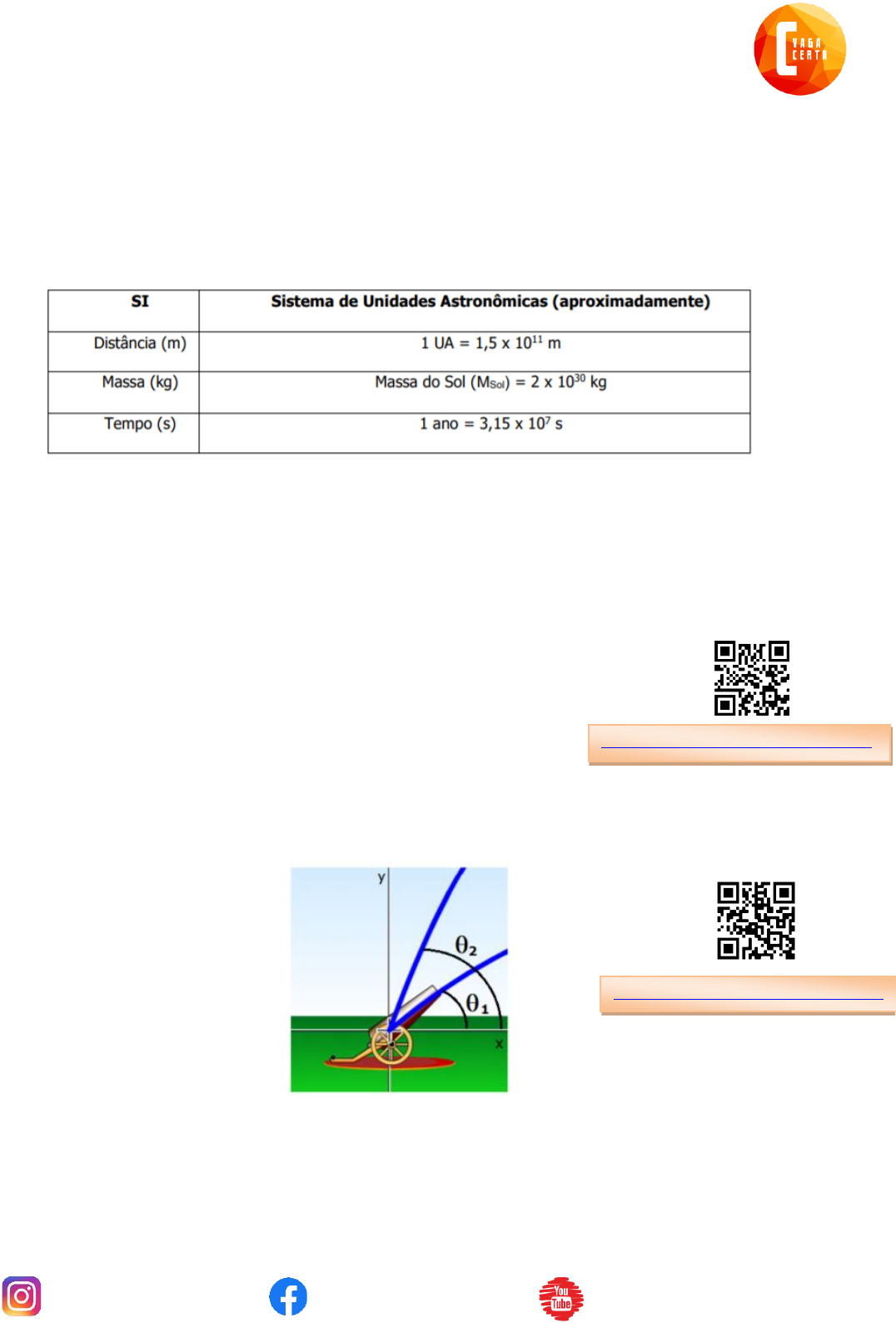CursoVagaCerta CursoVagaCerta CursoVagaCerta FÍSICA – UFRGS 2020 1. No Sistema Internacional de Unidades (SI), utiliza-se o metro (m), o quilograma (kg) e o segundo (s), respectivamente, como unidades de comprimento, massa e tempo. Em Astronomia, são definidas unidades de medida mais apropriadas para o estudo de objetos astronômicos no Sistema Solar. A tabela abaixo mostra a equivalência entre as duas notações. Assinale a alternativa que preenche corretamente as lacunas abaixo, na ordem em que aparecem. A órbita do planeta Netuno em torno do Sol tem um raio médio de 4,5 x 109 km. Essa distância corresponde, aproximadamente, a ........ UA. Júpiter, o planeta mais massivo do Sistema Solar, tem massa 𝑀𝐽 aproximadamente igual a 2 x 10 22 kg, o que corresponde a ........ 𝑀𝑠𝑜𝑙 . O módulo da velocidade da luz, c = 3 x 10 5 km/s, corresponde a, aproximadamente, ........ UA/ano. (A) 30 - 1,0 X 108 - 1,4 X 109 (B) 30 - 1,0 X 10−8 - 6,3 X 104 (C) 3 - 1,0 X 10−8 - 6,3 X 101 (D) 0,03 - 1,0 x 10−8 - 6,3 x 104 (E) 0,03 - 1,0 X 108 - 1,4 X 109 2. Dois projéteis são disparados simultaneamente no vácuo, a partir da mesma posição no solo, com ângulos de lançamento diferentes, 𝜃1< 𝜃2, conforme representa a figura abaixo. Os gráficos a seguir mostram, respectivamente, as posições verticais y como função do tempo t, as posições horizontais x como função do tempo t e as posições verticais y como função das posições horizontais x, dos dois projéteis. Clique aqui e veja a resolução dessa questão Clique aqui e veja a resolução dessa questão https://www.instagram.com/cursovagacerta/ https://www.facebook.com/CursoVagaCerta/ https://www.facebook.com/CursoVagaCerta/ https://www.youtube.com/cursovagacerta https://youtu.be/LgPvRp55YTY https://youtu.be/IrwEa3k-z6E CursoVagaCerta CursoVagaCerta CursoVagaCerta Analisando os gráficos, pode-se afirmar que I - o valor inicial da componente vertical da velocidade do projétil 2 é maior do que o valor inicial da componente vertical da velocidade do projétil 1. II - o valor inicial da componente horizontal da velocidade do projétil 2 é maior do que o valor inicial da componente horizontal da velocidade do projétil 1. III- os dois projéteis atingem o solo no mesmo instante. Quais estão corretas? (A) Apenas I. (B) Apenas II. (C) Apenas I e III. (D) Apenas II e III. (E) I, II e III. 03. A figura abaixo representa um bloco de massa 2,0 kg, que se mantém em repouso, sobre uma superfície plana horizontal, enquanto submetido a uma força F paralela à superfície e de intensidade variável. O coeficiente de atrito estático entre o bloco e a superfície vale 0,25. Considere g=10 m/s². Assinale a alternativa que melhor representa o gráfico do módulo da força de atrito estático fe em função do módulo da força aplicada. Clique aqui e veja a resolução dessa questão https://www.instagram.com/cursovagacerta/ https://www.facebook.com/CursoVagaCerta/ https://www.facebook.com/CursoVagaCerta/ https://www.youtube.com/cursovagacerta https://youtu.be/TMk-AfpZqrk CursoVagaCerta CursoVagaCerta CursoVagaCerta 04. A figura abaixo mostra a imagem de um buraco negro na galáxia elíptica Messier 87, obtida através do uso de um conjunto de telescópios espalhados ao redor da Terra. No centro da nossa galáxia, também há um buraco negro, chamado Sagittarius A*. Usando o Sistema Internacional de unidades, a relação entre o raio da órbita, R, e o período de revolução T de um corpo que orbita em torno de um astro de massa M é https://www.instagram.com/cursovagacerta/ https://www.facebook.com/CursoVagaCerta/ https://www.facebook.com/CursoVagaCerta/ https://www.youtube.com/cursovagacerta CursoVagaCerta CursoVagaCerta CursoVagaCerta dada pela 3ª Lei de Kepler R³= 𝑮 𝟒𝝅² 𝑴𝑻², em que G=G,67 x 𝟏𝟎−𝟏𝟏 N.m² /kg² é a constante de gravitação universal. Quando T e R são expressos, respectivamente, em anos e em unidades astronômicas (UA), a 3ª Lei de Kepler pode ser escrita como R³ 𝑻² =M, em que a massa M é expressa em unidades de massa do Sol, 𝑴𝑺𝒐𝒍, Tendo sido observada uma estrela em órbita circular com R ≅ 800 UA e T ≅ 16 anos, conclui-se que a massa do buraco negro na nossa galáxia é, aproximadamente, (A) 2,0 x 𝟏𝟎𝟔 𝑴𝑺𝒐𝒍. (B) 6,4 x 𝟏𝟎𝟒 𝑴𝑺𝒐𝒍. (C) 2,0 x 𝟏𝟎𝟒 𝑴𝑺𝒐𝒍. (D) 6,4 x10³ 𝑴𝑺𝒐𝒍. (E) 2,0 x10² 𝑴𝑺𝒐𝒍. Instrução: As questões 05, 06 e 07 referem-se ao enunciado abaixo. Em 16 de julho de 1969, o foguete Saturno V, com aproximadamente 3.000 toneladas de massa, foi lançado carregando a cápsula tripulada Apollo 11, que pousaria na Lua quatro dias depois. 05. Em sua trajetória rumo à Lua, a espaçonave Apollo 11 esteve sujeita às forças de atração gravitacional exercidas pela Terra e pela Lua, com preponderância de uma ou de outra, dependendo da sua distância à Terra ou à Lua. Considere ML = MT/81, em que ML e MT são, respectivamente, as massas da Lua e da Terra. Na figura abaixo, a distância do centro da Terra ao centro da Lua está representada pelo segmento de reta, dividido em 10 partes iguais. Assinale a alternativa que preenche corretamente a lacuna do enunciado abaixo. Em sua viagem para a Lua, quando a Apollo 11 ultrapassa ponto ........ , o módulo da força gravitacional da Lua sobre a espaçonave passa a ser maior do que o módulo da força gravitacional que a Terra exerce sobre essa espaçonave. (A) I. (B) II. (C) III. (D) IV. (E) V Clique aqui e veja a resolução dessa questão Clique aqui e veja a resolução dessa questão https://www.instagram.com/cursovagacerta/ https://www.facebook.com/CursoVagaCerta/ https://www.facebook.com/CursoVagaCerta/ https://www.youtube.com/cursovagacerta https://youtu.be/TnppG6us71s https://youtu.be/9J3eivl7zrs CursoVagaCerta CursoVagaCerta CursoVagaCerta 06. Em 16 de julho de 1969, o foguete Saturno V, com aproxi