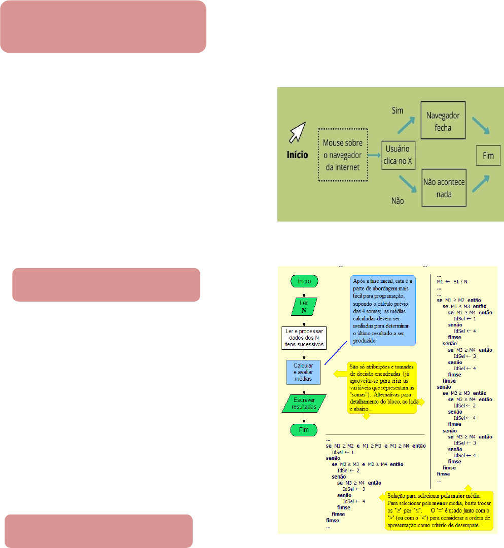 Lógica de programação é o modo como se escreve um programa de computador, um algoritmo. Um algoritmo é uma sequência de passos para se executar uma função. Um exemplo de algoritmo, fora da computação, é uma receita de bolo. Um exemplo de algoritmo, que tem como objetivo somar 3 números inteiros. Evitar comandos longos; Evitar adjetivos e advérbios; Ter comandos legíveis; Ter os comandos bem alinhados; Possuir comentários para o esclarecimento de comandos; Evitar ninhos de SE (muitas possibilidades desnecessárias para uma única situação. Preste atenção à ordem lógica da execução das tarefas; Lembre-se de que ele deve ter um início e fim; Ele deve ser completo; Deve ter um alto nível de detalhes; Cada tarefa é uma instrução, assim, defina-a bem. Algoritmos e Lógica de Programação Algoritmos Estruturado Algoritmo Computacional