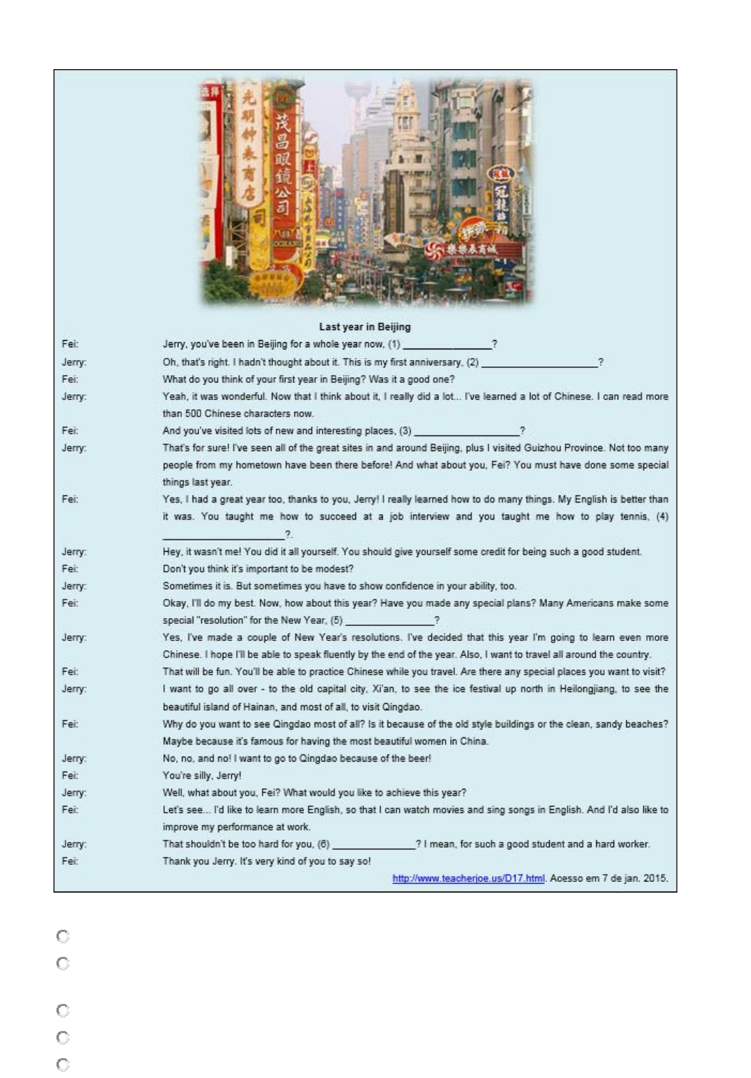PERGUNTA 1 1. Read the following dialog and complete the gaps (1 - 6) with the correct Question Tags: Mark the right alternative: a. (1) did you; (2) doesn’t it; (3) are you; (4) do you; (5) aren’t they; (6) wouldn’t it b. (1) haven’t you; (2) isn’t it; (3) haven’t you; (4) didn’t you; (5) don’t they; (6) should it c. (1) haven’t you; (2) is it; (3) haven’t you; (4) did you; (5) do they; (6) shall it d. (1) have you; (2) does it; (3) did you; (4) didn’t you; (5) are they; (6) should it e. (1) haven’t you; (2) is it; (3) do you; (4) haven’t you; (5) did they; (6) will it PERGUNTA 2 1. Mark the alternative that presents all sentences correctly written concerning the use of Tag Endings: Mark the right alternative: a. (1) My grandparents are having their 50th wedding anniversary tomorrow, haven’t they?; (2) My nephew is learning how to play the piano, isn’t she?; (3) My father doesn’t like to watch soap operas, does he?; (4) My neighbor John is moving to another apartment downtown, isn’t he?; (5) She is a new student here, isn’t she? b. (1) They don’t know how to play the guitar, do they?; (2) She is sending her farmhouse, aren’t you?; (3) It has been years since we talked to each other, hasn’t it?; (4) My maid is cooking dinner now, isn’t she?; (5) The reporters are asking those people what happened, are they? c. (1) They were having dinner when you arrived, weren’t they?; (2) I should walk faster, shouldn’t you?; (3) Your parents are traveling abroad, weren’t they?; (4) Nobody can come in, can’t they?; (5) She is an engineer, is she? d. (1) You could stay longer with me, couldn’t you?; (2) We have made a great decision, haven’t they?; (3) She is answering all her e-mails now, isn’t she?; (4) He had gone away, hadn’t he?; (5) They shouldn’t go now, shouldn’t they? e. (1) You didn’t do your English homework, did you?; (2) Her sister went to school by bus yesterday, didn’t she?; (3) They shouldn’t come so late today, should they?; (4) You are traveling this afternoon, aren’t you?; (5) It is raining a lot in California, isn’t it? PERGUNTA 4 1. Read the following dialog and complete the gaps with the correct Question Tag: Mark the right alternative: a. (1) won’t we; (2) isn’t it b. (1) do we; (2) are they c. (1) are we; (2) aren’t they d. (1) shall we; (2) is it e. (1) would we; (2) is not SEGUNDA TENTATIVA PERGUNTA 3 1. Read the following dialog and complete the gaps with the correct Question Tags: Mark the right alternative: a. (1) will you; (2) do you; (3) shall we; (4) won’t it b. (1) would you; (2) can you; (3) won’t we; (4) doesn’t it c. (1) won’t you; (2) are you; (3) do we; (4) doesn’t it d. (1) do you; (2) don’t you; (3) shall we; (4) will it e. (1) shall we; (2) aren’t you; (3) shall we; (4) won’t it