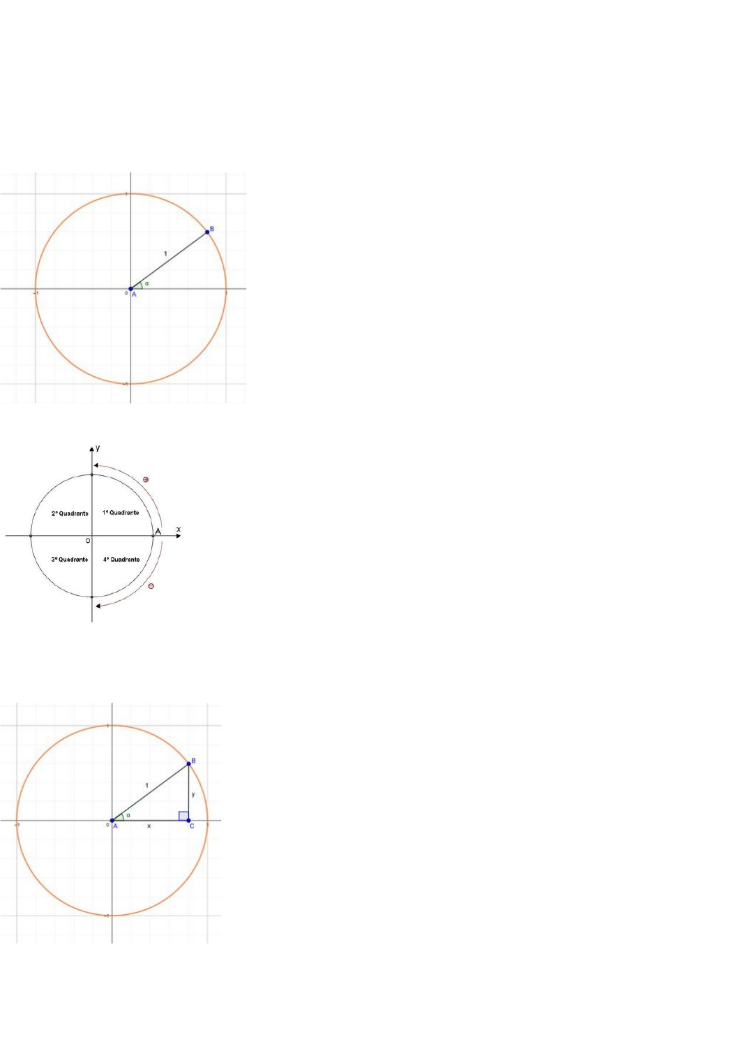 Círculo Trigonométrico A ideia do círculo trigonométrico Quando falamos sobre trigonometria, naturalmente deve aparecer na sua cabeça vários senos e cossenos hahaha É realmente por aí...Mas agora vamos entender como funcionam as relações trigonométricas para QUALQUER ângulo. Precisamos nos recordar que uma volta completa tem 360°, ou seja, será uma circunferência! Vamos pensar no círculo trigonométrico como um círculo de raio 1. Uma circunferência centrada em (0,0) e de raio 1 tem a seguinte forma: Dentro do círculo, consideramos o ângulo de análise partindo da parte positiva do eixo x e crescendo no sentido anti-horário. Da seguinte forma: Ou seja, se andarmos no sentido anti-horário, teremos os ângulos POSITIVOS, no sentido horário, ângulos NEGATIVOS. OK? Além disso, o sentido de crescimento dos quadrantes, também será anti-horário. Agora, observe a figura abaixo Vamos dar uma olhada no triângulo retângulo ABC... Vamos calcular o seno e o cosseno do ângulo α, observa só: sen α=cat. opostohipotenusa=y1=y cosα=cat. adjacentehipotenusa=x1=x Por isso, dizemos que o y é o eixo do seno e o x é o eixo do cosseno. Pra você lembrar disso... Cosseno→ COM SONO Seno→ SEM SONO Quem está com sono, fica deitado... Já quem está sem sono, fica em pé rs Beleza? Isso vai nos dar uma importante interpretação para o seno e o cosseno. Por exemplo, para um ângulo de 30°, teremos sen 30°=12 cos30°=32 As coordenadas do ponto B, serão B32 ,12 Graus e radianos Como o círculo trigonométrico é um circunferência de raio 1, podemos representar um ângulo pelo comprimento de sua circunferência, uma vez que o comprimento c de uma circunferência completa é: c=2πr Como r=1, teremos c=2π rad Por isso, podemos dizer que 360° correspondem a 2π rad Uma circunferência completa tem ângulo associado de 360°, dessa maneira, por uma regrinha de três, conseguimos fazer a conversão de qualquer ângulo de graus para radianos e vice-versa. Por exemplo... 120° em rad? 360°→2π120°→φrad Chegamos que: φrad=2π360⋅120° Simplificando por 120°, teremos: φrad=2π3 rad Para converter de radianos para graus, é mais simples ainda... Basta lembrarmos que se 360°→2π rad Então 180°→π rad Isso significa que se tivermos um ângulo assim, ó 3π4 Se quisermos converter, basta fazer o seguinte 3 . 180°4=540°4=135° Ângulos em outros quadrantes Vimos até agora valores de seno, cosseno e tangente no primeiro quadrante, mas e: sen120°= ??cos270°= ??tg135°= ?? Achar esses valores não é difícil. Basta a gente observar a simetria do círculo trigonométrico. Vamos fazer para o ººsen120º para você ver como é. Note que esse ângulo de 120°, para chegar ao 180°, está faltando 60°. Como esse 60° está no segundo quadrante, repare que o seno que sempre é dado no eixo y (Seno está sem sono, então ele está em pé rs) é positivo... sen120°=sen60°= 32 O cosseno, no entanto, sempre representado no eixo x (cosseno está com sono rs) para ângulos como esse, no lado esquerdo do plano é negativo... cos120°=-cos60°= -12 Como 120° e 60° tem em módulo os mesmos valores para o seno e o cosseno, então são considerados simétricos. A tangente fica então bem simples: tg120°=sen120°cos120°=-3 Dá sempre para calcular senos, cossenos e tangentes em outros quadrantes só vendo a posição até o lado do eixo x mais próximo, como fizemos acima, saca? Lembrando que cada quadrante terá os seguintes sinais para o seno, cosseno e tangente ... Basta lembrar que o seno cresce na vertical, por isso o 1° e 2° quadrante são positivos e o 3° e o 4° são negativos! Consideramos como referência apenas o eixo da vertical. A mesma lógica vale para o cosseno, só que na horizontal. Para a tangente, basta lembrarmos que tg x=sen xcosx Ou seja, com respeito aos sinais dos quadrantes, lembraremos daquela regrinha... Sinais iguais→ POSITIVO Sinais diferentes→ NEGATIVOS Ângulos notáveis... Aqueles ângulos de 30°, 45° e 60° são chamados de ângulos notáveis, pois são muito cobrados em provas. É sempre muito útil sabe-los de cor até mesmo em radianos, por exemplo, 30°: φrad=2π360⋅φgraus → φrad=2π360⋅30°=π6 Transformado os outros ângulos, podemos montar a tabelinha... No ciclo trigonométrico fica... Veja que os outros ângulos simétricos aos notáveis estão determinados também no ciclo trigonométrico, por exemplo, o ângulo de π3rad=60° é simétrico ao 2π3rad=120° Um macete para determinar os ângulos simétricos em radianos nos outros quadrantes é cantando: “Tira um, põe um, dobra e tira um”. Veja com os simétricos de π/6: Para o π6, teremos... No segundo quadrante, “tira 1”: π-π6=5π6 rad No terceiro quadrante, “põe 1”: π6+π=7π6 rad No quarto quadrante, “dobra e tira 1”: 2π-π6=11π6 rad Viu como é útil? Arcos congruentes Pra fecharmos, temos uma última coisa importante... A partir do círculo trigonométrico, vemos que a cada 360°, ou 2π rad, damos uma volta completa e os valores de seno e cosseno se repetem. Chamamos os ângulos com relações trigonométricas em comum de ângulos congruentes que aparecem na frequência de 360° ou 2π rad. Por exemplo, π é congruênte de 3π, pois:π+2π=3π E: senπ=sen3π=0 cosπ=cos3π=-1 De maneira geral: senφ+2πk=sen φcosφ+2πk=cosφCom k∈Z k precisa ser um número inteiro, pois somente dando uma volta inteira, voltamos ao mesmo lugar. Vamos aos exercícios para praticarmos bem! :)