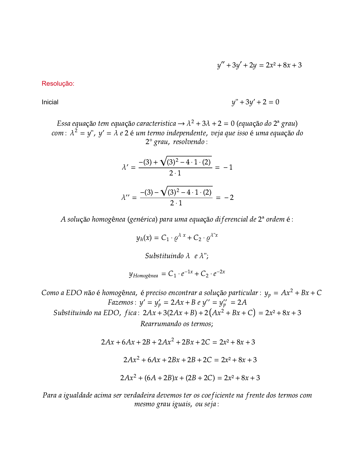 Tiago Lima - Instagram: @professor_disciplinas_exatas • Resolva a equação diferencial linear não homogênea .y′′+ 3y′+ 2y = 2x² + 8x + 3 Resolução: Inicialmente, é preciso encontrar a solução da EDO de 2° ordem: y" + 3y' + 2 = 0 Essa equação tem equação caracteristica 𝜆 + 3𝜆+ 2 = 0 equação do 2ª grau→ 2 ( ) com : 𝜆 = y", y' = 𝜆 e 2 é um termo independente, veja que isso é uma equação do2 2° grau, resolvendo : 𝜆' = = - 1 - 3 + 2 ⋅ 1 ( ) 3 - 4 ⋅ 1 ⋅ 2( )2 ( ) 𝜆'' = = - 2 - 3 - 2 ⋅ 1 ( ) 3 - 4 ⋅ 1 ⋅ 2( )2 ( ) A solução homogênea genérica para uma equação diferencial de 2ª ordem é :( ) y x = C ⋅ 𝜚 + C ⋅ 𝜚h( ) 1 𝜆´x 2 𝜆"x Substituindo 𝜆´ e 𝜆"; y = C ⋅ e + C ⋅ eHomogênea 1 -1x 2 -2x Como a EDO não é homogênea, é preciso encontrar a solução particular : y = Ax + Bx + Cp 2 Fazemos : y' = y' = 2Ax + B e y'' = y'' = 2Ap p Substituindo na EDO, fica : 2Ax + 3 2Ax + B + 2 Ax + Bx + C = 2x² + 8x + 3( ) 2 Rearrumando os termos; 2Ax + 6Ax + 2B + 2Ax + 2Bx + 2C = 2x² + 8x + 32 2Ax + 6Ax + 2Bx + 2B + 2C = 2x² + 8x + 32 2Ax + 6A + 2B x + 2B + 2C = 2x² + 8x + 32 ( ) ( ) Para a igualdade acima ser verdadeira devemos ter os coeficiente na frente dos termos com mesmo grau iguais, ou seja : 2A = 2, 6A + 2B = 8 e 2B + 2C = 3, que resulta no sistema; 2A = 2 6A + 2B = 8 2B + 2C = 3 Resolvendo 2A = 2 A = A = 1→ → 2 2 → 6A + 2B = 8 6 1 + 2B = 8 6 + 2B = 8 2B = 8 - 6 2B = 2 B = B = 1→ ( ) → → → → 2 2 → 2B + 2C = 3 2 1 + 2C = 3 2 + 2C = 3 2C = 3 - 2 2C = 1 C =→ ( ) → → → → 1 2 Para finalizar, devemos somar a solução homogênea com a solução particular e teremos a solução geral da equação diferencial de segunda ordem : y = C ⋅ e +C ⋅ e + x + x+g 1 -1x 2 -2x 2 1 2 (Resposta)