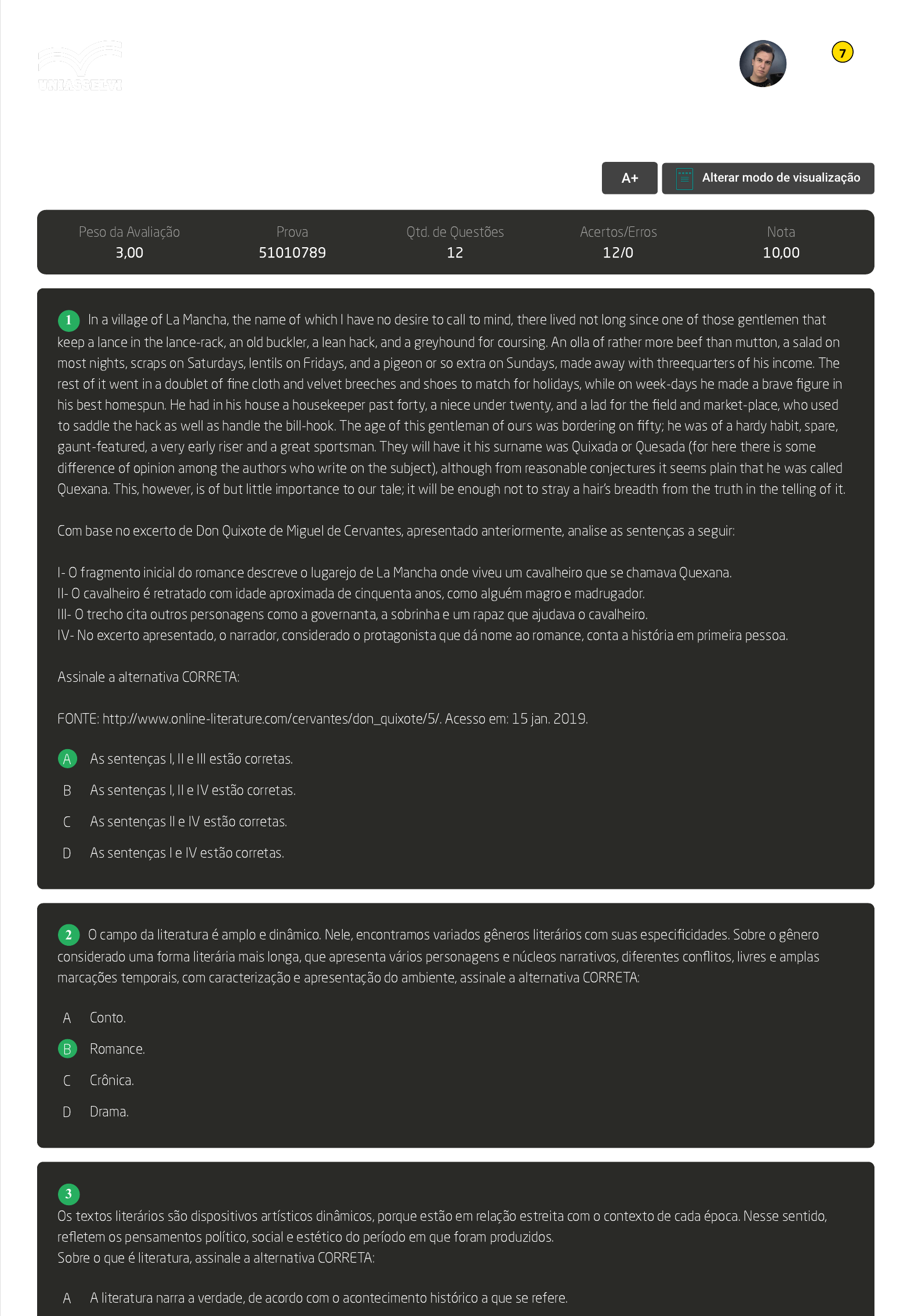 GABARITO | Avaliação Final (Objetiva) - Individual (Cod.:745822) Peso da Avaliação 3,00 Prova 51010789 Qtd. de Questões 12 Acertos/Erros 12/0 Nota 10,00 In a village of La Mancha, the name of which I have no desire to call to mind, there lived not long since one of those gentlemen that keep a lance in the lance-rack, an old buckler, a lean hack, and a greyhound for coursing. An olla of rather more beef than mutton, a salad on most nights, scraps on Saturdays, lentils on Fridays, and a pigeon or so extra on Sundays, made away with threequarters of his income. The rest of it went in a doublet of fine cloth and velvet breeches and shoes to match for holidays, while on week-days he made a brave figure in his best homespun. He had in his house a housekeeper past forty, a niece under twenty, and a lad for the field and market-place, who used to saddle the hack as well as handle the bill-hook. The age of this gentleman of ours was bordering on fifty; he was of a hardy habit, spare, gaunt-featured, a very early riser and a great sportsman. They will have it his surname was Quixada or Quesada (for here there is some difference of opinion among the authors who write on the subject), although from reasonable conjectures it seems plain that he was called Quexana. This, however, is of but little importance to our tale; it will be enough not to stray a hair's breadth from the truth in the telling of it. Com base no excerto de Don Quixote de Miguel de Cervantes, apresentado anteriormente, analise as sentenças a seguir: I- O fragmento inicial do romance descreve o lugarejo de La Mancha onde viveu um cavalheiro que se chamava Quexana. II- O cavalheiro é retratado com idade aproximada de cinquenta anos, como alguém magro e madrugador. III- O trecho cita outros personagens como a governanta, a sobrinha e um rapaz que ajudava o cavalheiro. IV- No excerto apresentado, o narrador, considerado o protagonista que dá nome ao romance, conta a história em primeira pessoa. Assinale a alternativa CORRETA: FONTE: http://www.online-literature.com/cervantes/don_quixote/5/. Acesso em: 15 jan. 2019. A As sentenças I, II e III estão corretas. B As sentenças I, II e IV estão corretas. C As sentenças II e IV estão corretas. D As sentenças I e IV estão corretas. O campo da literatura é amplo e dinâmico. Nele, encontramos variados gêneros literários com suas especificidades. Sobre o gênero considerado uma forma literária mais longa, que apresenta vários personagens e núcleos narrativos, diferentes conflitos, livres e amplas marcações temporais, com caracterização e apresentação do ambiente, assinale a alternativa CORRETA: A Conto. B Romance. C Crônica. D Drama. Os textos literários são dispositivos artísticos dinâmicos, porque estão em relação estreita com o contexto de cada época. Nesse sentido, refletem os pensamentos político, social e estético do período em que foram produzidos. Sobre o que é literatura, assinale a alternativa CORRETA: A A literatura narra a verdade, de acordo com o acontecimento histórico a que se refere. VOLTAR A+ Alterar modo de visualização 1 2 3 Marco Aurelio Reis Martins Formação Pedagógica em Letras - Inglês (3899023) 7 B A literatura vai além do texto escrito e engloba diferentes manifestações. C Literatura não é atividade artística, mas apenas intelectual. D A obra "Beowulf" marca o início da literatura narrativa do Ocidente. No processo da enunciação de um texto literário, o narrador raramente é apresentado e possui características na sua fala que mostram a sua função dentro da narrativa. Leia um trecho do conto The Black Cat, de Edgar Allan Poe e, com base no tipo de narrador presente no texto, assinale a alternativa CORRETA: FOR the most wild, yet most homely narrative which I am about to pen, I neither expect nor solicit belief. Mad indeed would I be to expect it, in a case where my very senses reject their own evidence. Yet, mad am I not -- and very surely do I not dream. But to-morrow I die, and to-day I would unburthen my soul. My immediate purpose is to place before the world, plainly, succinctly, and without comment, a series of mere household events. In their consequences, these events have terrified -- have tortured -- have destroyed me. Yet I will not attempt to expound them. To me, they have presented little but Horror -- to many they will seem less terrible than barroques. Hereafter, perhaps, some intellect may be found which will reduce my phantasm to the common-place -- some intellect more calm, more logical, and far less excitable than my own, which will perceive, in the circumstances I detail with awe, nothing more than an ordinary succession of very natural causes and effects. FONTE: . Acesso em: 14 jan. 2019. A Narrador personagem, que conta a história na primeira pessoa. B Narrador onisciente intruso, com a narração na terceira pessoa. C Narrador observador, que se limita a contar a história, sem se envolver nela. D Narrador observador imparcial, que conta a história na primeira pessoa. A partir da leitura do fragmento literário reproduzido da obra The Canterbury Tales (Os Contos da Cantuária), de Geoffrey Chaucer, analise as sentenças a seguir: The General Prologue When that April with his showers sweet The drought of March has pierced root deep, And bathed each vein with liquor of such power That engendered from it is the flower, When Zephyrus too with his gentle strife, To every field and wood, has brought new life In tender shoots, and the youthful sun Half his course through the Ram has run, And little birds are making melody, Who all the night with open eye do sleep - Nature their hearts in every way so pricks - Then people long to go on pilgrimage, [...] (The Canterbury Tales, by Geoffrey Chaucer) I- Os Contos da Cantuária foram escritos durante a Idade Média, período histórico correspondente ao Middle English. II- A coletânea de contos reúne histórias narradas por viajantes, que se encont