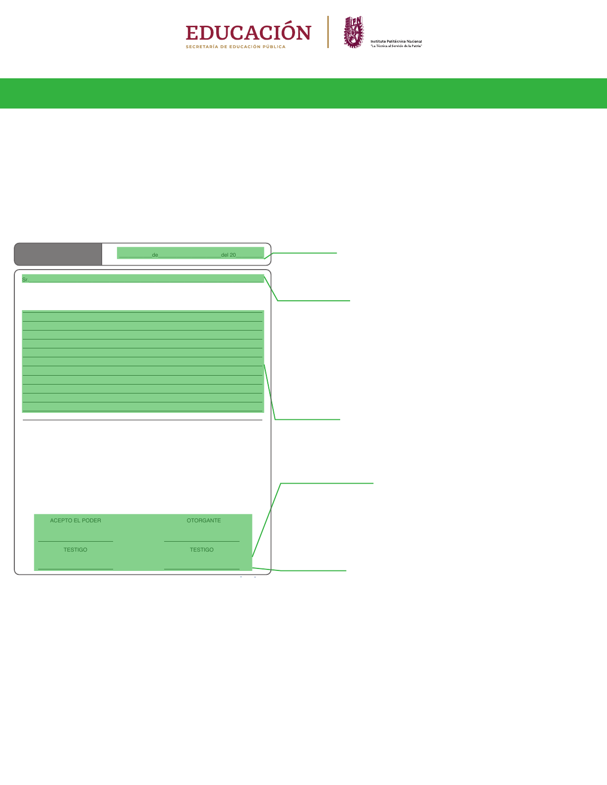 El poder se otorga para recoger documentos académicos (constancias de estudio, baja temporal, baja de�nitiva, Etc.). Realizar trámites escolares (pagos, registro de ETS, carga mínima,Etc). 1.- Lugar y fecha de emisión de la carta poder 2.- Debe ser dirigida a la UPIICSA La carta poder debe contener nombre completo y domicilio del otorgante y de quien recibe el poder; para el caso de los testigos, sólo nombre y �rma. Deberá anexar copias de identi�caciones que contengan fotografías y �rmas de todos los que interviene en este acto. En caso de presentar carta poder simple debe ser individual para gestionar cualquier trámite académico en la UPIICSA REQUISITOS PARA VALIDAR UNA CARTA PODER SIMPLE 3.-La carta poder se presentará en original y copia, no se aceptan escaneadas, fotocopiadas o en celular. 4.-Se debe entregar una carta poder simple por cada trámite o gestión 5.-La carta poder se debe exhibir con �rma original, lo más parecida a la que se muestra en la identi�ca- ción o�cial. 6.-Presentar identi�caciones originales o�ciales para su cotejo: (IFE, INE, pasaporte, cédula profesional, cartilla militar) de todos los que intervienen en la carta poder. www.ipn.mx Carta Poder ___________de_____________________del 20_________ Sr.______________________________________________________________________________ P R E S E N T E Por la presente________________________ al Sr.________________________________________ poder amplio, cumplido y bastante para que a _______________________ nombre y representación y así mismo para que conteste las demandas y recomendaciones que se entablan en mi contra, o ponga excepciones dilatorias y perentorias, rinda toda clase de pruebas, reconozca firmas y documentos, redarguya de falsos a los que se presenten por la contraria, presente testigos, vea protestar a los de la contraria y los represente y tache, articule y absuelva posiciones, recuse Jueces superiores o inferiores, oiga asuntos interlocutorios y definitivos, consienta de los favorables y pida revocación por contrario imperio, apele, interponga el recurso de amparo y se desista de los que interponga, pida aclaración de las sentencias, ejecute, embargue y me represente en los embargos que contra mí se decreten, pida el remate de los bienes embargados, nombre peritos y acuse a los de la contraria, asista a almonedas, transe este juicio, perciba valores y otorgue recibos y cartas de pago, someta el presente juicio a la decisión de los Jueces, árbitros y arbitradores, gestione el otorgamiento de garantías, y en fin, para que promueva todos los recursos que favorezcan mis derechos, así como para que sustituya este poder ratificando desde hoy todo lo que haga sobre este particular. ACEPTO EL PODER TESTIGO TESTIGO OTORGANTE Otorgo