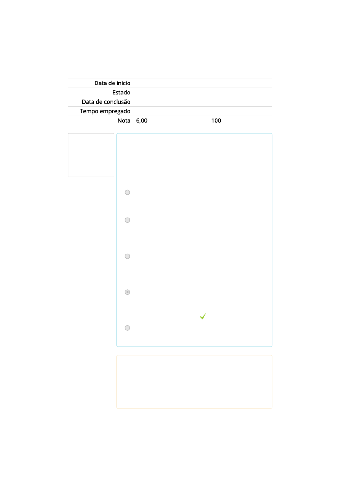 Impresso por Rafael Mello, E-mail rafael.mello.silva@hotmail.com para uso pessoal e privado. Este material pode ser protegido por direitos autorais e não pode ser reproduzido ou repassado para terceiros. 30/11/2022 23:08:58 Questão 1 Correto Atingiu 0,60 de 0,60 Estratégias e Medidas de Desempenho em Supply Chain ► AVALIAÇÃO PROVA► quinta, 8 Jul 2021, 12:32 Finalizada quinta, 8 Jul 2021, 13:11 38 minutos 23 segundos de um máximo de 6,00( %) A abordagem proposta por Sink e Tuttle (1993) mostra que, um conjunto de critérios de desempenho de qualidade. Sobre a abordagem de Sink e Tuttle, é correto armar que: Escolha uma: a. Os critérios de desempenho de qualidade são: produtividade, qualidade, qualidade de vida no trabalho, inovação e lucratividade. b. Os critérios de desempenho de qualidade são: produtividade, eciência, qualidade, qualidade de vida no trabalho, inovação e lucratividade. c. Os critérios de desempenho de qualidade são: eciência, produtividade, qualidade, ecácia, qualidade de vida no trabalho, inovação e procedimentos. d. Os critérios de desempenho de qualidade são: eciência, produtividade, qualidade, ecácia, qualidade de vida no trabalho, inovação e lucratividade. e. Nenhuma das alternativas está correta Sua resposta está correta. A resposta correta é: Os critérios de desempenho de qualidade são: eciência, produtividade, qualidade, ecácia, qualidade de vida no trabalho, inovação e lucratividade.. Impresso por Rafael Mello, E-mail rafael.mello.silva@hotmail.com para uso pessoal e privado. Este material pode ser protegido por direitos autorais e não pode ser reproduzido ou repassado para terceiros. 30/11/2022 23:08:58 Questão 2 Correto Atingiu 0,60 de 0,60 As aplicações propostas por Bowersox e Closs (2001) apresentam uma estrutura que devem ser criadas nos indicadores de resultado e indicadores de tendência (diagnóstico) para monitorar o seu desempenho. Sobre a aplicação proposta por Bowersox e Closs, é correto armar que: Escolha uma: a. Direcionamento das operações logísticas que são projetadas para motivar pessoal. Quando essas medidas direcionadoras são utilizadas, excede o estabelecido pelos padrões existe esta medida para restabelecer a conformidade. b. Nenhuma das alternativas está correta c. Monitoramento das medidas que acompanham o desempenho histórico do sistema logístico excede o estabelecido pelos padrões existe esta medida para restabelecer a conformidade. d. Medidas de controle que são utilizadas para aprimorar um processo logístico. Quando algo excede o estabelecido pelos padrões existe esta medida para restabelecer a conformidade. e. Medidas de controle que são utilizadas para aprimorar um processo logístico. Quando o sistema logístico para que a empresa e os clientes sejam mantidos informados Sua resposta está correta. A resposta correta é: Medidas de controle que são utilizadas para aprimorar um processo logístico. Quando algo excede o estabelecido pelos padrões existe esta medida para restabelecer a conformidade. . Impresso por Rafael Mello, E-mail rafael.mello.silva@hotmail.com para uso pessoal e privado. Este material pode ser protegido por direitos autorais e não pode ser reproduzido ou repassado para terceiros. 30/11/2022 23:08:58 Questão 3 Correto Atingiu 0,60 de 0,60 A cadeia de suprimento tem a função de gerenciar os controles dos uxos dos produtos e serviços e, por isso, é o coração do negócio para as empresas. Sobre os conceitos da estratégia logística na cadeia de suprimentos, é correto armar que: Escolha uma: a. A estratégia logística de suprimento exerce papel fundamental na integração nas metodologias, ferramentas, técnicas de gestão e no desempenho entre as empresas para garantir uma relação de saída, produtividade e principalmente lucratividade para os envolvidos. b. A gestão da cadeia de suprimentos vem se tornando cada vez mais importante nos serviços de empresas com capital aberto. c. Nenhuma das alternativas está correta. d. A estratégia logística de suprimento exerce papel fundamental na integração nas metodologias, ferramentas, técnicas de gestão, mas não se preocupa diretamente com o desempenho entre as empresas. e. A estratégia logística de suprimentos inclui, além de conhecimento mercadológico, consideração somente do processo. Sua resposta está correta. A resposta correta é: A estratégia logística de suprimento exerce papel fundamental na integração nas metodologias, ferramentas, técnicas de gestão e no desempenho entre as empresas para garantir uma relação de saída, produtividade e principalmente lucratividade para os envolvidos. . Impresso por Rafael Mello, E-mail rafael.mello.silva@hotmail.com para uso pessoal e privado. Este material pode ser protegido por direitos autorais e não pode ser reproduzido ou repassado para terceiros. 30/11/2022 23:08:58 Questão 4 Correto Atingiu 0,60 de 0,60 No modelo proposto por Sink e Tuttle (1993), os seus principais parâmetros para a empresa são compostos por um sistema organizacional complexo inter-relacionado que considera: a visão, os princípios, a missão, os recursos, os produtos e os serviços gerados. Em relação ao modelo de Sink e Tuttle, leia as assertivas a seguir. I. O grau de produtividade no modelo de Sink e Tuttle estabelece uma medida operacional pela relação entre resultados obtidos e previstos. II. Para obter qualidade nos processos deve-se estar associada ao consumo de recursos e pode ser visualizada no lado referente aos inputs, ou seja, em suas entradas para o processo. III. Produtividade pode ser expressa diretamente pela relação de quantidade de entregas (resultados) pela quantidade de recurso que são necessários para que essas entregas ocorram. IV. A criatividade ou inovação também é um parâmetro de desempenho que guarda relações com o terceiro ponto de vericação de qualidade. Assinale a alternativa que apresenta as alternativa corr