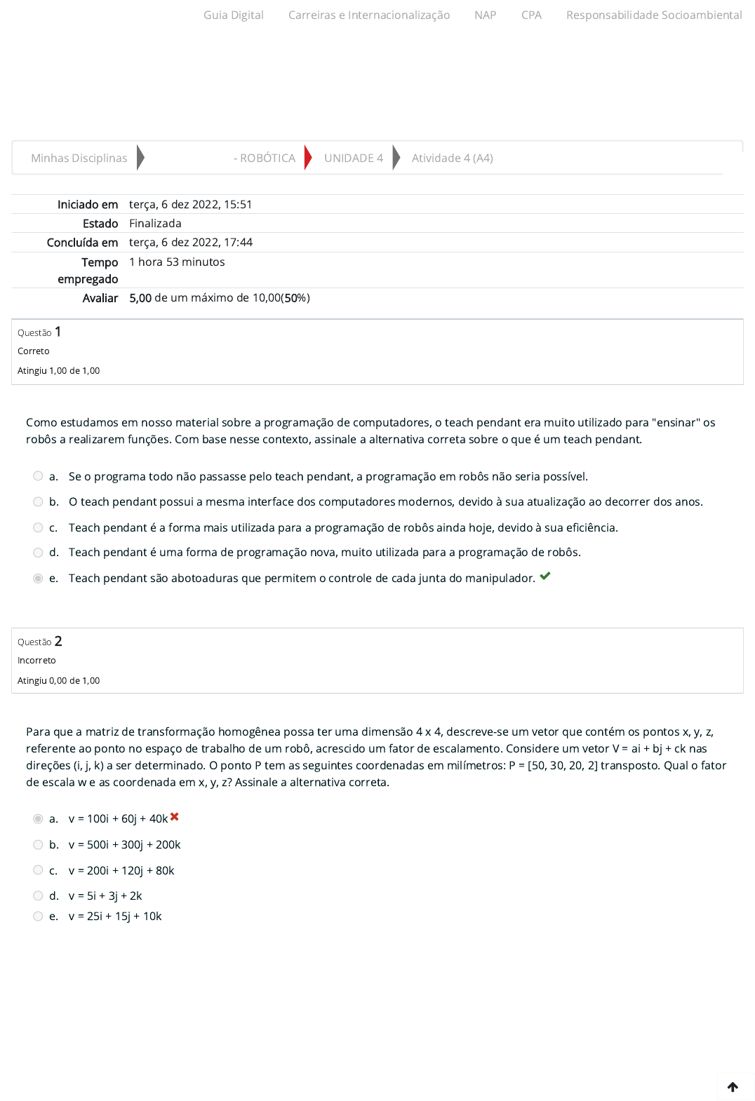 Minhas Disciplinas 222RGR3002A - ROBÓTICA UNIDADE 4 Atividade 4 (A4) Iniciado em terça, 6 dez 2022, 15:51 Estado Finalizada Concluída em terça, 6 dez 2022, 17:44 Tempo empregado 1 hora 53 minutos Avaliar 5,00 de um máximo de 10,00(50%) Questão 1 Correto Atingiu 1,00 de 1,00 Questão 2 Incorreto Atingiu 0,00 de 1,00 Como estudamos em nosso material sobre a programação de computadores, o teach pendant era muito utilizado para "ensinar" os robôs a realizarem funções. Com base nesse contexto, assinale a alternativa correta sobre o que é um teach pendant. a. Se o programa todo não passasse pelo teach pendant, a programação em robôs não seria possível. b. O teach pendant possui a mesma interface dos computadores modernos, devido à sua atualização ao decorrer dos anos. c. Teach pendant é a forma mais utilizada para a programação de robôs ainda hoje, devido à sua e�ciência. d. Teach pendant é uma forma de programação nova, muito utilizada para a programação de robôs. e. Teach pendant são abotoaduras que permitem o controle de cada junta do manipulador. Para que a matriz de transformação homogênea possa ter uma dimensão 4 x 4, descreve-se um vetor que contém os pontos x, y, z, referente ao ponto no espaço de trabalho de um robô, acrescido um fator de escalamento. Considere um vetor V = ai + bj + ck nas direções (i, j, k) a ser determinado. O ponto P tem as seguintes coordenadas em milímetros: P = [50, 30, 20, 2] transposto. Qual o fator de escala w e as coordenada em x, y, z? Assinale a alternativa correta. a. v = 100i + 60j + 40k b. v = 500i + 300j + 200k c. v = 200i + 120j + 80k d. v = 5i + 3j + 2k e. v = 25i + 15j + 10k Guia Digital Carreiras e Internacionalização NAP CPA Responsabilidade Socioambiental https://ambienteacademico.com.br/my/ https://ambienteacademico.com.br/course/view.php?id=18110 https://ambienteacademico.com.br/course/view.php?id=18110§ion=5 https://ambienteacademico.com.br/mod/quiz/view.php?id=498291 https://codely-fmu-content.s3.amazonaws.com/Moodle/GuiaDigital/Guia+digital/index.html https://informa.fmu.br/carreiras/ https://codely-fmu-content.s3.amazonaws.com/Moodle/NAP/inicial/nap/fmu/index.html https://codely-fmu-content.s3.amazonaws.com/Moodle/CPA/landing_CPA/index.html https://portal.fmu.br/sustentabilidade Questão 3 Correto Atingiu 1,00 de 1,00 Um robô cartesiano, também chamado prismático, encontra-se nas coordenadas (x=100, y=200, z=300), cujas unidades estão em mm. Determine a nova posição do robô para um deslocamento linear de avanço de 400 mm, nas direções X e Z. a. X = 100, y = 200 e z = 300 b. X = 500, y = 200 e z = 300 c. X = 500, y = 200 e z = 700 d. X = -300, y = 200 e z = 300 e. X = 500, y = 0 e z = 700 Guia Digital Carreiras e Internacionalização NAP CPA Responsabilidade Socioambiental https://codely-fmu-content.s3.amazonaws.com/Moodle/GuiaDigital/Guia+digital/index.html https://informa.fmu.br/carreiras/ https://codely-fmu-content.s3.amazonaws.com/Moodle/NAP/inicial/nap/fmu/index.html https://codely-fmu-content.s3.amazonaws.com/Moodle/CPA/landing_CPA/index.html https://portal.fmu.br/sustentabilidade Questão 4 Incorreto Atingiu 0,00 de 1,00 Na cinemática inversa, um movimento de translação de um robô industrial está relacionado a um avanço ou um recuo de um elo do robô, como em um robô de coordenadas cartesianas. A �gura a seguir mostra esse movimento em dois sistemas de referência: A e B. Fonte: CRAIG, 2019. p. 23. CRAIG, J. J. Robótica. 3. ed. São Paulo: Pearson Education do Brasil, 2012. Disponível em: https://plataforma.bvirtual.com.br/Leitor/Publicacao/3386/pdf/0. Acesso em: 04 jun. 2022. Conforme a �gura, para representar o ponto “P”, no referencial A, é preciso saber quais informações? Assinale a alternativa correta. a. A coordenada no sistema de referência A até ponto P, somada à coordenada do ponto P no sistema de referência B. b. O ângulo de deslocamento em conjunto com relação ao referencial B, com a soma algébrica referente ao deslocamento ocorrido em A. c. O ângulo de deslocamento em conjunto com relação ao referencial A, com a soma algébrica referente ao deslocamento ocorrido em B. d. A distância do ponto P em relação a origem de B, com a soma algébrica da distância do ponto em relação ao referencial A. e. A coordenada do ponto B em relação ao referencial B, somada à distância da origem do sistema de referência B em relação ao referencial A. Guia Digital Carreiras e Internacionalização NAP CPA Responsabilidade Socioambiental https://plataforma.bvirtual.com.br/Leitor/Publicacao/3386/pdf/0 https://codely-fmu-content.s3.amazonaws.com/Moodle/GuiaDigital/Guia+digital/index.html https://informa.fmu.br/carreiras/ https://codely-fmu-content.s3.amazonaws.com/Moodle/NAP/inicial/nap/fmu/index.html https://codely-fmu-content.s3.amazonaws.com/Moodle/CPA/landing_CPA/index.html https://portal.fmu.br/sustentabilidade Questão 5 Correto Atingiu 1,00 de 1,00 Questão 6 Incorreto Atingiu 0,00 de 1,00 As garras e os acessórios são componentes extremamente úteis aos robôs, e, por meio deles, é possível adicionar utilidade ao serviço robótico. Sobre garras e ferramentas, assinale a alternativa correta. a. As garras podem pegar objetos com maior precisão graças aos sensores infravermelhos que elas possuem. b. Garras com movimentos hidráulicos são as mais utilizadas pelos robôs. c. As garras são os mecanismos que fazem o robô se mover, pois elas têm articulações responsáveis por esse movimento. d. As garras são uma parte desnecessária para as funções dos robôs. e. Dentre os três modelos de garras, as pneumáticas são as mais fracas, já que são movidas pela pressão do ar. Leia o trecho a seguir: A cinemática inversa consiste na determinação dos movimentos de translação e rotação de um robô manipulador. Essa determinação está normalmente relacionada à estrutura mecânica do robô industrial. Nesse sentido, é import