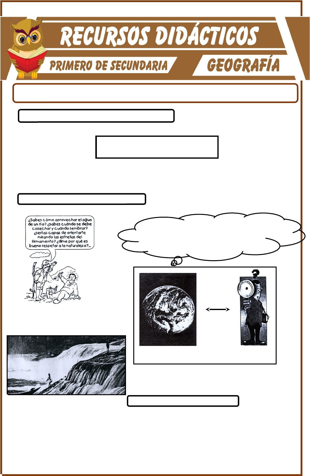 www.RecursosDidacticos.org GEOGRAFÍA 1. Concepto Etimológico de “Geografía” La palabra Geografía proviene de dos voces griegas : Geo = GEA = TIERRA Graphos = GRAFÍA = DESCRIPCIÓN Precisamente, la Geografía en sus inicios no era más que sólo estudios descriptivos regionales, sin ningún espíritu crítico ni de explicación de fenómenos. 2. Concepto Actual de Geografía En la actualidad se le conceptúa a la Geografía como: “La ciencia que estudia las interrelaciones entre el hombre y su medio ambiente, en donde éste actúa primero”. ___________ ___________ Fig. A 3. Evolución de la GeografíaNaturaleza y hombre. La geografía intenta descifrar la relación entre ambos. La Geografía es una de las disciplinas científicas que más ha desarrollado desde sus inicios, siendo otro de los grandes “aportes griegos”, que en la actualidad es de vital importancia para el hombre. Pero. Los primeros grupos humanos en su necesidad de buscar alimento tuvieron que desplazarse, convirtiéndose de esta forma en geógrafos intuitivos. Geografía Edad Contemporánea Edad Media Edad Antigua Edad Contemporánea Edad Moderna En sus inicios, se pensaba que la función del geógrafo era aquél que conocía los lugares, identificándolos y describiéndolos. En lo que perduro por mucho tiempo. En el Renacimiento, se produjo un nuevo despertar de la geografía lo cual permitió al hombre, conocer nuevos lugares, y así incrementar los conocimientos sobre su medio. Esto obligó a repensar la forma de nuestro planeta, y se formularon nuevas teorías intentando explicar su forma. Así se estableció una división de la geografía y una nueva forma de estudiar los fenómenos geográficos. Representantes: · Hecateo de Mileto “Padre de la Geografía”. · Eratóstenes · Hiparlo · Aristarco de Samos La geografía, al igual que otras ciencias, sufrió un retroceso, un “período de oscurrantismo”, pues la concepción teocéncrica dominaba las opiniones sobre todas las disciplinas (Europa). Cosa muy distinta sucede con los conocimientos geográficos desarrollados por los Árabes, que a pesar que fue descriptiva permitió un conocimiento real sobre la Tierra. Representantes: · Magallanes y Elcano · Sebastián Munster · Verenius · James Cook La geografía va llegando a su madurez por el progreso científico general, por el avance de las ciencias naturales por los grandes viajes de exploración. Es en el siglo XVIII que aparecen las figuras de: Representantes: · Alexander Von Humboldt (Padre de la Geografía Física). · Kart Von Ritter. · Vidal de la Blache · Richthofen · De Martonne · Pierre George Representantes: · San Isidoro de Sevilla · Erick – El Rojo · Abúl – Fida · Marco Polo La primera referencia escrita sobre geografía, que se conserva, relata las expediciones al Sinaí hechas por el faraón egipcio SNEFRU, hacia el año 2 700 a.C. y el relato del primer viaje transpacífico realizado por los chinos fue redactado en el año 2 200 a.C. por el ministro Yu bajo orden del emperador Shan: “SHAN HAIKING” (Documento geográfico más antiguo). ¿Sabías qué?... TAREA DOMICILIARIA 1. Completa el siguiente mapa conceptual sobre la definición actual de Geografía : es la que la entre _________ 2. Observa y lee la figura “A”. Escribe ¿por qué es importante la Geografía? Puedes ayudarte de un libro de Geografía. _________________________________________________________________________ __________________________________________________________________________________ __________________________________________________________________________________ 3. ¿Cuál fue la función del geógrafo durante la Edad Antigua? _____________________________________ __________________________________________________________________________________ 4. ¿A quién se le considera el “Padre de la Geografía”? ___________________________________________ 5. Durante la Edad Moderna, ¿qué pasó con la Geografía? _________________________________________ __________________________________________________________________________________ 6. ¿Quiénes fueron los primeros en dar la vuelta al mundo durante la Edad Moderna? ____________________ __________________________________________________________________________________ 7. ¿Qué sucedió durante la Edad Media con la Geografía? ________________________________________ ____________________________________________________________ Mientras que con los árabes : __________________________________________________________________________________ __________________________________________________________________________________ 8. Averigua y anota en tu cuaderno, ¿quién fue Marco Polo? 9. Ahora en la Edad Contemporánea, ¿qué pasa con la Geografía? ___________________________________ __________________________________________________________________________________ __________________________________________________________________________________ __________________________________________________________________________________ 10. Investiga y anota en tu cuaderno, ¿quién fue Alejandro Von Humboldt y por qué es importante? 11. A continuación lee cada ejemplo, identifica y escribe a qué principio geográfico se refiere : a) La población del Perú según el censo de 1940, era en su mayoría rural (64,6%) y en el censo de 1998 comprende sólo el 28,1 del total. b) El Perú se encuentra ubicado en la parte central y occidental de América del Sur y tiene una extensión de 1’285,215.60 km2. c) Para entender la migración en el Perú y su impacto en el medio geográfico, se deben analizar los aspectos políticos, económicos, sociales, culturales, etc. d) La geografía de los EE.UU. y de Rusia tienen semejanzas y diferencias que se pueden estudiar. e) Los movimientos sísmicos tienen su origen por acomodamiento de las placas tectónicas, vulcanismo, pruebas nucleares, etc. 12. Observa y lee detenidamente las escenas de la figura