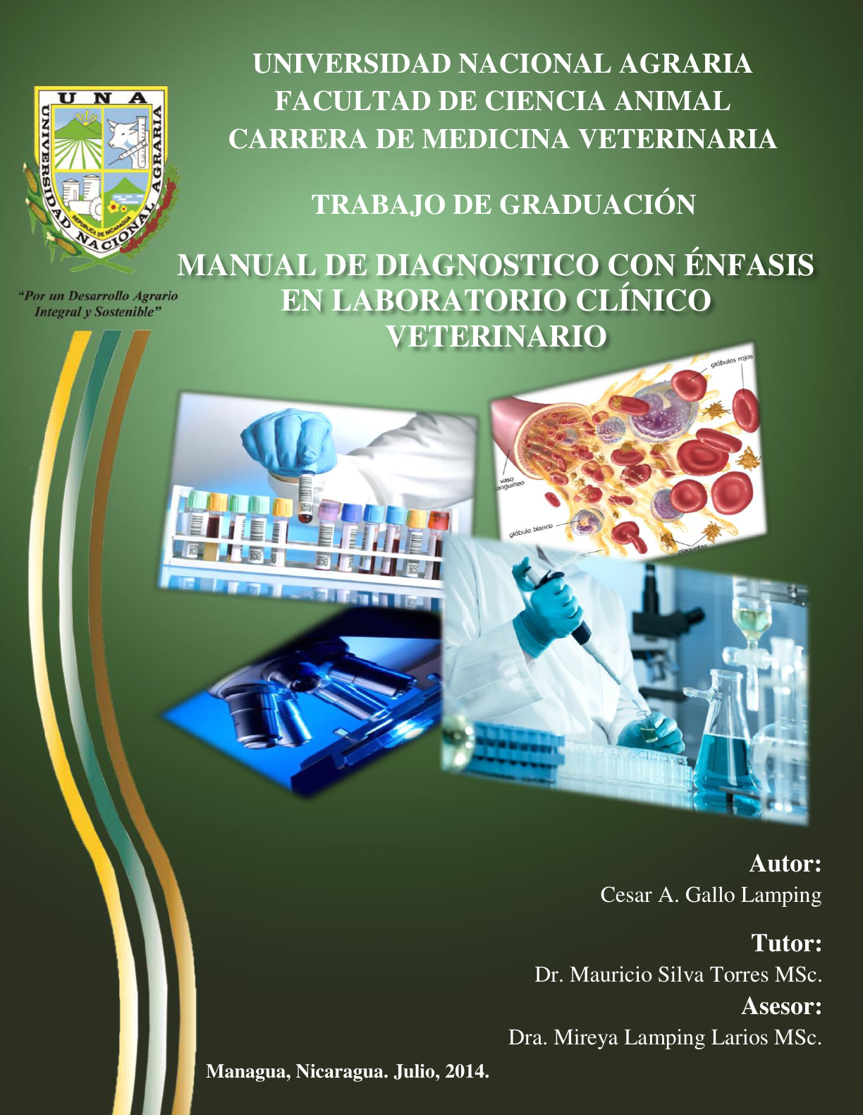 UNIVERSIDAD NACIONAL AGRARIA FACULTAD DE CIENCIA ANIMAL CARRERA DE MEDICINA VETERINARIA TRABAJO DE GRADUACIÓN MANUAL DE DIAGNOSTICO CON ÉNFASIS EN LABORATORIO CLÍNICO VETERINARIO Autor: Cesar A. Gallo Lamping Asesor: Dra. Mireya Lamping Larios MSc. Tutor: Dr. Mauricio Silva Torres MSc. Managua, Nicaragua. Julio, 2014. UNIVERSIDAD NACIONAL AGRARIA FACULTAD DE CIENCIA ANIMAL CARRERA DE MEDICINA VETERINARIA TRABAJO DE GRADUACIÓN MANUAL DE DIAGNOSTICO CON ÉNFASIS EN LABORATORIO CLÍNICO VETERINARIO Autor: Cesar A. Gallo Lamping Asesor: Dra. Mireya Lamping Larios MSc. Tutor: Dr. Mauricio Silva Torres MSc. Managua, Nicaragua. Julio, 2014. Título de la Obra: Manual de Diagnostico con Énfasis en Laboratorio Clínico Veterinario Autor: Cesar A. Gallo Lamping Tutor: Dr. Mauricio D. Silva Torres MSc. Responsable del Área Clínica Facultad de Ciencia Animal Universidad Nacional Agraria Asesor: Dra. Mireya S. Lamping Larios MSc. Responsable del Área de Ciencias Morfológicas Jefe del Departamento de Medicina Veterinaria Facultad de Ciencia Animal Universidad Nacional Agraria Revisores: Dra. Marlen Lacayo de Mora MSc. Directora del Laboratorio Clínico Centro de Diagnóstico Veterinario “Las Colinas Sur” Dr. José Antonio Sánchez Garache MSc. Médico Veterinario - Virólogo Clínica Veterinaria “Arca de Noé” Dra. Nohemí del Socorro Pineda Sáenz MSc. Directora del Laboratorio de Diagnostico Veterinario y Microbiología de los Alimentos – Ministerio de Agricultura y Ganadería (MAG) Carrera de Medicina Veterinaria - Facultad de Ciencia Animal - Universidad Nacional Agraria Primera Edición en Español, 2014 Impreso en Managua, Nicaragua *Todos los derechos reservados Se propicia la amplia diseminación de este material impreso o electrónico. Sin embargo se prohíbe la modificación parcial o total de este material sin el consentimiento previo del autor. DEDICATORIA A el Eterno Dios, por haberme dado la bendición más grande que es la vida; así como también la sabiduría, el entendimiento y la perseverancia necesaria para superar cada uno de los obstáculos; logrando así, el haber terminado mi formación profesional como Médico Veterinario. A mis Padres, Dra. Mireya S. Lamping Larios MSc. y Lic. Felipe M. Gallo Castillo por todo su amor, cariño, comprensión y dedicación, el haberme formado en los valores éticos y morales; así como también, por estar siempre a mi lado apoyándome y guiándome durante todo el camino. A mi Tutor, Dr. Mauricio D. Silva Torres MSc., al guiarme durante todo el proceso de elaboración de este Trabajo de Graduación, por su valiosa apoyo y consejos, principalmente por su paciencia para conmigo. Por compartir sus conocimientos clínicos y motivación en la importancia del Diagnóstico Clínico Laboratorial. En Memoria, del Dr. Otilio González Obando MSc. Q.E.P.D., Miembro Fundador de la Facultad de Ciencia Animal y la Carrera de Medicina Veterinaria; que con su tenacidad y empeño por el desarrollo de la carrera, facilito la formación de profesionales Nicaragüenses, que atendiesen la salud animal en nuestro país. Cesar Adonis Gallo Lamping AGRADECIMIENTOS Agradezco a la Universidad Nacional Agraria, a todas las Autoridades que dirigen esta Institución; así como a todos y cada uno de los Docentes que me impartieron las diferentes asignaturas durante el desarrollo del pensum de la carrera de Medicina Veterinaria. A mi Tutor el Dr. Mauricio Silva Torres MSc. por sus conocimientos clínicos y de diagnóstico, sus consejos, su sinceridad, profesionalismo; así como por su disposición incondicional de enseñarme y conducirme durante este trayecto como profesional, hasta haber culminado este Trabajo de Graduación. De forma especial quiero agradecer a la Dra. Mireya Lamping Larios MSc., quien no solo es mi Asesora, sino también mi Madre, la cual es fuente de inspiración y de orgullo. Una persona dedicada y la cual me ha motivado siempre a seguir adelante, superando cada obstáculo que pueda presentarse; desarrollando en mí, fuertes valores espirituales, morales y éticos. Agradezco a mi Padre el Lic. Felipe Gallo Castillo, quien con su fuerte convicción y tenacidad, su profesionalismo; me sirvieron de ejemplo para ser el hombre que soy ahora. A mi novia y colega, quien me brindo siempre todo su apoyo y paciencia; una mujer incondicional y admirable, la cual siempre me motivo a ser cada día mejor. Un agradecimiento especial a mis Revisores la Dra. Marlen Lacayo MSc., la Dra. Nohemí Pineda MSc. y el Dr. Antonio Sánchez MSc.; por el tiempo que dedicaron a la revisión de este Trabajo de Culminación, así como los valiosos aportes, acertadas sugerencias, que permitieron fortalecer la escritura de este Manual. Igualmente deseo expresar, una sentida y profunda gratitud compañeros de la Universidad, quienes además de brindarme su amistad, me alentaron siempre a seguir adelante. A todas aquellas personas que de una u otra manera me han apoyado, les agradezco inmensamente el tiempo compartido, la dedicación y conocimiento que me brindaron para la culminación de este Trabajo de Graduación. Cesar Adonis Gallo Lamping INDICE Introducción 1 Capitulo I. Introducción al Laboratorio Clínico Veterinario 3 1.1. Generalidades 3 1.2. Infraestructura del Laboratorio 4 1.3. Buenas Practicas de Laboratorio 7 Capitulo II. Extracción, Conservación y Remisión de Muestras 20 2.1. Muestras de Sangre 20 2.2. Muestras de Orina 31 2.3. Muestras de Piel 36 2.4. Muestras de Material Fecal 37 2.5. Remisión de Muestras 38 Capitulo III. Hematología en Mamíferos 40 3.1. Generalidades 40 3.2. Frotis Sanguíneo 42 3.2.1. Preparación del Frotis Sanguíneo 42 3.2.2. Tinción del Frotis Sanguíneo 45 3.2.3. Estudio del Frotis Teñido 48 3.3. Serie Roja 49 3.3.1. Generalidades 49 3.3.2. Evaluación Laboratorial de los Eritrocitos 52 3.3.3. Alteraciones de la Serie Roja 59 3.4. Serie Blanca 77 3.4.1. Generalidades 77 3.4.2. Evaluación Laboratorial de los Leucocitos