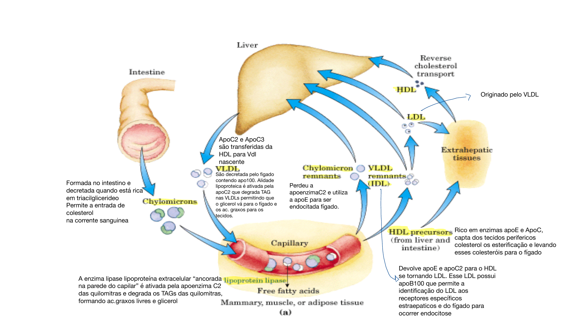 Resumo do metabolismo das lipoproteínas Formada no intestino e decretada quando está rica em triacilglicerideo Permite a entrada de colesterol na corrente sanguinea Perdeu a apoenzimaC2 e utiliza a apoE para ser endocitada fígado. A enzima lipase lipoproteína extracelular “ancorada na parede do capilar” é ativada pela apoenzima C2 das quilomitras e degrada os TAGs das quilomitras, formando ac.graxos livres e glicerol ApoC2 e ApoC3 são transferidas da HDL para Vdl nascente São decretada pelo figado contendo apo100. Alidade lipoproteica é ativada pela apoC2 que degrada TAG nas VLDLs permitindo que o glicerol vá para o fígado e os ac. graxos para os tecidos. Rico em enzimas apoE e ApoC, capta dos tecidos perifericos colesterol os esterificação e levando esses colesteróis para o fígado Devolve apoE e apoC2 para o HDL se tornando LDL. Esse LDL possui apoB100 que permite a identificação do LDL aos receptores específicos estraepaticos e do fígado para ocorrer endocitose Originado pelo VLDL - !