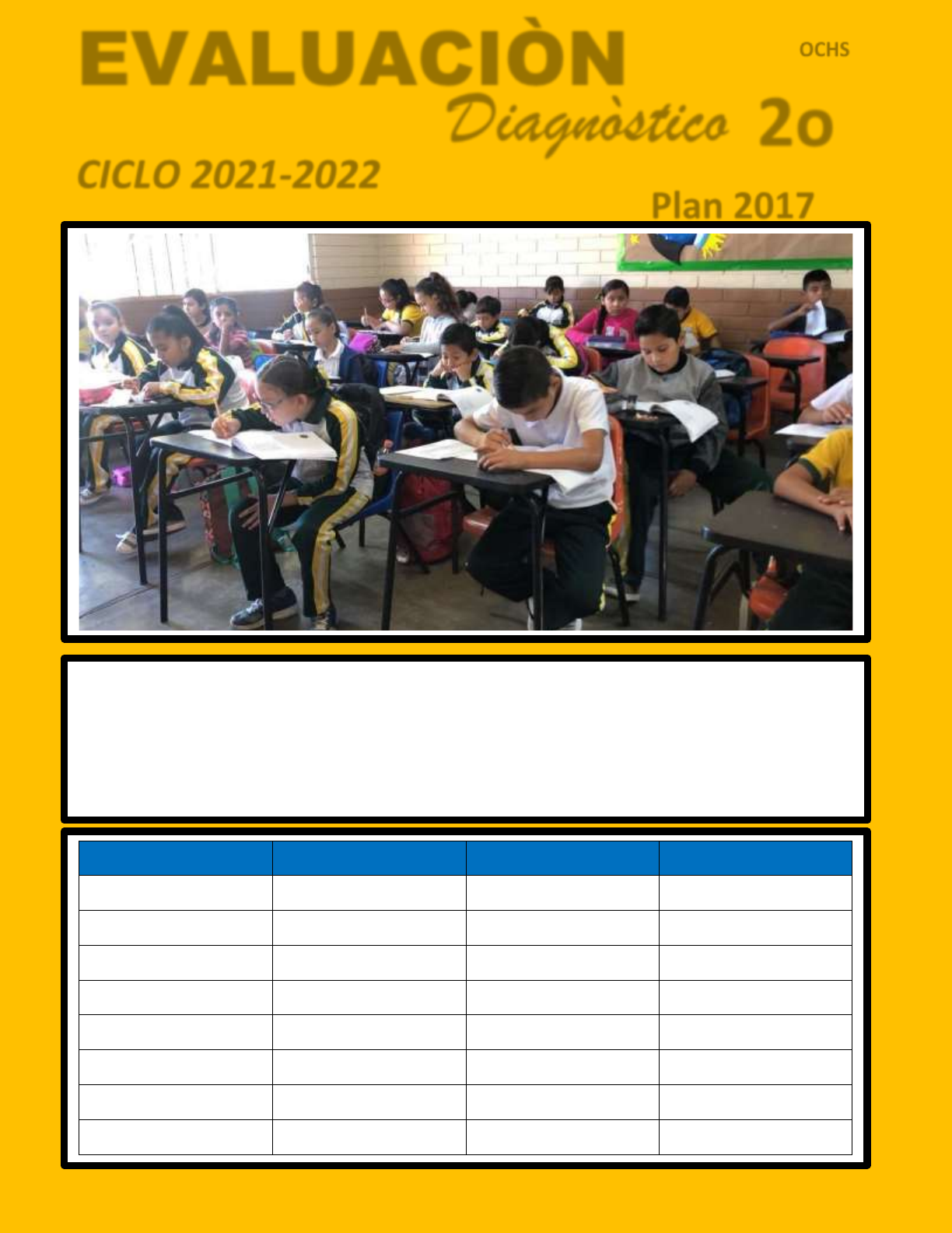 EVALUACIÒN Diagnòstico 2o CICLO 2021-2022 Plan 2017 ALUMNO:__________________________________________________________________________________ ESCUELA: __________________________________________________________________________________ GRADO: __________________________ GRUPO: ___________________________ NOMBRE DEL MAESTRO: _____________________________________________________________________ MATERIA REACTIVOS ACIERTOS CALIFICACION ESPAÑOL 20 INGLES 20 MATEMATICAS 20 BIOLOGIA 20 GEOGRAFIA 20 HISTORIA 20 FORMACION CIVICA 20 TOTAL 140 OCHS OCHS 1 EXAMEN Diagnostico 2o CICLO 2021-2022 1. ¿Qué opción contiene el nombre de la característica de los relatos de ciencia ficción que se escribe a continuación? Tiene la particularidad de que, aunque en un inicio se brindó importancia al ser humano el personaje de una narración de ciencia ficción puede ser cualquiera que se adapte a los lineamientos de la ciencia ficción (un ser extraterrestre, un robot o computadora, un animal con capacidades de interacción, etc.) a) Presencia de personajes ficticios o aún no existentes b) Versatilidad geográfica c) Capacidad de continuidad d) Existencia de tecnologías ficticias o aún por desarrollar Lee las siguientes opciones I. La creación de situaciones de encierro o riesgo en las que los protagonistas se sienten a merced de los acontecimientos. II. Abundancia de descripciones, que producen suspenso. III. La aparición de un agente desconocido (seres humanos, animales, plantas, objetos, etc.) que sale de control y pone en peligro a los personajes. IV. La aparición de un agente desconocido (monstruos, fantasmas, seres extraterrestres, etc. que amenaza la seguridad de los protagonistas y los coloca en un estado de indefensión 2. ¿Cuál es la opción que no señala una temática de los relatos de terror? a) I b) III c) IV d) II Lee el siguiente texto………. “Con la felicidad, olvidé el estuche, o lo perdí, inadvertidamente. No puedo saberlo. Ahora que la dicha terminó, no encuentro el punto final por ningún lado” (punto final) 3. Según el texto anterior, ¿qué tipo de narrador se utiliza? a) Testigo b) Protagonista c)Personaje secundario d) Omnisciente 4. El _________________ consiste básicamente en el escenario o espacio en el que se mueven los personajes y donde ocurre la acción de nuestra historia a) Ambiente narrativo b) Ambiente socioeconómico c) Ambiente físico d) Ambiente psicológico 5. ¿Qué elemento básico de un relato se describe a continuación? Todo lo relacionado con el período en el que situamos la historia. Puede abarcar desde el pasado más lejano hasta el futuro propio de las novelas de ciencia ficción o del género fantástico a) Época b) Lugar c) Duración d) Otros elementos 6. ¿Qué nombre recibe el conjunto de reglas que posee una estructura de orden, dándoles igualdad y parcialidad a todas las personas involucradas en este? a) Carta b) Reglamento c)Cuestionario d)Ley 7. La función de un reglamento es……… a) Comprender el uso de reglas, así como corregir las leyes b) Proteger derechos, determinar obligaciones y establecer sanciones c) Establecer criterios de trabajo para mejorar la economía d) Regular la conducta de los visitantes de una comunidad ESPAÑOL OCHS 2 EXAMEN Diagnostico 2o CICLO 2021-2022 8. ¿Qué opción señala el orden correcto para recabar la información sobre un tema de investigación? I. Compartir con el grupo la información II. Seleccionar el tema de la exposición III. Consultar en fuentes de información IV. Registrar en fichas la información recabada a) II, IV, I, III b) IV, III, II, I c) I, II, III, IV d) II, III, IV, I 9. Es una narración breve que relata una secuencia de hechos ficticios a partir de un acontecimiento específico, con pocos personajes, las características anteriores pertenecen a: a) La novela b) El cuento c) La revista d) La Leyenda 10. ¿Cuáles son las temáticas que tratan los relatos de ciencia ficción respecto al tiempo? a) Temáticas que reflejan el pasado b) Temáticas de presente y el pasado c) Temáticas afines a la historia d) Temáticas que se adherían a la ilusión del futuro. 11. ¿Las siguientes opciones señalan algunas características para escribir una narración excepto? I. La historia sea acerca de uno o varios personajes y dejar claro cuándo y dónde sucede la historia. II. No utilizar recursos narrativos propios del subgénero para no crear las emociones adecuadas en los lectores. III. Tener el máximo narrador a lo largo de toda la historia. IV. Que los personajes se comporten según sus características y función en la historia a) III b) II c) IV d) I 12. ¿Cuál es la respuesta que establece la relación correcta entre tipo de nexo y ejemplos? Nexos: Ejemplos: 1. Causalidad 2. Sucesión 3. simultaneidad A. Al mismo tiempo, mientras tanto, también B. Por tanto, porque, ya que C. Antes, primero, al principio a) 1C, 2A, 3B b) 1B, 2A, 3C c) 1B, 2C, 3A d) 1A, 2C, 3B 13. En el siguiente enunciado: La policía atrapó a un amigo de lo ajeno. ¿Qué opción contiene un sinónimo de las palabras subrayadas y en negritas a) Ladrón b) Cómplice c) Compañero d) Acompañante 14. Elige la opción que corrija las palabras escritas en negritas y subrayadas en el siguiente fragmento Despues de tres dias en casa de Emilia pense en algunas posivilidades las cuales devia investigar para comprobarlas. a) Después, días pensé, posibilidades, debía b) Despue, diaz pence, pocivilidades, dévia c) Despuez, díaz pence, posibilidadez, deviá d) Despues, días pense, posivilidades, devia OCHS 3 EXAMEN Diagnostico 2o CICLO 2021-2022 Lee las siguientes fases: I. Usar las fichas como material de estudio. II. Identificar las ideas principales. III. Establecer el tema y seleccionar fuentes de información IV. Registrar información en fichas temáticas V. Revisar que la información esté completa, sea clara y no tenga errores. 15. ¿Qué opción contiene el orden lógico para elaborar una ficha
