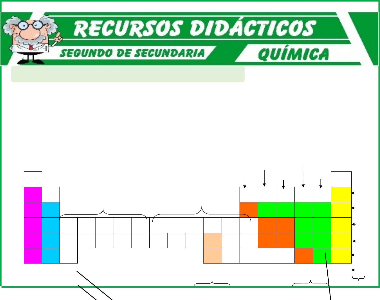 www.RecursosDidacticos.org DESCRIPCIÓN DE LA TABLA PERIODICA A Metales de Acuñación Frágiles Dúctiles Alcalinos Alcalinos Térreos Metales livianos Metales Pesados Metales de Transición · Grupo A : Representativos · Grupo B : Transición Lu Lw Metales de Transición Interna Semimelales 2 10 18 36 54 86 Z No Metales Térreos Carbonoides Nitrogenoides Halógenos Anfígenos o Calcogenos IIIB 4f : Ce 5f : Th IA VIIIA 1 H IIA IIIA IVA VA VIA VIIA He 2 Li Be B C N O F Ne 3 Na Mg. IIIB IVB VB VIB VIIB VIIB IIB IB Al Si P S Cl Ar 4 K Ca Sc Ti VB Cr Mn Fe Co Ni Cu Zn Ga Ge As Se Br Kr 5 Rb Sr Y Au Cd In Sn Sb Te I Xe 6 Cs Ba La Ag Hg Tl Pb Bi Po At Rn 7 Fr Ra Ac S1 S2 d1 d2 d3 .d4 d5 d6 d7 D8 d9 d10 p1 p2 p3 p4 p5 p6
