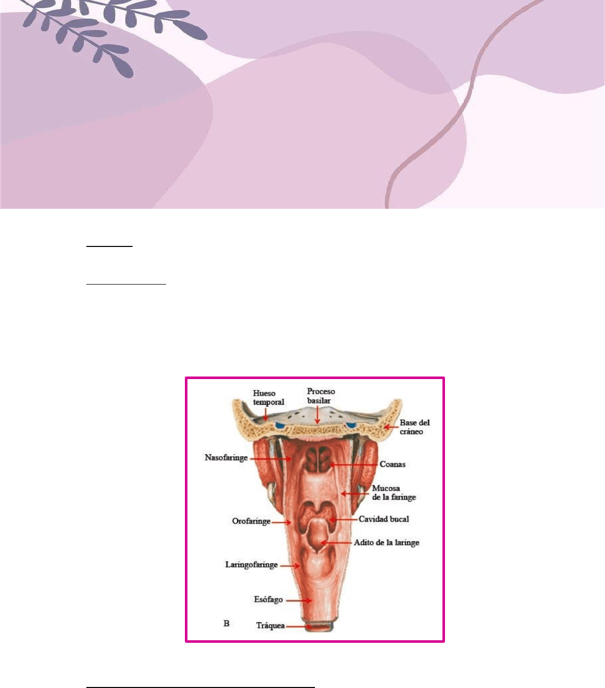Faringe Conducto músculo membranoso, que se extiende verticalmente, situado anterior a la columna vertebral y posterior a las cavidades nasales, la cavidad bucal y la laringe, desde la base del cráneo hasta el borde inferior de la sexta vértebra cervical. FORMA: Embudo irregular, un poco ampliado en la parte media cerca de las proximidades del hueso hioides. DIMENSIONES: El estado de reposo es de 15 cm, cuando se contrae disminuye 3 cm aproximadamente. Transversalmente de cuatro a 5 cm. De más de 2 cm en el extremo inferior del conducto. Siempre está abierta en su extremo superior hasta la laringe que da continuamente paso al aire de la respiración están separadas sus paredes entre sí dos o 3 cm. CONFIGURACIÓN EXTERNA Y RELACIONES: 1. Cara posterior: tiene continuidad acá al lado de las caras laterales formando los ángulos de la faringe. Se relaciona con el espacio retrofaríngeo, entre la faringe la lámina per vertebral posterior y los tabiques sagitales a los lados. 2. Caras laterales Tinguen en dos partes, una superior o cefálica y otra inferior o cervical separadas entre sí por un plano horizontal tangente al borde inferior de la mandíbula. Superiormente está en relación con los órganos sostenidos en el espacio latero faríngeo cefálico. E inferiormente a la mandíbula las caras laterales se van a relacionar con el paquete báculo nervioso del cuello glándula tiroides y sus pedículos vasculares. 3. Extremó superior sostenida hacia la base del cráneo, Dando una parte media que va desde la espina del hueso esfenoides hasta la otra y por partes laterales que se extienden a lo largo del surco de la trompa auditiva de la base del cráneo. 4. Extremó inferior, se relaciona con el cartílago cricoides y posterior con el borde inferior de la sexta vértebra cervical. A 15 cm de la arcada dental inferior CONFIGURACIÓN INTERNA Se divide en 3 porciones 1. Porción nasal de la faringe o nasofaringe: Presenta 6 paredes • Pared anterior, Se confunde con los orificios de las cavidades nasales o coanas • Pared superior y posterior se relacionan con la porción basilar del hueso occipital y con la membrana Atlanta occipital anterior. La pared superior forma la tonsila o amígdala faríngeas. Separados entre sí por surcos y que presenta en su extremo inferior una depresión profunda el receso medio de la tonsila faríngea el cual se abre a la bolsa faríngea. • Paredes laterales se observa el orificio faríngeo de la trompa auditiva la mucosa que lo rodea la tonsila o amígdala tubáricas. Posterior a este orificio se encuentra una depresión denominada receso faríngeo se extiende superior hacia el orificio de la trompa auditiva donde pasa denominarse fosita supra tubárica. • Arete inferior formada por el velo del paladar. 2. Porción oral de la faringe: limitada por el velo del paladar y por el cuerpo del hueso hioides, y se comunica hacia anterior con la cavidad bucal por medio del Istmo de las fauces. Posteriormente está relacionada con el Atlas el cuerpo del axis y la tercera vértebra cervical, hacia los lados por los pilares del velo del paladar y las tonsilas palatinas. 3. Porción laríngea de la faringe o laringofaringe o hipo faringe: se relaciona con la laringe que presenta de superior a inferior la epiglotis y por último una eminencia de cartílagos aritenoides y crítico hioides y músculos que lo recubren. La laringofaringe se proyecta sobre las vértebras cervicales cuarta quinta y sexta. PALADAR BLANDO O VELO DEL PALADAR Y TONSILAS 1. Paladar blando o velo del paladar tabique móvil músculo membranoso separa la nasofaringe de la orofaringe, presenta: • Cara anteroinferior, prolonga el rafe palatino en el velo del paladar • Cara postero superior se continúa con el suelo de las cavidades nasales, presenta un relieve alargado determinado por los músculos del úvula. • El borde anterior se confunde con el borde posterior del paladar duro • Los bordes laterales Unidos a las apófisis tiroides y su gancho. • El borde posterior presenta al aula palatina y dos repliegues a cada lado denominados arcos del velo del paladar o pilares del velo del paladar. _El arco palatogloso Pilar anterior del velo del paladar se desprende de su cara anterior cerca de la base del aula palatina terminando en el borde de la lengua. Los arcos palatoglosos, la uvula palatina y la raíz de la lengua limitan el limo de las fauces. _ El arco palatofaríngeo o la posterior del velo del paladar se pierde en la pared lateral de la faringe. Y ambos arcos palatofaríngeo forman un orificio intra faríngeo que se comunica con la nasofaringe con la orofaringe, son visibles a través del orificio bucal. Los pilares del velo del paladar limitan la fosa tonsilar. 2. Fosa tonsilar o seno tonsilar: es una depresión que limita: • Anteriormente, arco palatogloso y parte faríngea de la lengua • Posteriormente, arco palatofaríngeo • Inferiormente pliegue mucoso farina epiglótico • Superiormente por el pie gloso pilotico lateral • Lateralmente fascia farino vacilar La mitad superior de esta fosa está ocupada por la tonsila palatina 3. Tonsilla palatina o amígdala palatina: Masa de no grillos linfáticos cerrados compuesta por un tejido más denso y resistente que forma la cápsula tonsilar. • La cara medial, libre el prominente en la cabeza faringe posee orificios irregulares que dan acceso a divertículos de la cavidad faríngea, criptas tonsilares. • La cara lateral formada por la cápsula tonsilar no se adhiere a elementos de la pared faríngea • El extremo inferior, Posee nódulos linfáticos que se confunden inferiormente con lo de la tonsila lingual • El extremo superior separado del velo del paladar por la fosa supra tonsilar, vestigio de la hendidura branquial • El borde anterior separado del arco palatogloso del piegle triangular de la fosa supra tonsilar • El borde posterior separado del arco palatofaríngeo por un surco de profundidad variable a) 