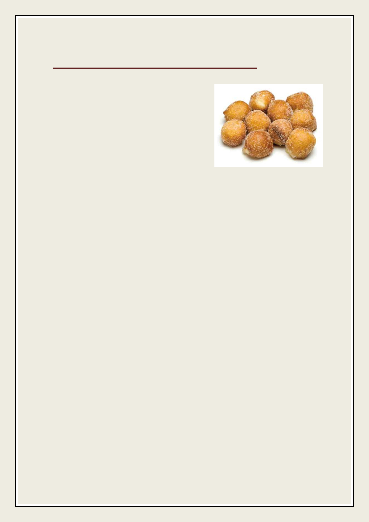 BUÑUELOS DE VIENTO Ingredientes: ¼ kg. De Harina 2 o 3 Huevos Sal Aceite Azúcar Agua ½ litro Preparación: Se mezcla ½ litro de agua, un poco de aceite y una pizca de sal y se pone a hervir. Cuando hierve, se añade ¼ kg de harina y se mezcla. Cuando la masa está bien integrada, se aparta del fuego y se deja reposar. Se baten 2 o 3 huevos y se añaden a la masa, removiendo y mezclando bien. En una sartén, se pone a calentar una buena cantidad de aceite y cuando empiece a hervir, se añaden con una cuchara pequeñas porciones de masa y así se van friendo los buñuelos. Se espolvorean con azúcar y ya están listos para servir. (Si la masa está bien hecha, los buñuelos se darán la vuelta en la sartén cuando estén dorados por un lado para dorarse por el otro). ¡¡¡Qué aproveche!!!