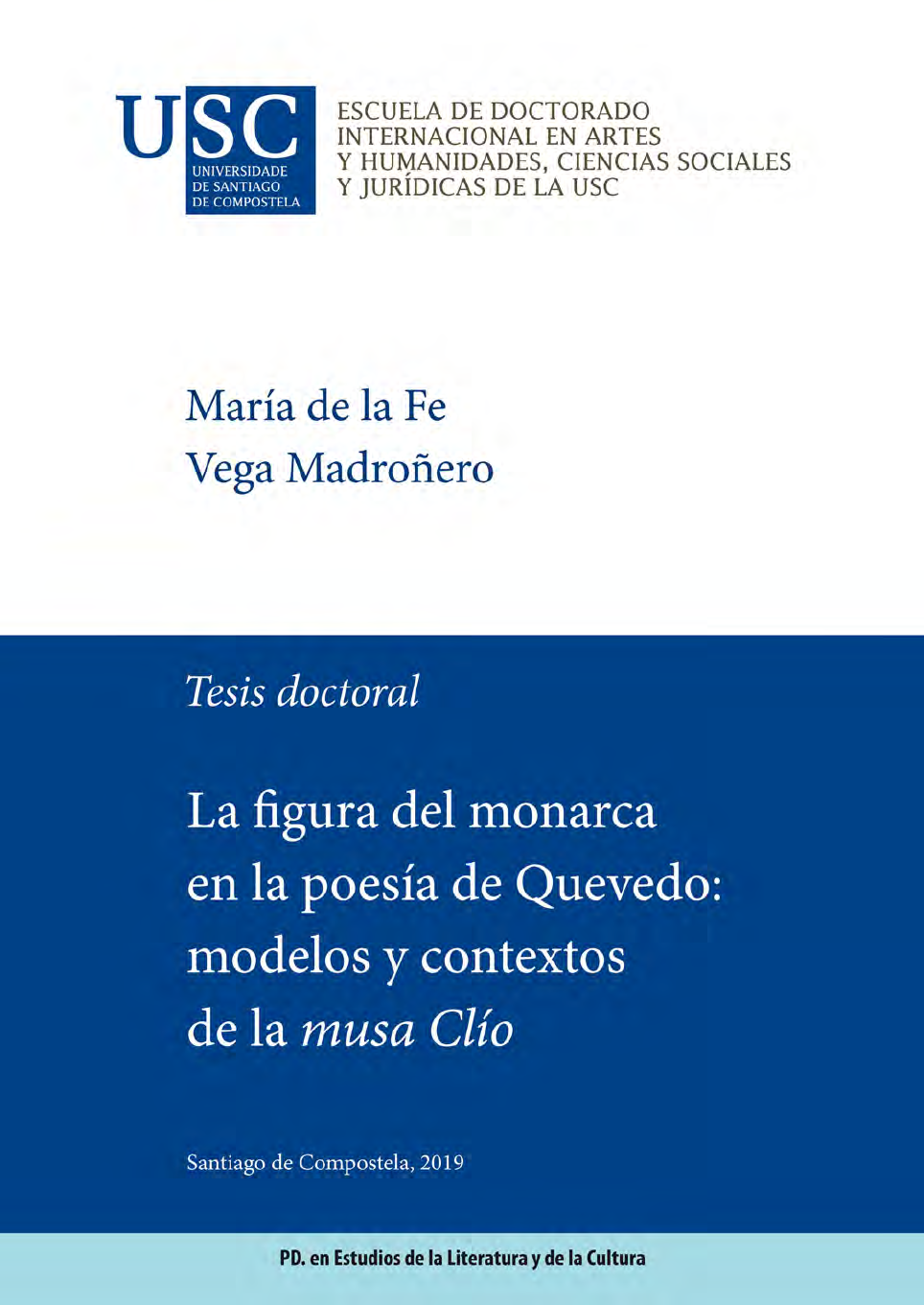 TESE DE DOUTORAMENTO LA FIGURA DEL MONARCA EN LA POESÍA DE QUEVEDO: MODELOS Y CONTEXTOS DE LA MUSA CLÍO María de la Fe Vega Madroñero ESCOLA DE DOUTORAMENTO INTERNACIONAL PROGRAMA DE DOUTORAMENTO EN ESTUDOS DA LITERATURA E DA CULTURA SANTIAGO DE COMPOSTELA 2019 LA FIGURA DEL MONARCA EN LA POESÍA DE QUEVEDO: MODELOS Y CONTEXTOS DE LA MUSA CLÍO RESUMEN La delimitación del concepto de heroico, dentro de las convenciones de la retórica epidíctica, y el estudio del contexto histórico y biográfico de Quevedo proporcionan los fundamentos de la interpretación de la musa Clío propuesta en la presente tesis. Este libro del Parnaso español organiza de manera coherente un conjunto de poemas destinados a la alabanza, que tiene por principal objeto la figura del monarca, tanto su propia persona como los hechos políticos, las circunstancias y las anécdotas que lo rodean. Desde esta perspectiva se pone en relación Clío con el resto de la obra quevediana, en prosa y en verso, y con la tradición de la literatura de alabanza, clásica y contemporánea al autor. El resultado supone una aportación a un mejor conocimiento de una parcela de la producción de este escritor, ahora considerada con los criterios de la poesía de elogio. PALABRAS CLAVE musa Clío de Quevedo, heroico, epidíctico, la figura del monarca, poesía de elogio. RESUMO A delimitación do concepto de heroico, dentro das convencións da retórica epidíctica, e o estudo do contexto histórico e biográfico de Quevedo proporcionan os fundamentos da interpretación da musa Clío proposta na presente tese. Este libro do Parnaso español organiza de maneira coherente un conxunto de poemas destinados á louvanza, que ten por principal obxecto a figura do monarca, tanto a súa propia persoa como os feitos políticos, as circunstancias e as anécdotas que o rodean. Desde esta perspectiva ponse en relación Clío co resto da obra quevediana, en prosa e en verso, e coa tradición da literatura de eloxio, clásica e contemporánea ao autor. O resultado supón unha achega a un mellor coñecemento dunha parte da produción deste escritor, agora considerada cos criterios da poesía de eloxio. PALABRAS CHAVE musa Clío de Quevedo, heroico, epidíctico, a figura do monarca, poesía de eloxio. ABSTRACT The delimitation of the concept of heroic, within the conventions of epidictic rhetoric, and the study of the historical and biographical context of Quevedo provide the foundations of the interpretation of the Clio muse proposed in the present dissertation. This book of the Parnaso español organizes in a coherent way a set of poems destined to praise, whose main object is the figure of the monarch, both his own person and the political facts, circumstances and anecdotes that surround him. From this perspective, Clío is related to the rest of the Quevedian work, in prose and verse, and with the tradition of classical and contemporary to the author praise literature. The result is a contribution to a better knowledge of a part of the production of this writer, now focused with the criteria of praise poetry. KEYWORDS Quevedo’s Clío muse, heroic, epidictic, the figure of the monarch, poetry of praise. INVESTIGACIÓN DERIVADA DE LA TESIS Artículos y capítulos “Francisco de Quevedo, Poesía moral (Polimnia), edición crítica y anotada por Alfonso Rey”, Glosa, 6, 1995, pp. 337-339. “La musa Clío: temas y tradición poética”, La Perinola, 3, 1999, pp. 355-371. “La poesía heroica de Quevedo y la Retórica”, en Retórica y texto, coord. de Antonio Ruiz Castellanos, Antonia Víñez Sánchez y Juan Sáez Durán, Cádiz, Servicio de Publicaciones de la Universidad de Cádiz, 1998, pp. 542-544. “Problemas en la edición de sátiras políticas en verso”, en Edición y anotación de textos. Actas del I Congreso de Jóvenes Filólogos (A Coruña, 25-28 de septiembre de 1996), ed. de Carmen Parrilla, Begoña Campos, Mar Campos, Antonio Chas, Mercedes Pampín y Nieves Pena, A Coruña: Servicio de Publicacións da Universidade da Coruña, 1998, vol. II, pp. 731-739. “El poema de Quevedo a la jura del príncipe Baltasar Carlos y las relaciones de la época”, en La fiesta. Actas del II Seminario de Relaciones de Sucesos (A Coruña, 13-15 de julio de 1998), ed. de Sagrario López Poza y Nieves Pena, Ferrol, Sociedad de Cultura Valle Inclán, 1999, pp. 351-358. “La imagen del buen rey en un soneto de Quevedo a Felipe III”, en Campus Stellae. Haciendo camino en la investigación literaria, vol. 1, ed. de D. Fernández López, Fernando Rodríguez-Gallego et alii, Santiago de Compostela, Universidade de Santiago de Compostela, 2006, pp. 368-379. “Quevedo y la exaltación de la monarquía en un festejo cortesano”, en En teoría hablamos de literatura. Actas del III Congreso Internacional de Aleph. Granada, 3-7 de abril de 2006, coord. de Antonio César Morón Espinosa y José Manuel Ruiz Martínez, Granada, Dauro, 2007, pp. 420-427. “«Las selvas hizo navegar, y el viento»: Carlos V en un soneto de Francisco de Quevedo”, en Cervantes y su tiempo, vol. 2, ed. de Juan Matas Caballero y José María Balcells Doménech, León, Universidad de León, 2008, pp. 427-437. Comunicaciones y ponencias “La poesía heroica de Quevedo y la Retórica”, III Encuentro Interdisciplinar sobre Retórica, Texto y Comunicación, Departamento de Filología de la Facultad de Filosofía y Letras de la Universidad de Cádiz, del 13 al 15 de diciembre de 1995. “Problemas en la edición de sátiras políticas en verso”, I Congreso de Jóvenes Filólogos. Edición y Anotación de Textos, Facultad de Filología de la Universidade da Coruña, de 25 al 28 de septiembre de 1996. “El poema de Quevedo a la jura del príncipe Baltasar Carlos y las relaciones de la época”, II Seminario de Relaciones de sucesos (La fiesta), Facultad de Filología de la Universidade da Coruña, del 13 al 15 de julio de 1998. “La musa Clío: temas y tradición poét