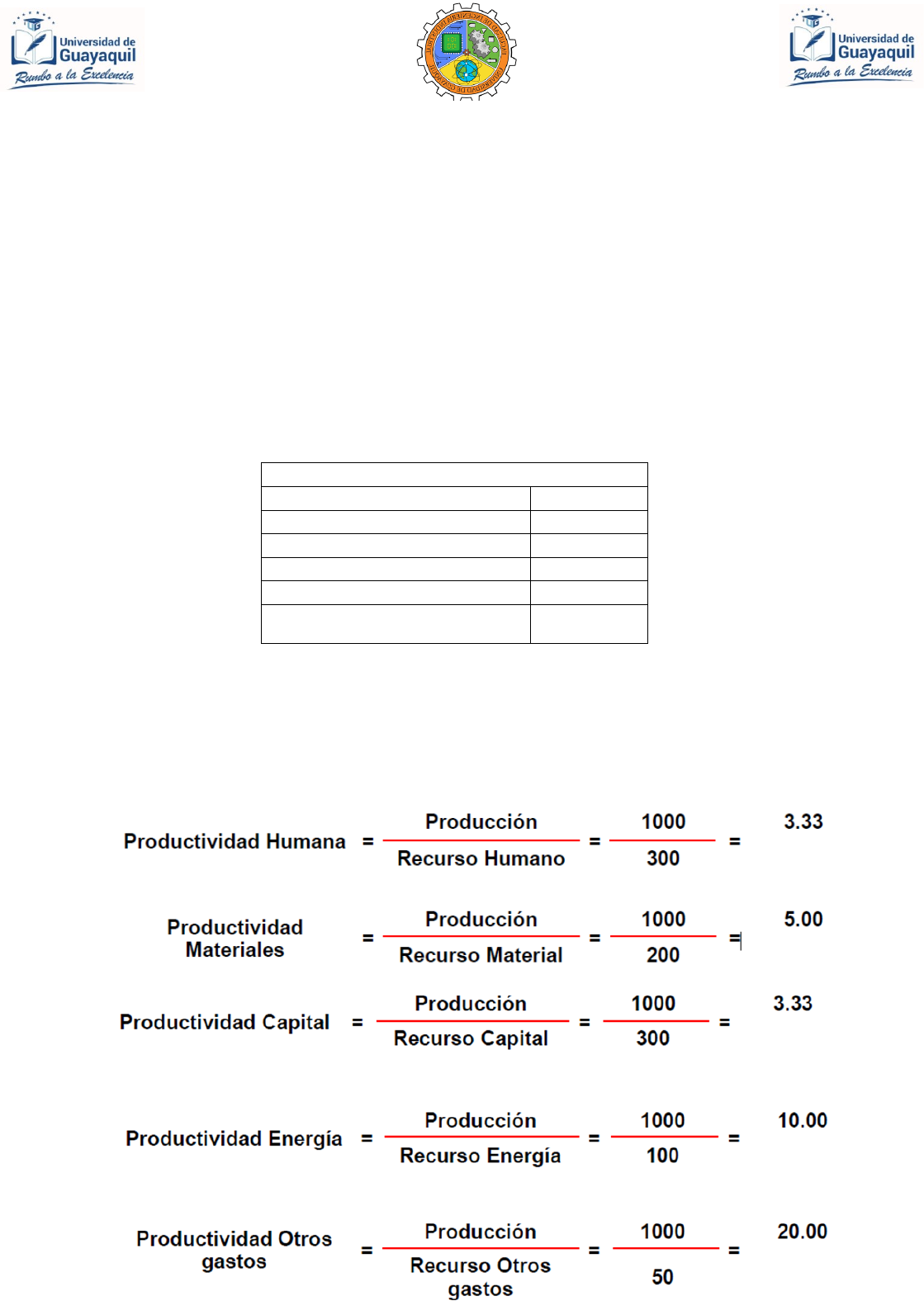 INGENIERÍA DE MÉTODOS EJERCICIO RESUELTO DE PRODUCTIVIDAD A continuación, te mostraremos la forma en que tú puedes aplicar la ecuación antes mencionada para que midas qué tan bien estás utilizando tus recursos. Fíjate en el siguiente: Ejemplo. Supongamos que en tu empresa se han utilizado los siguientes recursos durante el mes de enero para obtener la producción que se indica. La producción está dada con base en su valor de venta, los recursos utilizados corresponden a los costos de la producción. PERIODO BASE (Enero) Producción = $1,000.00 Recurso Humano = $ 300.00 Recurso de Materiales = $200.00 Recurso de Capital = $300.00 Recurso de Energía = $100.00 Recurso de Otros Gastos = $50.00 En este ejemplo, estamos suponiendo que el período de estudio es un mes, pero este período puede ser semanal, mensual, trimestral o anual o el que a usted le convenga analizar. PRODUCTIVAD PARCIALES Observemos detalladamente, en el cálculo de las productividades parciales, solamente se utilizó un recurso por cada cálculo. Para calcular la productividad total, se aplicará la misma ecuación, pero incluirán a todos los recursos que se hayan utilizado. PRODUCTIVIDAD TOTAL = 1,053 Los resultados que obtuviste corresponden al mes de ENERO, ahora se compararán estos resultados con los del mes de FEBRERO. Enseguida tenemos los datos y cálculos correspondientes al mes de Febrero. PERIODO BASE (Febrero) Producción = $1,000.00 Recurso Humano = $ 350.00 Recurso de Materiales = $200.00 Recurso de Capital = $300.00 Recurso de Energía = $80.00 Recurso de Otros Gastos = $40.00 Recuerda que cada vez que hagas una comparación, el periodo debe ser del mismo tiempo. PRODUCTIVIDAD TOTAL = 1,030 Ahora se hará una comparación entre los períodos de Enero y Febrero. Se observa qué tan bien se aprovecha los recursos en la empresa. Ver la siguiente la tabla: RECURSO PROD. ENERO PROD. FEBRERO RESULTADO HUMANO 3.33 2.85 DISMINUCIÓN PRODUCTIVIDAD MATERIALES 5.00 5.00 SIN CAMBIO EN PRODUCTIVIDAD CAPITAL 3.33 3.33 SIN CAMBIO EN PRODUCTIVIDAD ENERGIA 10.00 12.50 INCREMENTO PRODUCTIVIDAD OTROS GASTOS 20.00 25.00 INCREMENTO PRODUCTIVIDAD PRODUCTIVIDAD TOTAL 1,053 1,030 DISMINUCIÓN PRODUCTIVIDAD Calculemos la Tasa de Variación Global, donde la fórmula es: (PG febrero – PG enero) TVG febrero – enero = X 100 PG enero TVG febrero – enero = - 2,184% Como podemos observar, la productividad global del mes de febrero, en comparación al mes de enero, obtuvo una disminución de 2,184 porciento Conclusión: En el período de Febrero se utilizó más mano de obra, los recursos materiales y de capital se consumieron en la misma cantidad, y los recursos de energía y de otros gastos no se aprovecharon de la mejor manera puesto que se consumieron en mayor cantidad, obteniéndose la misma cantidad de productos. Con respecto de la productividad total se observa una baja. En cualquiera de los dos casos, si se aprovecharon o no los recursos, será tu responsabilidad instrumentar acciones que te permitan aprovecharlos mejor. A continuación, ahora se muestran los datos y cálculos correspondientes al mes de MARZO: PERIODO BASE (Marzo) Producción = $1,200.00 Recurso Humano = $ 300.00 Recurso de Materiales = $200.00 Recurso de Capital = $300.00 Recurso de Energía = $100.00 Recurso de Otros Gastos = $50.00 PRODUCTIVIDAD TOTAL = 1,26 Si se comparan los resultados que obtuviste en los meses de Enero y Marzo se observa que se incrementó la productividad en cada uno de los recursos Esto se debió a que se utilizaron los mismos recursos pero se produjeron más unidades. RECURSO PRODUCTIVIDAD ENERO PRODUCTIVIDAD FEBRERO PRODUCTIVIDAD MARZO RESULTADO HUMANO 3.33 2.85 4.00 INCREMENTO PRODUCTIVIDAD MATERIALES 5.00 5.00 6.00 INCREMENTO PRODUCTIVIDAD CAPITAL 3.33 3.33 4.00 INCREMENTO PRODUCTIVIDAD ENERGIA 10.00 12.50 12.00 INCREMENTO PRODUCTIVIDAD OTROS GASTOS 20.00 25.00 24.00 DISMINUCIÓN PRODUCTIVIDAD PRODUCTIVIDAD TOTAL 1.053 1.030 1.26 INCREMENTO PRODUCTIVIDAD Este sencillo ejemplo te muestra que puedes hacer más, utilizando los mismos recursos o hacer lo mismo empleando menos recursos. Así mismo puedes obtener la TASA DE VARIACIÓN con los periodos de producción que desees.