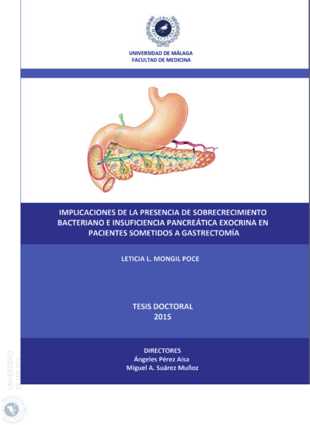 AUTOR: Leticia Lucía Mongil Poce http://orcid.org/0000-0001-8783-9041 EDITA: Publicaciones y Divulgación Científica. Universidad de Málaga Esta obra está bajo una licencia de Creative Commons Reconocimiento-NoComercial- SinObraDerivada 4.0 Internacional: http://creativecommons.org/licenses/by-nc-nd/4.0/legalcode Cualquier parte de esta obra se puede reproducir sin autorización pero con el reconocimiento y atribución de los autores. No se puede hacer uso comercial de la obra y no se puede alterar, transformar o hacer obras derivadas. Esta Tesis Doctoral está depositada en el Repositorio Institucional de la Universidad de Málaga (RIUMA): riuma.uma.es UNIVERSIDAD DE MÁLAGA FACULTAD DE MEDICINA TESIS DOCTORAL IMPLICACIONES DE LA PRESENCIA DE SOBRECRECIMIENTO BACTERIANO E INSUFICIENCIA PANCREÁTICA EXOCRINA EN PACIENTES SOMETIDOS A GASTRECTOMÍA. DIRECTORES Ángeles Pérez Aísa Miguel A. Suárez Muñoz DOCTORANDA LETICIA L. MONGIL POCE Málaga, 2015 Dª. Ángeles Pérez Aísa, Doctora en Medicina y Cirugía y D. Miguel Ángel Suárez Muñoz, Doctor en Medicina y Cirugía, profesor asociado del Departamento de Especialidades Quirúrgicas, Bioquímica e Inmunología de la Universidad de Málaga, CERTIFICAN: Que Dª. LETICIA LUCÍA MONGIL POCE ha obtenido y estudiado personalmente bajo nuestra dirección el material necesario para la realización de su Tesis Doctoral titulada Implicaciones de la presencia de sobrecrecimiento bacteriano e insuficiencia pancreática exocrina en pacientes sometidos a gastrectomía, la cual ha finalizado con todo aprovechamiento, habiendo los que la subscriben revisado su Tesis y estando conformes para que sea juzgada. Y para que conste, en cumplimiento de las disposiciones vigentes, expedimos el presente certificado en Málaga a 11 de Noviembre de dos mil quince. Ángeles Pérez Aísa Miguel A. Suárez Muñoz 5 AGRADECIMIENTOS En primer lugar quiero expresar mi agradecimiento a mis directores de tesis, los doctores Ángeles Pérez Aísa y Miguel Ángel Suárez, sin los cuales no hubiera sido posible la realización de este trabajo. En especial, a ti Ángeles por haber confiado en mí para formar parte de él, por tu profesionalidad, por tu tenacidad, y por las innumerables horas que me has dedicado, gracias de todo corazón. Esta tesis va dedicada a mi familia, a Guille y a mis tres pequeñines, Nico, Guille y Lucas, espero que me perdonéis las horas que no he podido estar con vosotros. Sois lo mejor que tengo. A mi madre, por todo lo que me has aguantado en la carrera y me sigues aguantando. A Salva por darme el empujoncito para seguir y por tu ayuda en la corrección, tablas, figuras... A Mari Carmen porque fue la que me metió en la cabeza hacer la tesis doctoral y por estar siempre dispuesta a ayudar sin esperar nada a cambio. A mi hermano Roberto, por ser siempre un ejemplo a seguir. Y por supuesto, a mis abuelos, Paco y Antonia, que estarían enormemente orgullosos de su nieta. 6 ÍNDICE GENERAL Índice pormenorizado .............................................................................................. 7 Índice de acrónimos ................................................................................................. 10 Índice de tablas ........................................................................................................ 11 Índice de figuras ...................................................................................................... 12 Índice de anexos ...................................................................................................... 12 1. Introducción ......................................................................................................... 13 2. Objetivos….. ........................................................................................................ 64 3. Material y método ................................................................................................ 66 4. Resultados .......................................................................................................... 76 5. Discusión .......................................................................................................... 94 6. Conclusiones ........................................................................................................ 105 7. Referencias bibliográficas ................................................................................... 107 8. Anexos .......................................................................................................... 129 7 1. INTRODUCCIÓN ................................................................................................ 13 1.1. Implicaciones fisiopatológicas de la gastrectomía en el proceso de la digestión ..................................................................................................... 14 1.1.1. Breve recuerdo de la fisiología gástrica y pancreática ..................... 14 1.1.1.1. Secreción ácida gástrica .................................................. 14 1.1.1.2. Motilidad gástrica ........................................................... 15 1.1.1.3. Regulación de la secreción exocrina pancreática............17 1.1.2. Gastrectomía y técnicas de reconstrucción del tránsito intestinal ... 18 1.1.3. Técnicas de reconstrucción del tránsito gastrointestinal .................. 19 1.1.3.1. La reconstrucción Billroth I ............................................ 19 1.1.3.2. La reconstrucción Billroth II ........................................... 20 1.1.3.3. La gastroyeyunostomía en Y de Roux ............................ 21 1.1.4. Síndromes postgastrectomía ............................................................ 22 1.1.4.1. Síndrome de vaciamiento rápido (síndrome de dumping) ........................................................................ 23 1.1.4.2. Síndrome del asa aferente ..............................................