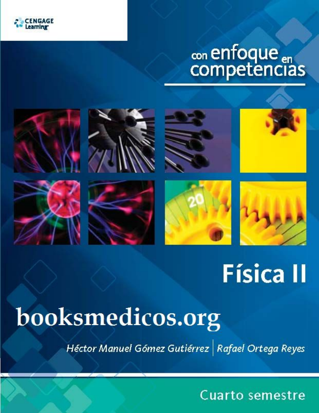 http://booksmedicos.org Física II Héctor Manuel Gómez Gutiérrez Rafael Ortega Reyes Revisión técnica Carlos Rodrigo del Razo Flores Australia • Brasil • Corea • España • Estados Unidos • Japón • México • Reino Unido • Singapur © D.R. 2011 por Cengage Learning Editores, S.A. de C.V., una Compañía de Cengage Learning, Inc. Corporativo Santa Fe Av. Santa Fe núm. 505, piso 12 Col. Cruz Manca, Santa Fe C.P. 05349, México, D.F. Cengage Learning™ es una marca registrada usada bajo permiso. DERECHOS RESERVADOS. Ninguna parte de este trabajo amparado por la Ley Federal del Derecho de Autor, podrá ser reproducida, transmitida, almacenada o utilizada en cualquier forma o por cualquier medio, ya sea gráfi co, electrónico o mecánico, incluyendo, pero sin limitarse a lo siguiente: fotocopiado, reproducción, escaneo, digitalización, grabación en audio, distribución en Internet, distribución en redes de información o almacenamiento y recopilación en sistemas de información a excepción de lo permitido en el Capítulo III, Artículo 27 de la Ley Federal del Derecho de Autor, sin el consentimiento por escrito de la Editorial. Datos para catalogación bibliográfi ca: Gómez Gutiérrez, Héctor Manuel, Ortega Reyes, Rafael Física II ISBN: 978-607-481-790-4 Visite nuestro sitio en: http://latinoamerica.cengage.com Impreso en México 1 2 3 4 5 6 7 12 11 10 Física II Héctor Manuel Gómez Gutiérrez Rafael Ortega Reyes Presidente de Cengage Learning Latinoamérica: Javier Arellano Gutiérrez Director General México y Centroamerica: Pedro Turbay Garrido Director editorial y de producción Latinoamérica: Raúl D. Zendejas Espejel Coordinadora editorial: María Rosas López Editora: María A. Alegría Estrada Coordinadora de producción editoral: Abril Vega Orozco Editora de producción: Gloria Luz Olguín Sarmiento Coordinador de producción: Rafael Pérez González Diseño de portada: Studio 2.0 Composición tipográfi ca: Punto 5 Silvia Plata Garibo David Espinoza Martínez Contenido general Bloque I Describe los fl uidos en reposo y en movimiento 1 Contenido disciplinar 4 Introducción al bloque 5 Cuadro de metas 6 Mi competencia inicial 7 1.1 Los estados de agregación ¡presentes con nosotros! 9 1.2 Propiedades del fl uido 14 1.3 Presión 21 Una historia para asombrarnos 28 Arquímedes y la corona de oro 28 1.4 Fluidos en movimiento 35 1.4A Ecuación de continuidad 35 1.4B Ecuación de Bernoulli 37 Conozcamos al personaje 37 Daniel Bernoulli 37 Bloque II Distingue entre calor y temperatura de diferentes cuerpos 45 Introducción al bloque 49 Cuadro de metas 50 Mi competencia inicial 51 2.1 Calor y temperatura 52 Una historia para asombrarnos 53 La historia de los caballeros del zodiaco 53 2.2 Dilatación térmica 61 2.2.1 Dilatación lineal 62 2.2.2 Dilatación de área 69 2.2.3 Dilatación cúbica 74 2.3 Calor 82 2.3.1 Calor o calor sensible 83 2.3.2 Calor latente 89 2.3.3 Equilibrio térmico 99 iv Física II Bloque III Comprende las leyes de la electricidad 107 Introducción al bloque 111 Cuadro de metas 112 Contenido disciplinar 113 Mi competencia inicial 114 3.1 Carga eléctrica 115 3.2 Ley de Coulomb 123 3.3 Campo eléctrico 132 3.4 Potencial eléctrico 141 3.5 Corriente eléctrica 151 Conozcamos al personaje 154 André Marie Ampere 154 Bloque IV Relaciona la electricidad y el magnetismo 173 Introducción al bloque 177 Cuadro de metas 178 Mi competencia inicial 179 4.1 Magnetismo 181 4.2 Campos magnéticos 189 4.3 Avance del electromagnetismo 198 4.4 Tipos de materiales magnéticos y algunos usos 203 4.5 Relación eléctrico-magnética 208 Estimado profesor: Hoy en día los jóvenes para ser exitosos, tienen que ser personas refl exivas, capa- ces de desarrollar opiniones personales, interactuar en contextos plurales, asumir un papel propositivo como miembros de la sociedad a la que pertenecen, discer- nir sobre lo que sea relevante y lo que no, plantear objetivos de manera precisa e informada, seleccionar información en el amplio universo que existe, de acuerdo con ciertos propósitos, y además estar en posibilidades de actualizarse de mane- ra continua. Sabemos que existe una gran diversidad entre los jóvenes que asisten al nivel bachillerato. Cada uno de ellos cuenta con intereses y capacidades diferentes, y por si fuera poco, están en la búsqueda de una identidad aún por defi nirse. Por este motivo, es que los jóvenes deben centrar su atención en las diver- sas áreas de estudio y elegir aquella que cumpla con su perfi l para desarrollarse profesional y personalmente en el ámbito laboral. Es necesario que el bachillerato modifi que sus formas de trabajo para ade- cuarse a los enfoques pedagógicos que hoy se manejan. Es por eso que la Edu- cación Media Superior centrará su trabajo en competencias, dejando a un lado la memorización que era a lo que se le daba prioridad en el pasado. Se requiere entonces que el alumno movilice una serie de conocimientos, ha- bilidades y actitudes en contextos específi cos que le permitan construir espacios educativos complejos que responden a las exigencias del mundo actual. Esta nueva generación de estudiantes se presenta ante ti profesor, líder del cambio, deseosa de aprender y desarrollar nuevos conocimientos, he ahí el desafío. Su vida educativa está en tus manos, así que esperamos que esta nueva propuesta educativa compuesta por esta primer serie de libros que Cengage Learning ha preparado para ti, te permita consolidar las metas de cada uno de tus alumnos que hoy pasan por las aulas del bachillerato en busca de su superación profesional. Al mismo tiempo podrás sentirte satisfecho de haberlo acompañado y apoyado en este importante y defi nitivo tramo de su vida. A continuación te presentamos información valiosa que puede resultarte útil para desarrollar tu trabajo cotidiano: Las competencias genéricas y sus principales atributos, son las que se esta- blecen a continuación: Se autodetermin