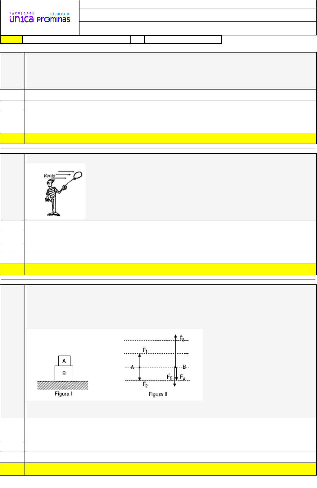 06/04/2024 10:03:57 1/3 REVISÃO DE SIMULADO Nome: THIAGO ROCHA LEONARDELI Disciplina: Física I Respostas corretas são marcadas em amarelo X Respostas marcardas por você. Questão 001 No piso de um elevador é colocada uma balança de banheiro, graduada em Newtons. Um corpo é colocado sobre a balança. Quando o elevador sobe com aceleração constante de 2,2 m/s2, a balança indica 720 N. Sendo a aceleração local da gravidade igual a 9,8 m/s2, determine a massa do corpo, em quilogramas. A) 84 kg B) 68 kg X C) 72 kg D) 50 kg E) 60 kg Questão 002 Refira-se a figura abaixo. A força total que atua sobre a bola (em equilíbrio) é igual A) ao empuxo do ar. B) a tração exercida pelo fio. C) ao peso da bola. X D) a força exercida pelo vento. E) a zero. Questão 003 A figura I, abaixo, ilustra um bloco A apoiado sobre um bloco B, estando o con-junto em repouso sobre uma mesa horizontal. Na figura II são apresentados dia-gramas que representam as forças que agem sobre cada um dos blocos, con-siderados como sistemas isolados. Nessa figura, as linhas tracejadas são igual-mente espaçadas e os tamanhos dos vetores são proporcionais aos módulos das respectivas forças. Das forças representadas nos diagramas, aquelas que podem configurar um par ação- reação são: A) F3 e F4 B) F1 e F3 C) F2 e F5 X D) F1 e F2 E) F1 e F4 06/04/2024 10:03:57 2/3 Questão 004 Um objeto de massa 4 Kg é arrastado por uma força de 28 N sobre um plano horizontal, conforme figura ao abaixo. Sabe-se que a aceleração adquirida pelo objeto é constante e vale 4 m/s2. Pode-se afirmar que o coeficiente atrito µ entre o objeto e o plano vale: A) 0,1 B) 0,2 C) 0,4 X D) 0,5 E) 0,3 Questão 005 Na figura temos dois corpos A e B, ligados por um fio inextensível sobre um plano inclinado, de pesos 140 N e 130 N respectivamente. Sabe-se que o coeficiente de atrito estático μe = 0,5 , o coeficiente de atrito cinético μc = 0,3 e que o ângulo Θ = 66º. O valor da força de atrito que atua no corpo B, vale X A) 13,4 N B) 45 N C) 19,6 N D) 38,7 N E) 21,7 N Questão 006 Na montagem ao lado, sendo 300 N o peso do corpo suspenso e 700 N o peso do homem, supondo o sistema em equilíbrio, foram feitas aas seguintes afirmações: I- A tração na corda é de 30 N. II- A compressão que o homem faz no chão é cerca de 1000 N. III- A reação normal do chão sobre o homem é cerca de 400 N. Correlação as afirmações acima é(são) correta(s): A) Apenas I. B) Apenas III. 06/04/2024 10:03:57 3/3 X C) Apenas II. D) Apenas II e III. E) Apenas I e III. Questão 007 Considere o bloco da figura, peso = 60 N, apoiado sobre um plano inclinado sob o ângulo de 75º, onde o coeficiente de atrito estático vale 0,6 e o coeficiente de atrito dinâmico vale 0,4, considerando F como força aplicada sobre o bloco, conforme figura, estando o mesmo inicialmente em repouso. Determine a aceleração do bloco quando a força for 45 N. A) 5,45 m/s2 B) 1,13 m/s2 C) 3,93 m/s2 D) 0,9 ms2 X E) 2,34 m/s2 Questão 008 ( UFVJM ) Esta figura mostra um bloco sobre a mesa. A força F1 é a sustentação da mesa no bloco, a força F2 é o peso do bloco, a força F3 é a força de pressão do bloco e a força F4 é a atração que o bloco provoca na Terra. ASSINALE a alternativa que contém o(s) par(es) de forças de ação e reação. A) N.D.A B) F2 e F3 X C) F1 e F3; F2 e F4 D) F1e F2;F3 e F4 E) F1 e F2