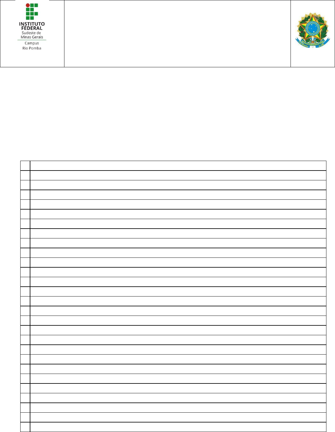 MINISTÉRIO DA EDUCAÇÃO SECRETARIA DE EDUCAÇÃO PROFISSIONAL E TECNOLÓGICA INSTITUTO FEDERAL DE EDUCAÇÃO, CIÊNCIA E TECNOLOGIA DO SUDESTE DE MINAS GERAIS. CAMPUS RIO POMBA COORDENAÇÃO GERAL DE ASSISTÊNCIA ESTUDANTIL – SERVIÇO SOCIAL EDITAL01/2024 - PROCESSO DE SELEÇÃO DO PROGRAMA DE ATENDIMENTO AOS ESTUDANTES EM BAIXA CONDIÇÃO SOCIOECONÔMICA. Resultado Provisório em ordem Alfabética Modalidade: Uniforme – Blusa 1 Ana Carla Solano 2 ANA CAROLINA MOREIRA MELO 3 Ana Clara Gonçalves Rocha 4 Ana Clara Oliveira da Silveira 5 ANA LAURA LEANDRO DA SILVA 6 ANA LUÍSA MUNIZ DE OLIVEIRA 7 Ana Luiza Bento do Amaral 8 Bruno Augusto ventura Luiz 9 Carla ESter Souza 10 Carlos Daniel Martins dos Santos 11 Carlos Henrique Amancio Apolinario 12 Débora Caroline Martins 13 Flavia Nogueira de Miranda 14 Gabriel Soares Borges 15 Guilherme da Silva Marquione 16 Heloá Inara Rocha de jesus 17 Henry Paz Silva Diogo 18 Isaac Gomes Ferreira 19 Isac Dionisio da Silva de Paula 20 Ithauanna Marcelino Magalhães 21 João Victor Lana de Freitas 22 Julia Aparecida Ferreira Coelho 23 Karla Eduarda Nunes da Silva 24 Kaynã Henrique Silva Bento 25 KETLIN FERNANDES DE OLIVEIRA DIAS 26 Laiza Viana Duarte 27 Laura de Lana Fernandes 28 LEONARDO FERNANDES CASTRO DE OLIVEIRA MINISTÉRIO DA EDUCAÇÃO SECRETARIA DE EDUCAÇÃO PROFISSIONAL E TECNOLÓGICA INSTITUTO FEDERAL DE EDUCAÇÃO, CIÊNCIA E TECNOLOGIA DO SUDESTE DE MINAS GERAIS. CAMPUS RIO POMBA 29 Leonardo Nogueira Dos Reis 30 Luis Gabriel Batista Arruda 31 Marcelo Chrystofer Fernandes De Almeida 32 Marcos Roberto de Oliveira 33 Maria Clara de Almeida Oliveira 34 Maria Cláudia Caetano Martins 35 Matheus Pedro do Carmo Silva 36 Maysa Arrighi de Oliveira Marcelino 37 Monike de Miranda Tavares 38 NATÁLIA APARECIDA SANTANA 39 Natan de Souza Oliveira 40 Neymar Silva Mendonça 41 Nicole Pereira da Silva Dionizio 42 Rafael Teofilo da Silva 43 Raquel Gonçalves de Oliveira 44 Rhallimy Borges Ferreira 45 Samily Pietra Siviano Vieira 46 Sophia Helena de Souza Juliao 47 Sophia Soares Moura 48 TAINARA MEDEIROS SIMÕES 49 Thamires Rodrigues Barbosa 50 Victor Luis Gomes da Silva Lista de Espera – Blusa 1 Aline de Faria Baia 2 Alycia Victoria De Paula Patricio 3 Amanda Aparecida Soares Souza Lima 4 Amanda Reis Santos 5 ANA CLARA SILVA NEPOMUCENO 6 Ana julia da Costa Goulart 7 Artur Max Gonçalves 8 Caroline Dias Marques 9 Cristian Rubens Oliveira Do Carmo 10 DYANA SOFIA PINHEIRO GONÇALVES 11 Eduarda Quintão Emídio MINISTÉRIO DA EDUCAÇÃO SECRETARIA DE EDUCAÇÃO PROFISSIONAL E TECNOLÓGICA INSTITUTO FEDERAL DE EDUCAÇÃO, CIÊNCIA E TECNOLOGIA DO SUDESTE DE MINAS GERAIS. CAMPUS RIO POMBA 12 Francisco Junior Maia Toledo 13 Guilherme Medeiros Mendonça 14 GUILHERME UEBE FERREIRA 15 Halfe Jose de Oliveira Castro 16 Ícaro Gomes de Freitas 17 Isabella Oliveira Araújo Roberto 18 isabelle de souza juliao 19 Jênnifer Lopes da Silva 20 Júlia Oliveira Dias 21 Kelly Cristine Silva Bento 22 LARA PIMENTEL SANTOS DE MENDONÇA 23 LARISSA DE PAULA LUCAS 24 LARISSE DAS MERCÊS DE FREITAS GESTEIRA 25 Lavínia Nogueira Magalhães 26 Lavinia Rodrigues de Abreu 27 Leonardo Cancela Amaral 28 Letícia Caneschi Veiga 29 LETICIA DAS MERCÊS DE FREITAS SANTANA 30 Lóren Alves dos Santos Souza. 31 Luany Dos Santos Soares 32 Maria Antônia Garcia Francelino 33 MARIA CLARA SILVA DE FARIA 34 Myrella Procopio Balbueno 35 Paulo David Fernandes Goulart Filho 36 Pedro Antônio Cabral Ribeiro Borges 37 PRISCILA APARECIDA DA SILVA CAMPOS 38 Rayssa Hauck Lopes 39 Rhana Luiza de Sena Miranda 40 Rhuan Ribeiro Oliveira 41 Sofia Gomes Moura 42 victor ferreira de Souza 43 Vítor Hugo Oliveira Silva 44 VITÓRIA FERREIRA DE CASTRO 45 Yuri Antonio Marins Campos MINISTÉRIO DA EDUCAÇÃO SECRETARIA DE EDUCAÇÃO PROFISSIONAL E TECNOLÓGICA INSTITUTO FEDERAL DE EDUCAÇÃO, CIÊNCIA E TECNOLOGIA DO SUDESTE DE MINAS GERAIS. CAMPUS RIO POMBA Uniforme – Kit Classificados 1 ADRIELY SANTOS ARAUJO 2 Ana Clara Rodrigues da Silva 3 Angelita caetano de miranda 4 BIANCA MAGALHAES SOUZA 5 Chayene Aparecida da Silva Maciel Teixeira 6 Clara Silva de Araujo 7 DOMINIQUE MARIA DE OLIVEIRA 8 Dyonathan Da Silva Costa Dias 9 Evellynlauany Silva de Oliveira 10 Gabriel dos Reis Graciano 11 Gabriel Paiva Evangelista 12 Gustavo da Silveira Paiva 13 Gustavo Lopes Balbueno 14 HERICA MARTINS LOMAR 15 Ingrid Gontijo Rosalino 16 Isabela Monteiro de Barros 17 Isabella Oliveira Arrighi 18 Isaías Romano Queiroz 19 João Felipe Abreu Santos 20 João Felipe Tiburcio Vilella 21 Julio cesar Carvalho da Silva 22 Jullya Bonfá Santos 23 Laura Dias Varotto 24 lavinia cypriano pereira 25 Lázaro Francisco Fernandes da Silva Souza 26 Leda Vitória Nicolau Lima Ramos 27 Luigi Anacleto Pinheiro 28 Maria Eduarda Brandão de Jesus 29 Maria Eduarda Campos De Araújo 30 Maria Rita Dos Santos 31 Mariana Alves Prado 32 Mariana Cunha Pereira 33 Mariana Maria Alves Duraes MINISTÉRIO DA EDUCAÇÃO SECRETARIA DE EDUCAÇÃO PROFISSIONAL E TECNOLÓGICA INSTITUTO FEDERAL DE EDUCAÇÃO, CIÊNCIA E TECNOLOGIA DO SUDESTE DE MINAS GERAIS. CAMPUS RIO POMBA 34 Mirella Martins dos Santos Silva 35 Nicolas Esteves Fernandes 36 Nicolle Queiroz da Silva 37 Oscar Antonio Nogueira de Lana 38 Pietro Medeiros De Assis 39 POLYANA APARECIDA DE SOUSA 40 Robert moreira bernardo 41 Samuel Muscardi Neves Santos 42 Sandro Emanoel Fernandes 43 Tainara Moreira de Lana 44 Victor Hugo Rosa 45 Victor Marin da Silva 46 Wallyson Lopes Pereira 47 Willyanne Santos Nascimento Ferreira 48 Yasmim Balter Faria 49 Yasmim Ferreira Rodrigues da Silva 50 Yasmim Gouvêa De Oliveira Silva Lista de Espera - Kit Uniforme 1 ALINE DE PAULA LOPES 2 Ana Teresa Drumond Motta 3 Arthur de Oliveira Lima 4 ARTHUR FELIPE EGIDIO FERNANDES 5 BERNARDO EUGENIO SILVA BITTAR 6 CAIO BATISTA RIBEIRO 7 Giovanna Pereira Martins Couto 8 Guilherme fernandes dos santos 9 HEITOR NEIVA TEIXEIRA RODRIGUES 10 JOÃO KACIO SOARES SILVA 11 João Paulo Ferreira Amaral 12 JOÃO PEDRO RIBEIRO DA COSTA 13 Lara de Oliveira R