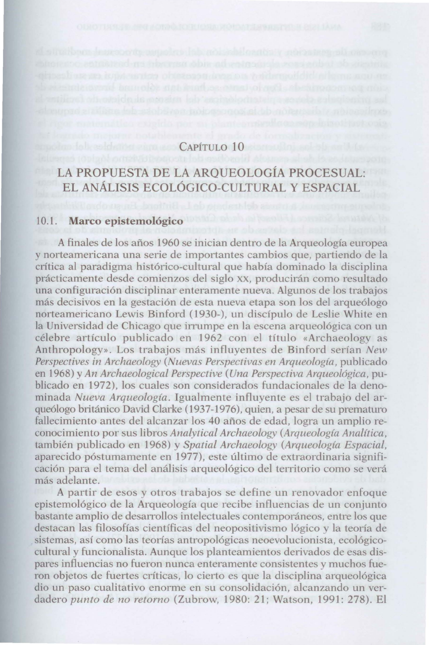 CAPÍTULO 10 LA PROPUESTA DE LA ARQUEOLOGÍA PROCESUAL: EL ANÁLISIS ECOLÓGICO-CULTURAL Y ESPACIAL 10.1. Marco epistemológico A finales de los años 1960 se inician dentro de la Arqueología europea y norteamericana una serie de importantes cambios que, partiendo de la crítica al paradigma histórico-cultural que había dominado la disciplina prácticamente desde comienzos del siglo xx, producirán como resultado una configuración disciplinar enteramente nueva. Algunos de los trabajos más decisivos en la gestación de esta nueva etapa son los del arqueólogo norteamericano Lewis Binford (1930-), un discípulo de Leslie White en la Universidad de Chicago que irrumpe en la escena arqueológica con un célebre artículo publicado en 1962 con el título «Archaeology as Anthropology». Los trabajos más influyentes de Binford serían New Perspectives in Archaeology (Nuevas Perspectivas en Arqueología, publicado en 1968) y An Archaeological Perspective (Una Perspectiva Arqueológica, pu blicado en 1972), los cuales son considerados fundacionales de la deno minada Nueva Arqueología. Igualmente influyente es el trabajo del ar queólogo británico David Clarke (1937-1976), quien, a pesar de su prematuro fallecimiento antes del alcanzar los 40 años de edad, logra un amplio re conocimiento por sus libros Analytical Archaeology (Arqueología Analítica, también publicado en 1968) y Spatial Archaeology (Arqueología Espacial, aparecido póstumamente en 1977), este último de extraordinaria signifi cación para el tema del análisis arqueológico del territorio como se verá más adelante. A partir de esos y otros trabajos se define un renovador enfoque epistemológico de la Arqueología que recibe influencias de un conjunto bastante amplio de desarrollos intelectuales contemporáneos, entre los que destacan las filosofías científicas del neopositivismo lógico y la teoría de sistemas, así como las teorías antropológicas neoevolucionista, ecológico cultural y funcionalista. Aunque los planteamientos derivados de esas dis pares influencias no fueron nunca enteramente consistentes y muchos fue ron objetos de fuertes críticas, lo cierto es que la disciplina arqueológica dio un paso cualitativo enorme en su consolidación, alcanzando un ver dadero punto de no retorno (Zubrow, 1980: 21; Watson, 1991: 278). El 188 ANÁLISIS E INTERPRETACIÓN ARQUEOLÓGICA DEL TERRITORIO proceso de gestación y consolidación del enfoque procesual mediante la síntesis de todos esos elementos ha sido narrado en bastantes ocasiones en una amplia bibliografía y no será necesario entrar aquí en su descrip ción pormenorizada. Por lo tanto se hará tan sólo una breve síntesis de las principales claves epistemológicas del mismo al objeto de facilitar la explicación y discusión de la concepción novedosa del análisis arqueoló gico territorial que conlleva. a) Una de las influencias epistemológicas más notables del enfoque procesual es el de la escuela filosófica del neopositivismo lógico, especial mente a través del trabajo de Carl Hempel (1905-1997), filósofo de origen alemán asociado al círculo vienés de empiricistas lógicos. La filosofía hem peliana tendrá una extraordinaria influencia en la vocación cientifista del enfoque procesual, a través del trabajo de L. Binford. En su obra Philosophy of Natural Science (Filosofía de la Ciencia Natural, aparecida en 1966), Hempe\ plantea \as daves c\e su aproximación a\ prob\ema O.e \a cons trucción del conocimiento científico, delineando su teoría cientifista, ra cionalista y nomológica. En síntesis, Hempel asume una postura optimista y robusta con res pecto a la posibilidad de construir un conocimiento científico del mundo cierto y fiable y con respecto a la posibilidad de delimitar el mismo frente al conocimiento seudocientífico o acientífico (Hempel, 1989: 54). Tres elementos de su propuesta tienen especial relevancia en la Nueva Ar queología. Por una parte el énfasis en el método hipotético-deductivo, donde la parte empírica de la investigación (trabajo de campo, recogida y análi sis de datos) está guiada y ordenada por una serie de enunciados o gene ralizaciones teóricas de carácter hipotético. Por otra parte, el carácter no mológico del tonocimiento científico, esto es, que las hipótesis y teorías más confirmadas por las evidencias empíricas se subsumen en leyes cien tíficas, de tipo universal o de tipo estadístico, mientras que el grado de cre dibilidad de las teorías científicas es mesurable en términos de sus con trastaciones empíricas y del grado de conocimiento sobre esa materia en un momento dado. Finalmente, rechazando el falsacionismo popperiano, Hempel plantea que la comparación entre diferentes teorías científicas es posible y necesaria y se verifica, más allá de la existencia de diferentes en foques teóricos o paradigmas, a través de indicadores tales como la canti dad de evidencias confirmatorias, la variedad de las evidencias confirmato rias, el apoyo lógico-teórico, la consistencia con hipótesis o teorías bien demostradas, la simplicidad en el enunciado, etc. (Hempel, 1989). b) Una segunda influencia de importancia en la reacción epistemo lógica de la Nueva Arqueología es la Te01ia General de Sistemas*. Propuesta por el biólogo alemán Ludwig von Bertalanffy ( 1901-1972) en la década de los cuarenta, la TGS propone el estudio transdisciplinar de la organización abstracta de los fenómenos con independencia de su sustancia, tipo o es cala espacio-temporal de existencia, investigando tanto los principios co munes de todas las entidades complejas como los modelos (normalmente matemáticos) que se pueden utilizar para describirlas (Audi, 1999: 898). PROPUESTA DE LA ARQUEOLOGÍA PROCESUAL 189 La TGS propone un heurístico universal de análisis que conceptúa los pro blemas científicos en términos de conjuntos de partes interactivas que se retroalimentan, bien con objetos, ener