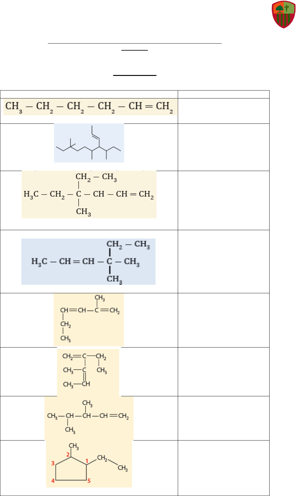 Colegio San Carlos de Quilicura Cuartos medios / Ciencias Naturales / 2020 SOLUCIONARIO GUÍA Nº25 CUARTO MEDIO DEL 12 AL 16 DE OCTUBRE “QUÍMICA” ACTIVIDAD NOMBRE LAS SIGUIENTES MOLÉCULAS MOLECULA NOMBRE 1-HEXENO 4-ISOPROPIL-5,8,8- TRIMETIL-2-DECENO 4-ETIL-4-METIL-1- HEXENO 4,4-DIMETIL-2-HEXENO 2-METIL-1,3-HEXDIENO 2-ETIL-3-METIL-1,3- PENDIENO 3,4-DIMETIL-1- PENTENO 1-ETIL-2- METILCICLOPENTANO 1,2,4- TRIMETILCICLOHEXAN O PROPILCICLOPENTANO 2,3,4,5-TETRAMETIL-1- HEXENO 1,2-DICLOROBENCENO O-DICLOROBENCENO 1,4-DIMETILBENCENO P-DIMETILBENCENO 1,6-DIFENIL-4-ETIL-2- METILHEXANO 1-CICLOPENTIL-3- METILHEXANO 1,2-DIMETIL-3- METILBENCENO 2-CICLOBUTIL-5- CICLOPROPILHEXANO Colegio San Carlos de Quilicura Cuartos medios / Ciencias Naturales / 2020 GUÍA Nº26 CUARTO MEDIO DEL 19 AL 23 DE OCTUBRE “QUÍMICA” Contenido de aprendizaje del TEMARIO DE LA PRUEBA DE TRANSICIÓN grupos funcionales: haluros, éteres, alcoholes, aminas, cetonas, aldehídos, ácidos carboxílicos, ésteres, amidas, entre otros. Nomenclatura de alcanos alquenos y alquinos Los hidrocarburos, compuestos completamente de átomos de carbono e hidrógeno, son combustibles maravillosos (tales combustibles incluyen propano, butano y la mayor parte de la gasolina comercial). Pero, ¿puedes construir un organismo vivo solo a partir de combustibles? Probablemente no. De hecho, la mayoría de las moléculas biológicas grandes contienen muchos tipos de átomos más allá del carbono y el hidrógeno. Estos átomos adicionales permiten una funcionalidad que normalmente no se ve en los hidrocarburos. GRUPOS FUNCIONALES Las moléculas biológicas grandes generalmente están compuestas por un esqueleto de carbono (formado por átomos de carbono e hidrógeno) y algunos otros átomos, incluyendo oxígeno, nitrógeno o azufre. A menudo, estos átomos adicionales aparecen en el contexto de grupos funcionales. Los grupos funcionales son motivos químicos o patrones de átomos que muestran una "función" consistente (propiedades y reactividad) independientemente de la molécula exacta en la que se encuentran. Las moléculas biológicas pueden contener muchos tipos y combinaciones diferentes de grupos funcionales, y el conjunto particular de grupos de una biomolécula afectará muchas de sus propiedades, incluida su estructura, solubilidad y reactividad. Nombre Curso Fecha IV° A-B-C Alcoholes El alcohol etílico es una sustancia orgánico que la podemos encontrar en nuestros hogares formando parte de los perfumes o colonias que usamos diariamente e incluso en nuestros botiquines para ser usados como desinfectante. Esta sustancia tan ampliamente conocida por todos se nombra químicamente como etanol y pertenece a la familia de los alcoholes. Los alcoholes son compuestos oxigenados que contienen en su estructura al menos un grupo funcional OH (hidroxilo), con formula general R–OH. Los alcoholes se clasifican en dependencia del tipo de átomo de carbono al que el hidroxilo se encuentra unido. Éteres Los éteres son compuestos orgánicos conocidos desde la antigüedad, pues los médicos de la época usaban sustancias pertenecientes a esta familia (éter dietilico) como anestésicos, a falta de otras más efectivas como las que se conocen en la actualidad. Los éteres son compuestos oxigenados con formula general R1–O–R2. Para nombrar los éteres se usa el sustituyente que presenta más átomos de carbono como cadena principal y el resto del éter como grupos alcoxi, usando el sufijo –oxi. La nomenclatura tradicional nombra los grupos R como radicales por orden alfabético seguidos de la palabra éter. Aldehídos y cetonas Los aldehídos y las cetonas son compuestos orgánicos con grupos funcionales muy similares, ambos poseen en su estructura el grupo carbonilo (C=O) con la diferencia de que en los aldehídos esta función está en un carbono primario y en las cetonas en un carbono secundario. Ácidos carboxílicos Los ácidos carboxílicos, algunos de ellos muy conocidos por su aplicación como conservantes en la industria alimenticia en la fabricación de quesos (ácido láctico) y en la conservacion de alimentos (ácido fumarico), son compuestos orgánicos oxigenados que presentan como grupo funcional el grupo carboxilo (R–COOH). Para nombrar los ácidos carboxílicos se usa primero la palabra ácido y luego el nombre del alcano cambia su terminación a –oico. Ésteres Los esteres son compuestos orgánicos que al igual que los estudiados hasta el momento están presentes en la vida cotidiana. Las velas que soplamos en los cumpleaños y para las cenas románticas son esteres. Los esteres se identifican por poseer un grupo funcional del tipo Para nombrar a los esteres debemos tener en cuenta los dos grupos funcionales de los cuales derivan: la parte que viene del acido carboxílico tendrá la terminación–ato y la que se deriva del alcohol, la terminación ilo (siempre quedará como _ato de _ilo) ACTIVIDAD 1. Los siguientes compuestos orgánicos I. son alcoholes. II. presentan la misma fórmula molecular. III. presentan 4 átomos de carbono en su estructura. A) Solo I. B) Solo II. C) Solo III. D) Solo I y III. E) Solo II y III. 2. ¿Qué grupo funcional contiene la siguiente molécula? A) Ácido orgánico B) Cetona C) Alcohol D) Éster E) Éter 3. El nombre IUPAC del siguiente compuesto orgánico: A) 3,4 - dimetil hexane B) 2,3-dietil-butano C) 2-etil-3 metil-pentano D) Octano E) 3,3-dimetil hexane F) 4. Escribiendo y observando las fórmulas desarrolladas del n-pentano y del 2-metilbutano, ¿cuál(es) de las siguientes características es (son) común(es) a los dos compuestos? I. El número de átomos de carbono. II. El número de átomos de hidrógeno. III. La ordenación de los átomos de carbono. A) Solo I B) Solo II C) Solo I y II D) Solo I y III E)Solo II y III 5. Escribiendo y observando las fórmulas desarrolladas del n-butano y del 2-metilpropano, ¿cuál(es) de las siguientes características es(son) común(es) a los d