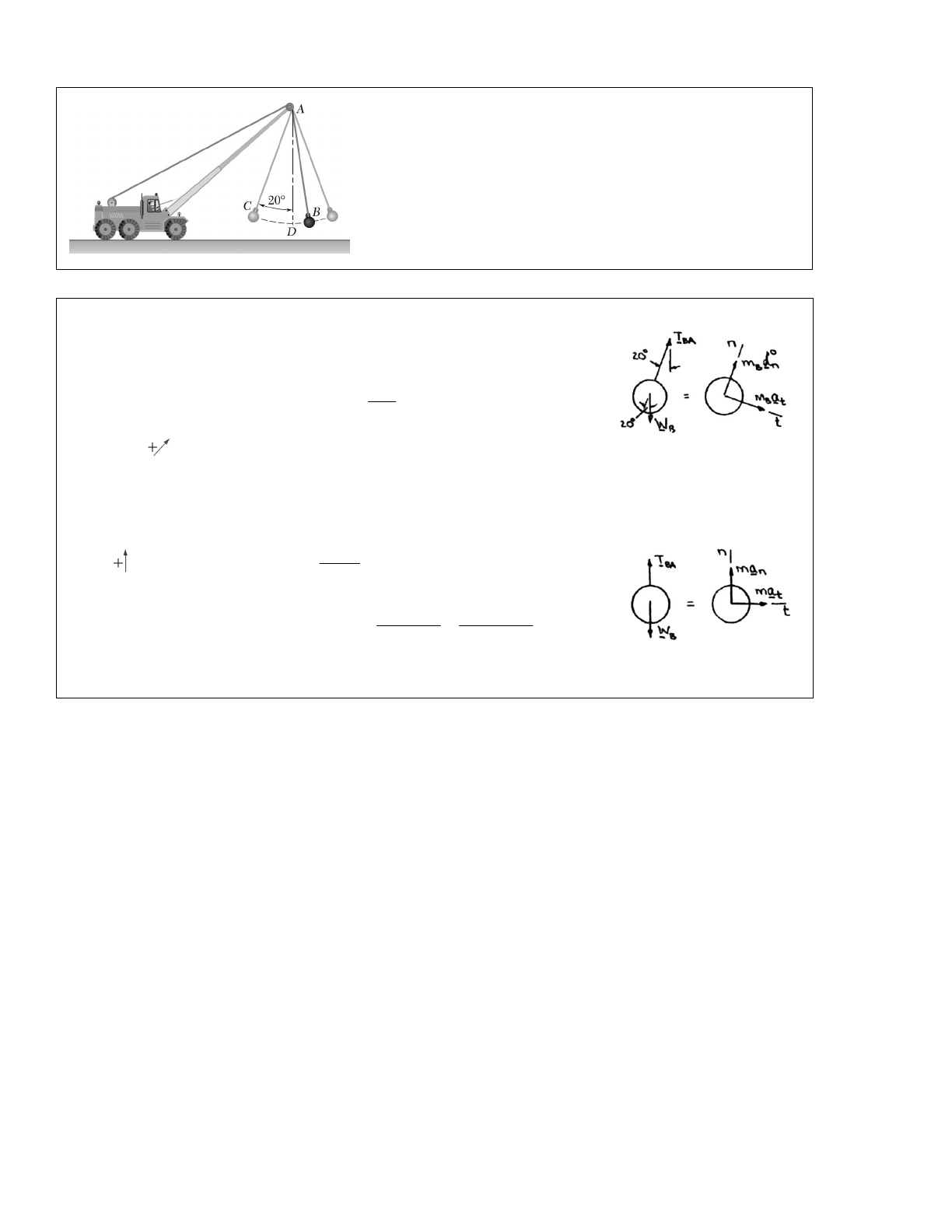 PROPRIETARY MATERIAL. © 2013 The McGraw-Hill Companies, Inc. All rights reserved. No part of this Manual may be displayed, reproduced or distributed in any form or by any means, without the prior written permission of the publisher, or used beyond the limited distribution to teachers and educators permitted by McGraw-Hill for their individual course preparation. If you are a student using this Manual, you are using it without permission. 368 PROBLEM 12.44 A 130-lb wrecking ball B is attached to a 45-ft-long steel cable AB and swings in the vertical arc shown. Determine the tension in the cable (a) at the top C of the swing, (b) at the bottom D of the swing, where the speed of B is 13.2 ft/s. SOLUTION (a) At C, the top of the swing, 0;Bv = thus 2 0B n AB v a L = = 0: cos 20 0n BA BF T WΣ = − ° = or (130 lb) cos 20BAT = × ° or 122.2 lbBAT = (b) 2( ) :Σ = − = B D n n BA B B AB v F ma T W m L or 2 2 130 lb (13.2 ft/s) (130 lb) 45 ft32.2 ft/s BAT = + or 145.6 lbBAT =