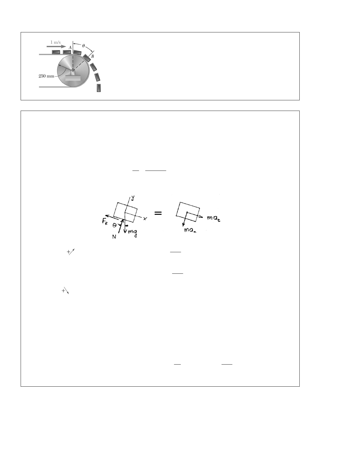 PROPRIETARY MATERIAL. © 2013 The McGraw-Hill Companies, Inc. All rights reserved. No part of this Manual may be displayed, reproduced or distributed in any form or by any means, without the prior written permission of the publisher, or used beyond the limited distribution to teachers and educators permitted by McGraw-Hill for their individual course preparation. If you are a student using this Manual, you are using it without permission. 374 PROBLEM 12.49 A series of small packages, each with a mass of 0.5 kg, are discharged from a conveyor belt as shown. Knowing that the coefficient of static friction between each package and the conveyor belt is 0.4, determine (a) the force exerted by the belt on a package just after it has passed Point A, (b) the angle θ defining the Point B where the packages first slip relative to the belt. SOLUTION Assume package does not slip. 0,t f sa F Nμ= ≤ On the curved portion of the belt 2 2 2(1 m/s) 4 m/s 0.250 mn v a ρ = = = For any angle θ 2 : cosy y n mv F ma N mg maθ ρ Σ = − = − = − 2 cos mv N mg θ ρ = − (1) : sin 0x x f tF ma F mg maθΣ = − + = = sinfF mg θ= (2) (a) At Point A, 0θ = ° (0.5)(9.81)(1.000) (0.5)(4)N = − 2.905 NN = (b) At Point B, sin ( cos ) 4 sin cos 0.40 cos 9.81 f s s n n s F N mg mg ma a g μ θ μ θ θ μ θ θ = = − = − = −