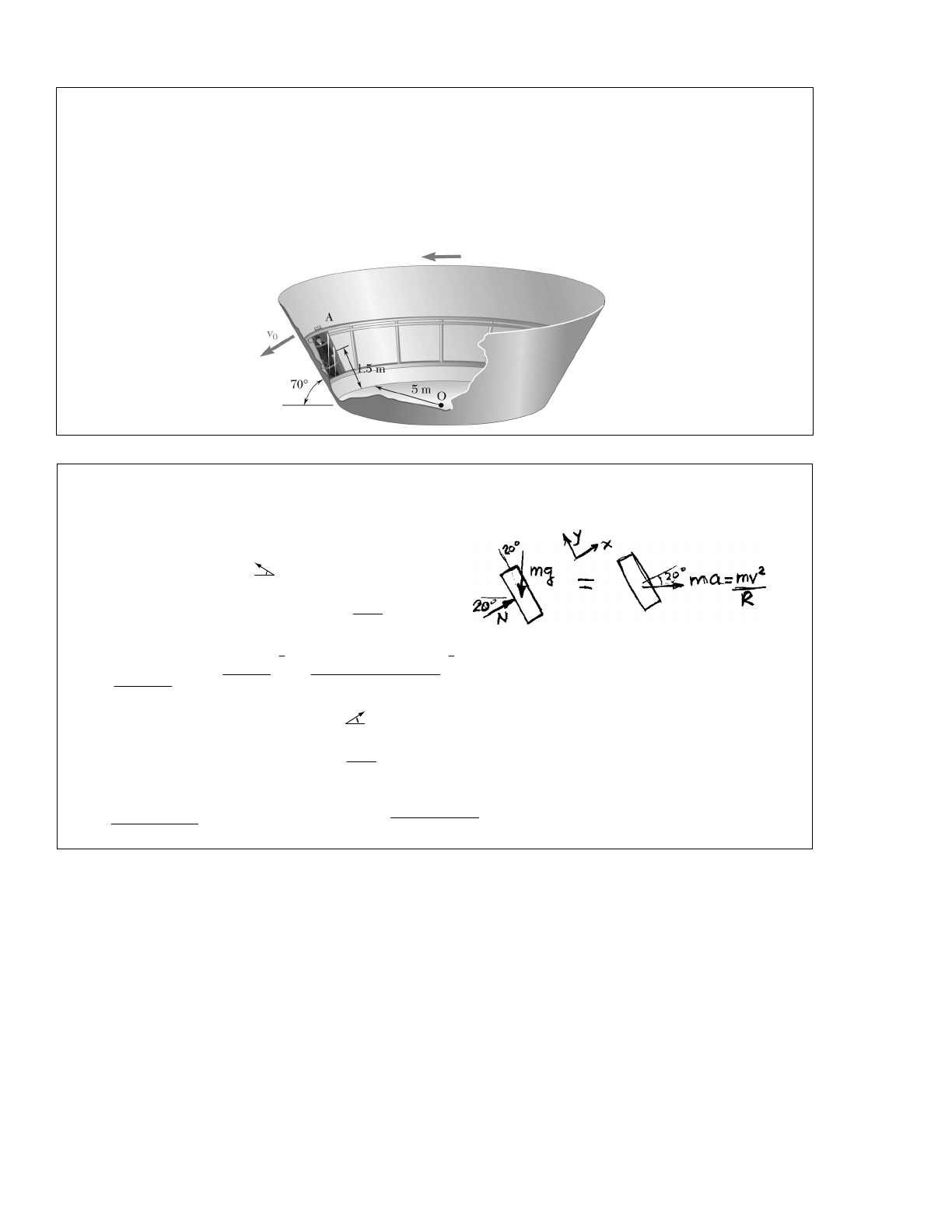 PROPRIETARY MATERIAL. © 2013 The McGraw-Hill Companies, Inc. All rights reserved. No part of this Manual may be displayed, reproduced or distributed in any form or by any means, without the prior written permission of the publisher, or used beyond the limited distribution to teachers and educators permitted by McGraw-Hill for their individual course preparation. If you are a student using this Manual, you are using it without permission. 378 PROBLEM 12.51 A carnival ride is designed to allow the general public to experience high acceleration motion. The ride rotates about Point O in a horizontal circle such that the rider has a speed v0. The rider reclines on a platform A which rides on rollers such that friction is negligible. A mechanical stop prevents the platform from rolling down the incline. Determine (a) the speed v0 at which the platform A begins to roll upwards, (b) the normal force experienced by an 80-kg rider at this speed. SOLUTION Radius of circle: 5 1.5cos70 5.513 m : R m = + ° = Σ =F a Components up the incline, 70°: 2 0cos 20 sin 20A mv m g R − ° = − ° (a) 0Speed :v 1 1 2 2 0 (9.81 m/s) (5.513 m 12.1898 m/s tan 20 tan 20 g R v = = = ° ° 0 12.19 m/sv = Components normal to the incline, 20°. 2 0sin 20 cos 20 . mv N mg R − ° = ° (b) Normal force: 280(12.1898) (80)(9.81)sin 20 cos 20 2294 N 5.513 N = ° + ° = 2290 NN =