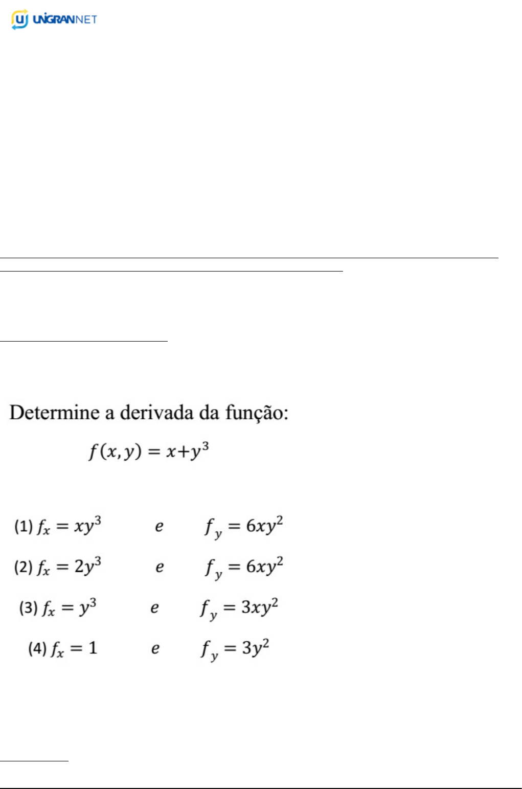 GABARITO Protocolo: 854281 Página 1 - 26/04/2024 às 14:10 Prova Data de aplicação: 06/04/2024 Curso: Engenharia Ambiental e Sanitária Disciplina: Cálculo III Ano: 20241 / Semestre: 6 RGM: 423.802 / Aluno: MAGNUM PHILLIPY SOARES GONÇALVES PROVA 01 Questão 1 Defina com suas palavras função de várias variáveis Resposta do aluno: É uma regra que estabelece uma quantidade de acordo com outra(s) quantidade(s). Por exemplo: A pressão de um gás depende do seu volume e da temperatura. Questão 2 Calcule a derivada parcial da função f(x,y) = 4x²-2y Resposta do aluno: f(x)= 8x f(y)= -2 Questão 3 Resolva: a) (1) b) (2) c) (3) d) (4) (correta) GABARITO Protocolo: 854281 Página 2 - 26/04/2024 às 14:10 Questão 4 Resolva: a) 24 b) 15 c) 32 (correta) d) 11 Questão 5 Resolva: a) (1) (correta) b) (2) c) (3) d) (4) Questão 6 Resolva: GABARITO Protocolo: 854281 Página 3 - 26/04/2024 às 14:10 a) (1) b) (2) (correta) c) (3) d) (4) Questão 7 Responda: GABARITO Protocolo: 854281 Página 4 - 26/04/2024 às 14:10 a) (1) b) (2) (correta) c) (3) d) (4) Questão 8 Determine o limite: a) -3 b) 3 c) 5 (correta) d) 0 Questão 9 Resolva: a) (1) (correta) b) (2) c) (3) d) (4) Questão 10 GABARITO Protocolo: 854281 Página 5 - 26/04/2024 às 14:10 Resolva: a) (1) b) (2) c) (3) d) (4) (correta) PROVA 02 Questão 1 Calcule a derivada parcial da função f(x,y) = x²y Resposta do aluno: f(x)=2xy f(y)=x² Questão 2 Explique com suas palavras as aplicações das derivadas, seja na física, química, engenharia, biologia, economia, etc. Resposta do aluno: As derivadas podem ser aplicadas na engenharia para cálculos de superfícies de objetos e estruturas que sejam irregulares quando comparadas à formas para as quais temos fórmulas (triangulos, retangulos, etc). Questão 3 Resolva GABARITO Protocolo: 854281 Página 6 - 26/04/2024 às 14:10 a) 2 b) 2/3 (correta) c) 1 d) 3 Questão 4 Resolva: a) 18/5 b) 12/5 c) 20 d) 288/5 (correta) Questão 5 Resolva: a) 10 b) 12 (correta) c) 20 d) 1 Questão 6 Resolva: GABARITO Protocolo: 854281 Página 7 - 26/04/2024 às 14:10 a) 12 b) 23 c) 16/5 (correta) d) 5 Questão 7 Resolva a) 3 b) 1 c) 4 (correta) d) 9 Questão 8 Resolva: a) 26 b) 36 (correta) GABARITO Protocolo: 854281 Página 8 - 26/04/2024 às 14:10 c) 12 d) 15 Questão 9 Resolva: a) 5/6 (correta) b) 15 c) 12 d) 1 Questão 10 Resolva: a) 8/3 (correta) b) 3 c) 2 d) 1