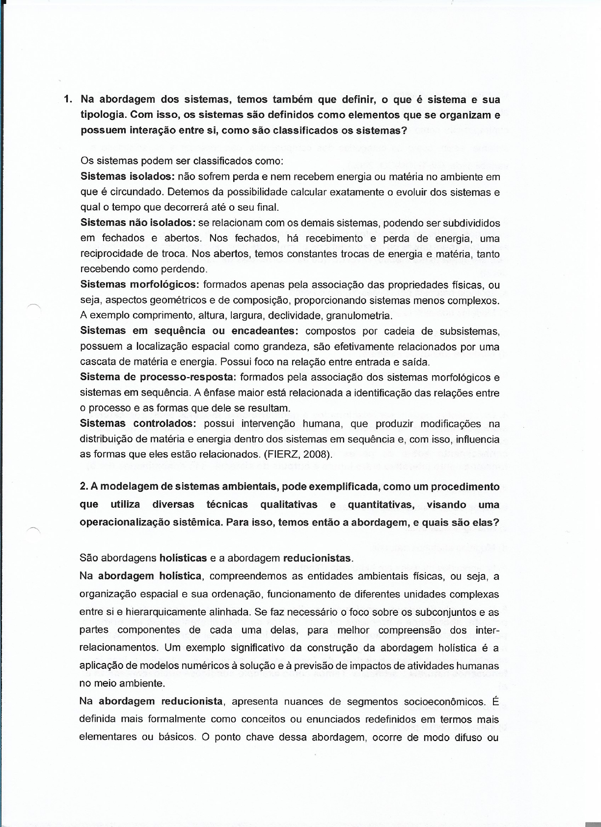 1. Na abordagem dos sistemas, temos também que definir, o que é sistema e sua tipologia. Corn isso, os sistemas sâo definidos como elementos que se organizam e possuem lnteraçâo entre si, como sâo classificados os sistemas? Os sistemas podem ser classificados coma: Sistemas isolados: nâo sofrem perda e nem recebem energia ou matéria no ambiente em que é circundado. Detemos da possibilidade calcular exatamente o evoluir dos sistemas e quai o tempo que decorrerà até o seu final. Sistemas nâo isolados: se relacionam corn os demais sistemas, podendo ser subdivididos em fechados e abertos. Nos fechados, ha recebimento e perda de energia, uma reciprocidade de troca. Nos abertos, temos constantes tracas de energia e matéria, tanto recebendo coma perdendo. Sistemas morfol6gicos: formados apenas pela associaçào das propriedades fisicas, ou seja, aspectas geométricos e de composiçâo, proporcionando sistemas menas complexas. A exemplo comprimento, altura, largura, declividade, granulometria. Sistemas em sequência ou encadeantes: compostas par cadeia de subsistemas, possuem a localizaçâo espacial coma grandeza, sào efetivamente relacionados par uma cascata de matéria e energia. Possui foco na relaçâo entre entrada e safda. Sistema de processo-resposta: formados pela associaçào dos sistemas morfol6gicos e sistemas em sequência. A ênfase maior esta relacionada a identificaçâo das relaçôes entre o processo e as formas que dele se resultam. Sistemas controlados: possui intervençâo humana, que produzir modificaçôes na distribuiçâo de matéria e energia dentro dos sistemas em sequência e, corn isso, influencia as formas que eles estâo relacionados. (FIERZ, 2008). 2. A modelagem de sistemas ambientais, pode exemplificada, como um procedimento que utiliza diversas técnicas qualitativas e quantitativas, visando uma operacionalizaçâo sistêmica. Para isso, temos entâo a abordagem, e quais sâo elas? Sâo abordagens holisticas e a abordagem reducionistas. Na abordagem holistica, compreendemos as entidades ambientais fisicas, ou seja, a organizaçâo espacial e sua ordenaçâo, funcionamento de diferentes unidades complexas entre si e hierarquicamente alinhada. Se faz necessàrio o foco sobre os subconjuntos e as partes componentes de cada uma delas, para melhor compreensâo dos inter relacionamentos. Um exemplo significativo da construçào da abordagem holfstica é a aplicaçâo de modelas numéricos à soluçâo e à previsâo de impactas de atividades humanas no meio ambiente. Na abordagem reducionista, apresenta nuances de segmentas socioeconômicos. É definida mais formalmente coma conceitos ou enunciados redefinidos em termos mais elementares ou bàsicos. O ponta chave dessa abordagem, ocorre de modo difuso ou