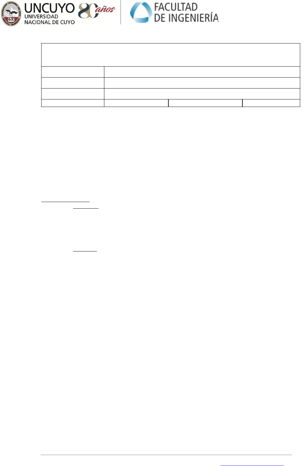 Centro Universitario (M5502JMA). Ciudad de Mendoza. Provincia de Mendoza República Argentina. Casilla de Correos 405. Tel. +54-261-4494002. Fax. +54-261-4380120. Sitio web: http://ingenieria.uncuyo.edu.ar Página 1 de 3 � 2019 AÑO DE LA EXPORTACIÓN Facultad de Ingeniería - Universidad Nacional de Cuyo P1- PROGRAMA DE ASIGNATURA Asignatura: 238 - Sistema Neumáticos e Hidráulicos Profesor Titular: ANZOLA, Julio Alfredo Carrera: Ingeniería en Mecatrónica Año: 2019 Semestre: 8° Horas Semestre: 60 Horas Semana: 4 OBJETIVOS Esta asignatura sentará las bases para la selección y aplicación de las técnicas Neumáticas e Hidráulicas, permitiendo al futuro profesional desarrollar criterios en el empleo estos elementos, en función de los requerimientos que el proyecto le demande. La cátedra tiene por eje el estudio de la teoría y práctica de estos sistemas y su aplicación específica, enfocada a su selección según su uso, y en función de esto los elementos más adecuados para el equipo, evaluando la relación técnico económico más apropiado para el proyecto. Para ello, como objetivos específicos se busca que los alumnos alcancen los siguientes logros: ♦ Conocer y desarrollar sistemas automatizados utilizando tecnologías neumáticas e hidráulicas. ♦ Analizar y comprender los principios básicos de los equipos de operación de los accionamientos y accesorios que integran una instalación, así como evaluar los dispositivos de seguridad a fin de detectar fallas y proponer alternativas de solución. Contenidos mínimos ♦ Neumática: Fluido neumático: producción, acondicionamiento, distribución. Accionadores neumáticos: Cilindros, cilindros especiales, motores. Distribuidores: principio, simbolización, tecnologías, comandos, determinación. Captores neumáticos: tipos, tecnologías, seguridad. Interfaces: electro-neumáticas y neumo-eléctricas. Auxiliares neumáticos: temporizadores, reductores de caudal, válvulas de escape rápido, conexiones. Técnicas de vacío: venteo, sistemas a efecto venturi, bomba. Dimensionamiento de componentes de circuitos neumáticos. Neumática proporcional y regulación neumática. Estudio de casos. ♦ Hidráulica: Nociones fundamentales de mecánica de los fluidos. Presentación de un sistema hidráulico. Accionadores hidráulicos: cilindros, cilindros especiales, bombas, motores. Distribuidores, principio, simbolización, tecnologías, comandos, determinación: Distribución de la energía hidráulica: reservorios, tuberías, acumuladores, accesorios. Válvulas: limitadores de presión, reducción de caudal, de secuencia, con funciones múltiples. Regulación de caudal: interés, tecnología, determinación. Servomecanismos hidráulicos. Fluidos: características físicas y químicas, desempeño, clasificación, elección. Estudio de casos. CONTENIDOS UNIDAD 1: Fluido neumático - Producción, acondicionamiento, distribución. A. Requisitos de la calidad del aire. Preparación del aire comprimido. Generación del aire comprimido: conceptos, definición. B. Tipos de compresores. Secador de aire. Instalación de aire comprimido. C. Redes de aire comprimido. Tratamiento del aire comprimido. UNIDAD 2: Actuadores neumáticos. A. Generalidades. Cilindros neumáticos: principios constructivos. Desarrollo constructivo del cilindro. B. Cilindros nemáticos: Amortiguamiento final. Tipo de sellos. Medidas básicas y dimensionamiento. Pandeo en cilindros. C. Cilindro simple y doble efecto. D. Motores neumáticos. Tipo de construcción y criterios de elección. Diferentes tipos. UNIDAD 3: Elementos de mando neumáticos. A. Válvulas direccionales. Función y representación. Interpretación de símbolos. Descripción. Centro Universitario (M5502JMA). Ciudad de Mendoza. Provincia de Mendoza República Argentina. Casilla de Correos 405. Tel. +54-261-4494002. Fax. +54-261-4380120. Sitio web: http://ingenieria.uncuyo.edu.ar Página 2 de 3 � 2019 AÑO DE LA EXPORTACIÓN Accionamiento. Funcionamiento. Tipos. Pilotaje. Principios constructivos. Tamaños nominales. B. Válvulas de Bloqueo. Válvulas de flujo. Válvulas de presión. C. Tuberías, conectores y accesorios. D. Circuitos neumáticos y sus componentes. Comando de los actuadores neumáticos. E. Regulación de velocidad. Comando de fuerza, velocidad y parada. Parámetros de diseño de sistemas neumáticos. Estudio de casos. UNIDAD 4: Fluido Oleohidráulico - Producción, acondicionamiento, distribución. A. Exigencia a los fluidos oleohidráulicos. Selección. Preparación del aceite. Origen de la contaminación. Almacenamiento. Filtrado. B. Tipos de bombas y motores. C. Instalación oleohidráulica. Tratamiento del aceite. UNIDAD 5: Cilindros hidráulicos. A. Tipo de cilindros. Cilindro simple y doble efecto. B. Forma constructiva. Amortiguamiento fin de curso. Tipo de sellos. Medidas básicas y dimensionamiento. Pandeo en cilindros. UNIDAD 6: Elementos de mando hidráulicos. A. Válvulas direccionales. Función y representación. Interpretación de símbolos. Descripción. Accionamiento eléctrico, mecánico, manual, fluídico (hidráulico o neumático). B. Válvulas de presión. Válvulas de flujo. Tuberías de interconexión, conectores y accesorios. C. Regulación de velocidad. Control de fuerza, velocidad y parada. Parámetros de diseño de sistemas hidráulicos. D. Circuitos hidráulicos básicos y sus componentes: reservorio, bombas, acumulador, válvulas, tuberías de interconexión y actuador. Estudio de casos. METODOLOGÍA DE ENSEÑANZA Clases presenciales teórico-prácticas (4h/semana) con la siguiente modalidad: • Presentación, desarrollo de conceptos y teoría con uso de recursos informáticos, explicaciones en pizarrón y material bibliográfico según corresponda. • Planteo de ejemplos y aplicación. Resolución de ejercicios simples con participación activa de los alumnos. • Prácticas guiadas. • Experiencias vivenciales en el área profesional. • Práctica