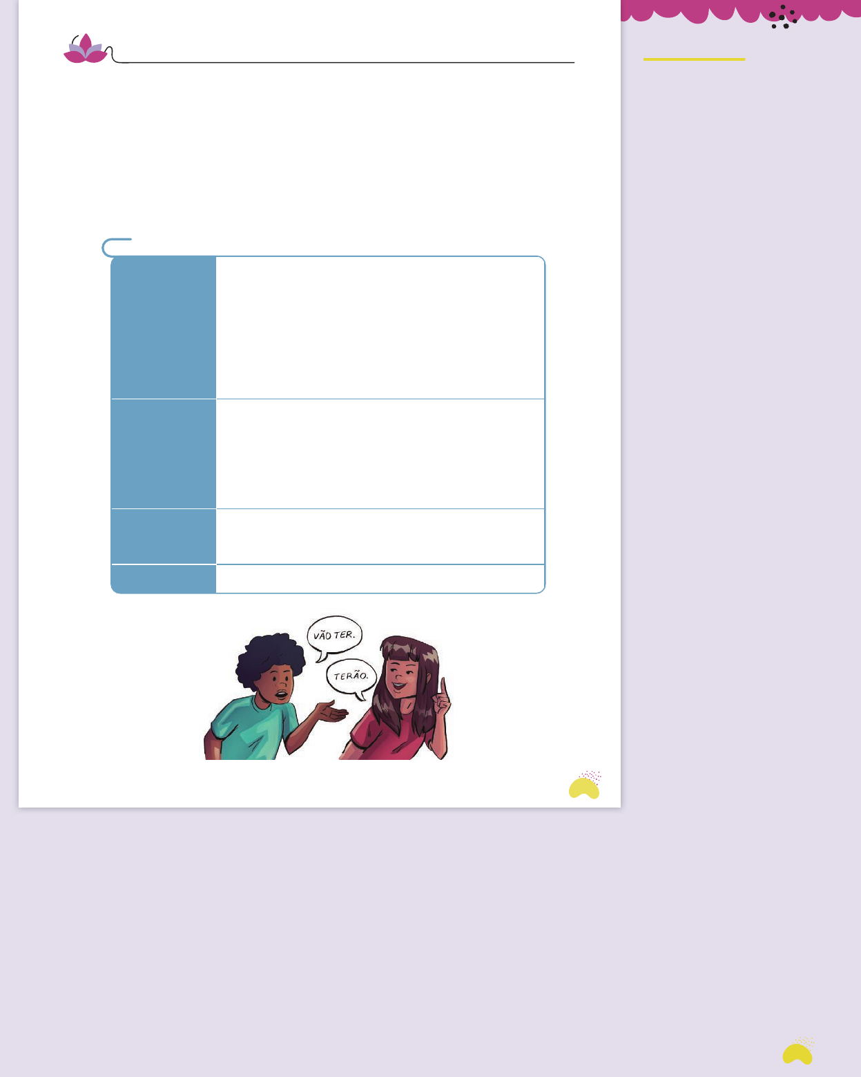Chegou o momento de fazer um balanço de tudo o que foi estudado na Unidade 6. Leia o quadro de conteúdos para recordar o que estudou e, no caderno, avalie seu desempenho usando os tópicos propostos a seguir como orientação. Isso ajudará você na hora de organizar seus estudos. Meu desempenho ⓿ Compreendi bem (registre no caderno os itens que você compreendeu) ⓿ Avancei em (registre no caderno os itens em que você melhorou) ⓿ Preciso rever (registre no caderno os itens que você precisa estudar mais) ⓿ Outras observações e/ou outras atividades Autoavaliação Unidade 6 Gênero Notícia LEITURA E INTERPRETAÇÃO ⓿ Leitura da notícia “Fóssil de dinossauro é encontrado no Maranhão” ⓿ Interpretação e análise da notícia ⓿ Identificação das partes de uma notícia ⓿ Adequação da linguagem para a notícia PRODUÇÃO Oral ⓿ Notícia radiofônica Escrita ⓿ Produção de notícia Ampliação de leitura CONEXÕES ⓿ Outras linguagens: ilustração ⓿ Análise de relevância do fato noticiado e importância da notícia para outros gêneros jornalísticos ⓿ Fake news, sensacionalismo e factoides OUTRO TEXTO DO MESMO GÊNEROõ ⓿ “Veterano de 99 anos levanta R$ 13 milhões para sistema de saúde pública do Reino Unido” Língua: usos e reflexão ⓿ Verbo: forma de marcar o tempo ⓿ Modo e conjugação ⓿ Advérbio ⓿ Acentuação de formas verbais Participação em atividades ⓿ Orais ⓿ Coletivas ou em grupos R ic a rd o J . S o u z a 195 195 Reprodução do Livro do Estudante em tamanho reduzido. Autoavaliação O quadro-síntese tem o objetivo de apresentar aos estudantes os concei- tos abordados nesta unidade para que eles se apropriem da organização de conteúdos de estudo, atribuindo-lhes nomes. Sugere-se que seja feita a leitura dos conteúdos apresentados com os estudantes, orientando-os sobre as co- lunas que compõem o quadro. Cumpre motivá-los a fazer comentários espon- tâneos sobre o próprio desempenho e ajudá-los a reconhecer suas necessi- dades de revisão. Os estudantes não podem ser obri- gados a se manifestar. Deve ser res- saltado que se trata de uma ativida- de pessoal. 162-195_Telaris6_LP_LE_MPU_U06_PNLD24.indd 195162-195_Telaris6_LP_LE_MPU_U06_PNLD24.indd 195 7/28/22 3:10 PM7/28/22 3:10 PM 196 Reprodução do Livro do Estudante em tamanho reduzido.Reprodução do Livro do Estudante em tamanho reduzido O p i n i õ e s e m j o g o 196 Nesta unidade você vai: ⓿ ler e interpretar artigo de opinião; ⓿ identificar partes da estrutura do artigo de opinião; ⓿ estudar intenção e escolhas de linguagem do artigo de opinião; ⓿ identificar argumentos; ⓿ produzir artigo de opinião; ⓿ identificar o verbo na oração; ⓿ reconhecer partes importantes da oração; ⓿ identificar e empregar a concordância do verbo com a pessoa a que se refere; ⓿ reconhecer e empregar pronomes pessoais em textos; ⓿ conhecer e empregar pronomes e outros recursos de coesão textual. Resposta pessoal. BNCC Competências da BNCC nesta unidade Gerais: 1, 2, 7, 8 e 9 Específicas de Linguagens: 1, 2, 3, 4 e 6 Específicas de Língua Portuguesa: 1, 2, 3, 4, 5, 6 e 7 Habilidades EF69LP05, EF69LP07, EF69LP08, EF69LP12, EF69LP13, EF69LP14, EF69LP15, EF69LP16, EF69LP17, EF69LP18, EF69LP19, EF69LP25, EF69LP30, EF69LP32, EF69LP33, EF69LP40, EF69LP55, EF69LP56, EF67LP04, EF67LP05, EF67LP06, EF67LP07, EF67LP20, EF67LP21, EF67LP24, EF67LP25, EF67LP32, EF67LP33, EF67LP36, EF06LP03, EF06LP05, EF06LP06, EF06LP07, EF06LP08, EF06LP09, EF06LP10, EF06LP11, EF06LP12 Opiniões em jogounidade 7 196-223_Telaris6_LP_LE_MPU_U07_PNLD24.indd 196196-223_Telaris6_LP_LE_MPU_U07_PNLD24.indd 196 7/27/22 12:34 PM7/27/22 12:34 PM