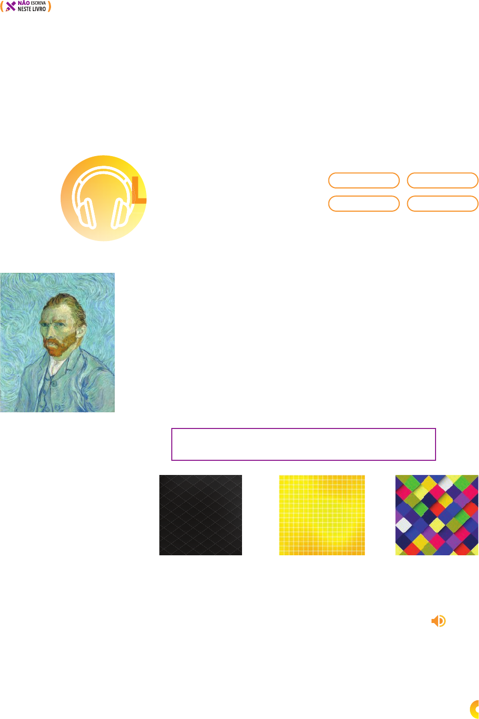 Self-portrait, Vincent van Gogh, 1889. Oil on canvas, 65 cm × 54 cm. dark bright 9. Use the clues to write questions about Eduardo Kobra in your notebook. a. be born / São Paulo b. When / discover / passion for street art c. When / join the graffi ti crew “Hip Hop” d. When / create Studio Kobra Now take turns with a classmate asking and answering the questions from the previous activity. Listening Before You Listen 1. You are about to listen to the biography of the artist who made the painting on the left. Observe it and discuss the questions with a classmate. a. What kind of painting is this? b. Do you know who painted it? c. What do you know about the artist? 2. The following words are in the audio you are about to listen. Before listening, match them to the pictures. Write the answers in your notebook. bright colorful dark a. b. c. Was he born in São Paulo? When did he discover his passion for street art? When did he join the graffi ti crew “Hip Hop”? When did he create Studio Kobra? 10.10. Explique aos estudantes que esta é uma atividade oral. Se ne- cessário, solicite a ajuda de um voluntário e modele a primeira pergunta e resposta. a. Yes, he was.; b. He discovered his passion for street art in his early years.; c. He joined the graffi ti crew “Hip Hop” during his teens.; d. He created Studio Kobra when São Paulo became a prominent center of contemporary street art. ListeningListeningListeningListeningListening EM13LGG602 EM13LGG604 EM13LGG403 EM13LGG601 It’s a self-portrait. Vincent van Gogh Resposta pessoal R e p ro d u ç ã o /M u s e u d ’O rs a y, P a ri s , F ra n ç a m a m a n a m s a i/ S h u tt e rs to ck Ta s iP a s /S h u tt e rs to ck m y s te l/ S h u tt e rs to ck 1. Após a realização da ativida- de, compartilhe com a turma as informações técnicas da obra de arte indicada. Elas não foram in- seridas junto de sua respectiva imagem para que o estudante possa, sozinho, levantar hipóte- ses sobre a obra. As You Listen 3. Listen to Van Gogh’s biography and choose the appropriate options to answer the questions. Use your notebook to write the answers. a. When was he born? • 1853 X • 1953 • 1863 3. Este áudio foi extraído do vídeo “Vincent van Gogh for Children: Biography for Kids”. Disponível em: https://www.youtube.com/ watch?v=qv8TANh8djI&l ist =PLSnMvBBNQHQoJ2o9Qah GF1vFIu1N-h2ne&index=4. Acesso em: 14 abr. 2020. TRACK 11 colorful 143 VU_INGLES_Amadeu_g21Sa_135a148_U9_LA.indd 143VU_INGLES_Amadeu_g21Sa_135a148_U9_LA.indd 143 01/09/2020 11:5201/09/2020 11:52 b. Where did he move to near the end of his life? • France X • England • Belgium c. How old was he when he died? • 57 • 47 • 37 X d. How many paintings did he make? • over 500 • over 900 X • over 9,000 e. When did he die? • 1890 X • 1819 • 1909 f. Because of his paintings, what new form of art was invented? • Realism • Renaissance • Expressionism 4. The paintings below were made by Van Gogh. By observing their characteristics, which one do you think was painted first? Why? X The Potato Eaters was painted first; it’s dark and serious. 5. Listen again and, in your notebook, check if the sentences about Van Gogh are true (T) or false (F). a. He started painting when he was a child. F b. He made the paintings that were considered his best works two years before he died, in France. T c. His paintings were very popular while he was alive. F d. The beauty and color of the place he lived in was an inspiration for his paintings. T e. His work still influences artists today. T After You Listen 6. Discuss the following questions in pairs or small groups. a. According to Van Gogh’s biography, the beauty and color of the place he lived in inspired him to paint it. Where do you think artists get inspiration from? Where do you get inspiration to do things you like? b. Take a look at the paintings by Van Gogh in this section again. Which one do you like best? Why? How does it make you feel? TRACK 11 6. Se achar necessário, dê sua resposta às perguntas para que sirvam de exemplo aos estudantes (por exemplo, “I think artists get inspiration from the place where they live.”). Ao final da atividade, escolha alguns estudantes e peça que relatem brevemente o que discutiram com os colegas. Respostas pessoais O filme Com amor, Van Gogh (Loving Vincent), de Dorota Kobiela e Hugh Welchman, narra a história de um homem que investiga a vida pessoal de Van Gogh na cidade francesa de Arles, um ano após a morte do artista. Feito com a técnica de pintura a óleo, como nos quadros de Van Gogh, a animação contou com uma equipe de 115 pintores para produzir cada um dos 65 mil quadros de filme (em inglês, movie frames) nesse recurso artístico. Polônia/Reino Unido: BreakThru Productions/ Trademark Films, 2017 (95 min). Classificação: 12 anos. SUGGESTION The Potato Eaters The Potato Eaters, Vincent van Gogh, 1885. Oil on canvas, 82 cm × 114 cm. The Night Café The Night Café, Vincent van Gogh, 1888. Oil on canvas, 70 cm × 89 cm. R e p ro d u ç ã o /M u s e u V a n G o g h , A m s te rd ã , H o la n d a R e p ro d u ç ã o /G a le ri a d e A rt e d a U n iv e rs id a d e d e Y a le , N e w H a v e n C T, E U A 4. Após a realização da ativida- de, compartilhe com a turma as informações técnicas de cada uma das obras de arte indica- das. Elas não foram inseridas junto de suas respectivas ima- gens para que o estudante pos- sa, sozinho, levantar hipóteses sobre as obras. 144 VU_INGLES_Amadeu_g21Sa_135a148_U9_LA.indd 144VU_INGLES_Amadeu_g21Sa_135a148_U9_LA.indd 144 01/09/2020 11:5201/09/2020 11:52
