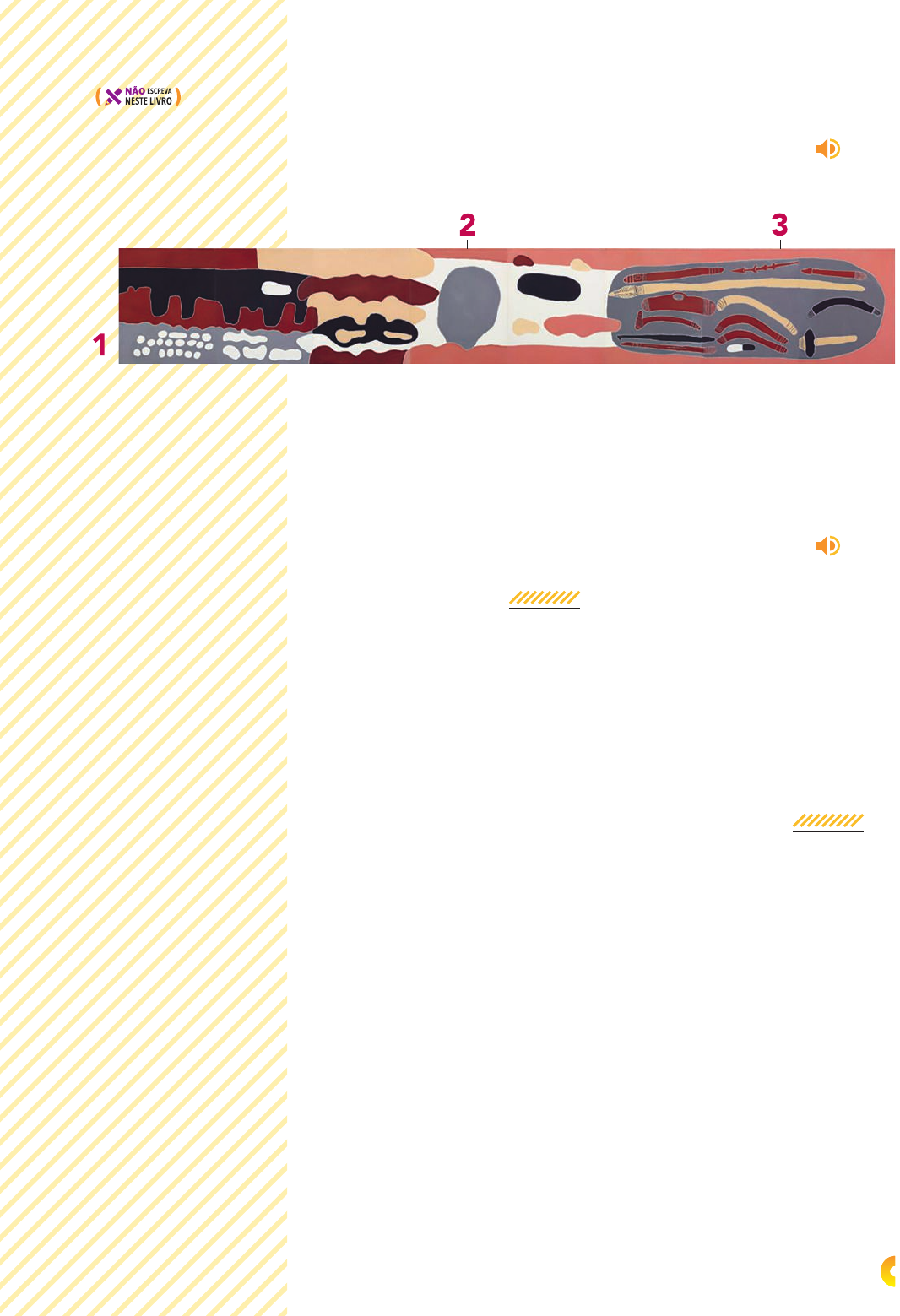 Waterbrain, Rusty Peter, 2002. Natural pigments on linen canvas, eight panels: 180 cm × 150 cm each panel; 180 cm × 1200 cm overall. a. It is the water where the spirits live before their birth. 1 b. It represents the knowledge learned to be a man. 3 c. It shows that children have a lot to learn until adulthood. 2 4. Listen again. Then choose the appropriate alternatives and write them down in your notebook. a. Waterbrain is the aboriginal artwork in the art gallery’s collection. • oldest • largest X b. What is Waterbrain about? • Adulthood • The cycle of life X c. On the right-hand side of the painting, you can see like spears, boomerangs and knives. • cultural objects X • kitchen utensils After You Listen 5. We learned from the audio guide that objects like spears, boomerangs and knives are an important part of Gija (one of the Aboriginal peoples in Australia) life. At the end of the audio, we are asked the following questions: • What objects would you need to know about to become an adult within your culture? • How would you show them if you had to draw or paint them? Get together in pairs or small groups to answer the questions. TRACK 10 4. Se achar oportuno, comente com os estudantes que lanças, bumerangues e facas são armas que os aborígenes costumam usar na caça a animais selva- gens e em contextos de guerra. 5. Para incentivar a criatividade artística dos estudantes, pe- ça-lhes que façam os próprios desenhos para responder à se- gunda pergunta, sobre como desenhariam ou pintariam os objetos que se precisa conhe- cer para “se tornar um adulto” na cultura deles. Em seguida, peça-lhes que expliquem o que seus desenhos representam. Respostas pessoais As You Listen 3. Observe the painting. Then listen to the audio guide and match each number to its interpretation, according to what you hear. Use your notebook. TRACK 10 R u s ty P e te rs , W a rm u n A rt C e n tr e , S y d n e y, A u s tr á lia 3. O áudio desta seção foi extraído do site da Art Gallery of New South Wales. Disponível em: https://soundcloud.com/artgal- leryofnsw/rusty-peters-waterbrain-1. Acesso em: 17 abr. 2020. 131 VU_INGLES_Amadeu_g21Sa_119a132_U8_LA.indd 131VU_INGLES_Amadeu_g21Sa_119a132_U8_LA.indd 131 01/09/2020 11:5101/09/2020 11:51 Self-Assessment 1. Como você avalia o seu aprendizado nesta Unidade? Leia as habilidades abaixo e, no caderno, desenhe um emoji indicando quanto você se sente confi ante em relação a cada uma delas. a. Compreender regras e instruções de visita de um museu. b. Usar must, mustn’t, should, shouldn’t, have to, don’t have to para expressar obrigação, proibição, conselho, necessidade ou falta de necessidade. c. Falar sobre manifestações artísticas da minha preferência e sobre regras de convivência. d. Escrever regras de convivência para uso na escola e na sala de aula. e. Oferecer sugestões e recomendações de atividades culturais. f. Compreender um audioguia de um museu sobre uma obra de arte. 2. Converse com um colega. Qual(is) habilidade(s) você acha que precisa desenvolver mais? O que pode fazer para que isso ocorra? Self-Assessment 1. Ao fi nal de cada Unidade, proporcione aos estudantes um momento de refl exão sobre sua própria aprendizagem, em que relembrem o que estudaram e pensem em como se sentem em relação a cada ponto. B a n c o d e i m a g e n s / A rq u iv o d a e d it o ra 2. Depois que os estudantes trocarem ideias, peça a alguns deles que relatem o que con- versaram com os colegas. Os pontos de vista e as sugestões de alguns podem servir de dicas de estudo para outros. KEEP EXPLORING • Modals: must, have to, should, should have. Disponível em: https://www.businessenglish.com/grammar/modals-must-have-to-should- should-have.html?lang=eng. Acesso em: 22 jun. 2020. Nesta página, você encontra uma explicação sobre os verbos modais must e should e sobre a locução verbal have to, além de atividades on-line para praticá-los. • Museu de Arte Indígena. Disponível em: http://maimuseu.com.br/. Acesso em: 27 jul. 2020. Na página deste museu, você pode conhecer um pouco da produção artística de indígenas brasileiros. • National Museum Jamaica. Disponível em: https://museums-ioj.org.jm/. Acesso em: 22 jun. 2020. Site do Museu Nacional da Jamaica. Nele, você pode conhecer um pouco da história e da cultura da Jamaica, país de língua inglesa localizado no Caribe, e fazer tours virtuais. • The British Museum. Disponível em: https://www.britishmuseum.org/. Acesso em: 22 jun. 2020. Neste site, você pode conhecer obras de arte não apenas do Reino Unido, mas de diferentes partes do mundo, e de diferentes épocas, que estão no Museu Britânico. Há também audioguias e podcasts para ouvir. • The Role of Museums in Today’s Societies. Disponível em: https:// www.youtube.com/watch?v=PfQxeHVID1E. Acesso em: 22 jun. 2020. Neste vídeo, especialistas de diferentes países falam sobre o papel dos museus na sociedade. 132 VU_INGLES_Amadeu_g21Sa_119a132_U8_LA.indd 132VU_INGLES_Amadeu_g21Sa_119a132_U8_LA.indd 132 01/09/2020 11:5101/09/2020 11:51