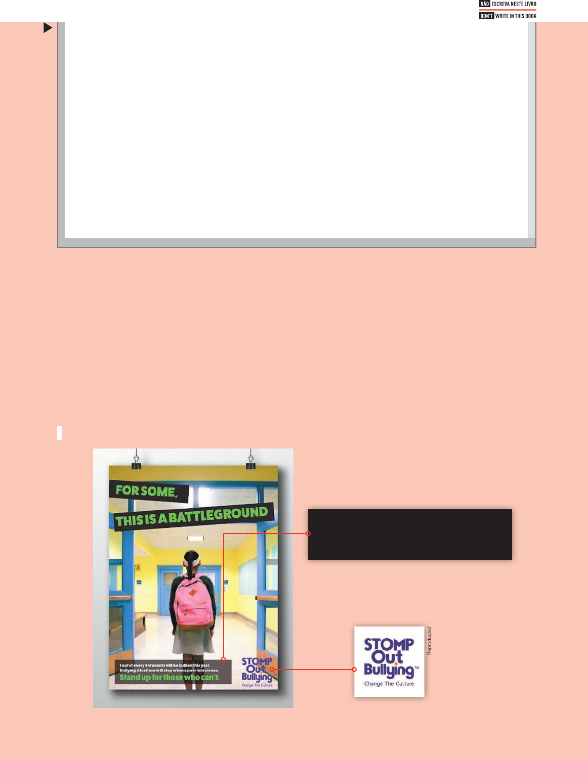 A Can you have a campaign without a problem you want to change? B Is it important to think about the future you want in order to organize a campaign? C Based on the text, stakeholders are: I people the campaign wants to reach out to and people who might be allies to the campaign. II people who want to join the campaign and people who are enthusiastic about the campaign. D Are communication features such as posters with campaign slogan, hashtags or other advertisement necessary? Why (not)? 4 Look at the following campaign posters and answer the questions about them. I No, you can’t. Yes, it is. X Yes, they are. Because this is how the campaign will reach its target audience. R e p ro d u ç ã o /w w w .b e h a n c e .n e t R e p ro d u ç ã o / s to m p o u tb u lly in g .o rg KEY Elements of an Effective Campaign Strategy. UN Women. Available at: https://www.endvawnow.org/en/ articles/1197-key-elements-of-an-effective-campaign-strategy.html. Accessed on: Sept. 5, 2020. • Who are the stakeholders? The strategy must defi ne: • The target audiences, i.e. the persons or institutions the campaign needs to infl uence to attain its goal, and how these audiences will be reached. (See also Stakeholder Analysis). • Prospective allies and participating groups likely to join the campaign, and their potential roles in the campaign. • What strategic elements of the campaign are needed to reach its goal? An effective campaign strategy requires sub-strategies for specifi c aspects of campaign implementation: • The communications strategy, which outlines key messages, and the channels and tools by which the campaign will communicate with the target audiences. • The resource mobilization strategy, which maps available and required resources (fi nancial, institutional, networks etc.), and outlines the campaign fundraising plan. (See Resource Mapping and Financing and Fundraising Strategies). • A scaling-up strategy, if it is intended to bring the campaign to a larger scale. • An exit strategy, which determines when and how the campaign will be ended. In longer-term campaigns, it may be useful to include different scenarios for the future. 1 out of every 4 students will be bullied this year, Bullying situations will stop when a peer intervenes. Stand up for those who can’t. R e p ro d u ç ã o / 185 VU_INGLES_Julia_g21At_184a187_SOCIAL2_LA.indd 185VU_INGLES_Julia_g21At_184a187_SOCIAL2_LA.indd 185 9/27/20 6:05 PM9/27/20 6:05 PM A Which poster presents information about the consequences of bullying? Mention two of them. B Which poster presents a call to action and what is it? C Do the posters identify the campaign they are part of? What are the names of the campaigns? D Which poster do you prefer? Why? 5 Is bullying a problem in your school? How can you tell? Planning the Campaign You learned the importance of language in society and the impact it can have on people. So, this year we are going to organize a campaign at school. Let’s plan it together! 1 Get together in groups and discuss the following questions. Then share your thoughts with the whole group so you can choose the best subject for a campaign together. A What problem do you want to address with your campaign and why is it relevant in your school? B What do you want to see different? How do you imagine the future after the campaign? C Who is the target audience of the campaign? Who are potential allies for your campaign? D What actions will you plan for the campaign? How will these actions solve the problem? E What resources do you need to make your campaign happen? Where can you fi nd them? F What is your communication strategy? Will you promote your campaign with posters, fl yers, hashtags, social media, instant messages? G When will your campaign end? Poster I. “Stand up for those who can’t.” Yes, they do. Stomp Out Bullying and Bullies Out. Personal answers. Personal answers. Personal answers. Poster II. Possible answer: Lack of con� dence, low self-esteem, depression, stress, self-harm, truancy, II academic issues, social problems, loneliness, mood swings. © 2 0 2 0 B u lli e s O u t/ h tt p s :/ /b u lli e s o u t. c o m Lack of Confidence Low Self-Esteem Depression Stress Truancy Self-Harm Academic Issues Social Problems Loneliness Mood Swings 186 VU_INGLES_Julia_g21At_184a187_SOCIAL2_LA.indd 186VU_INGLES_Julia_g21At_184a187_SOCIAL2_LA.indd 186 9/27/20 6:05 PM9/27/20 6:05 PM