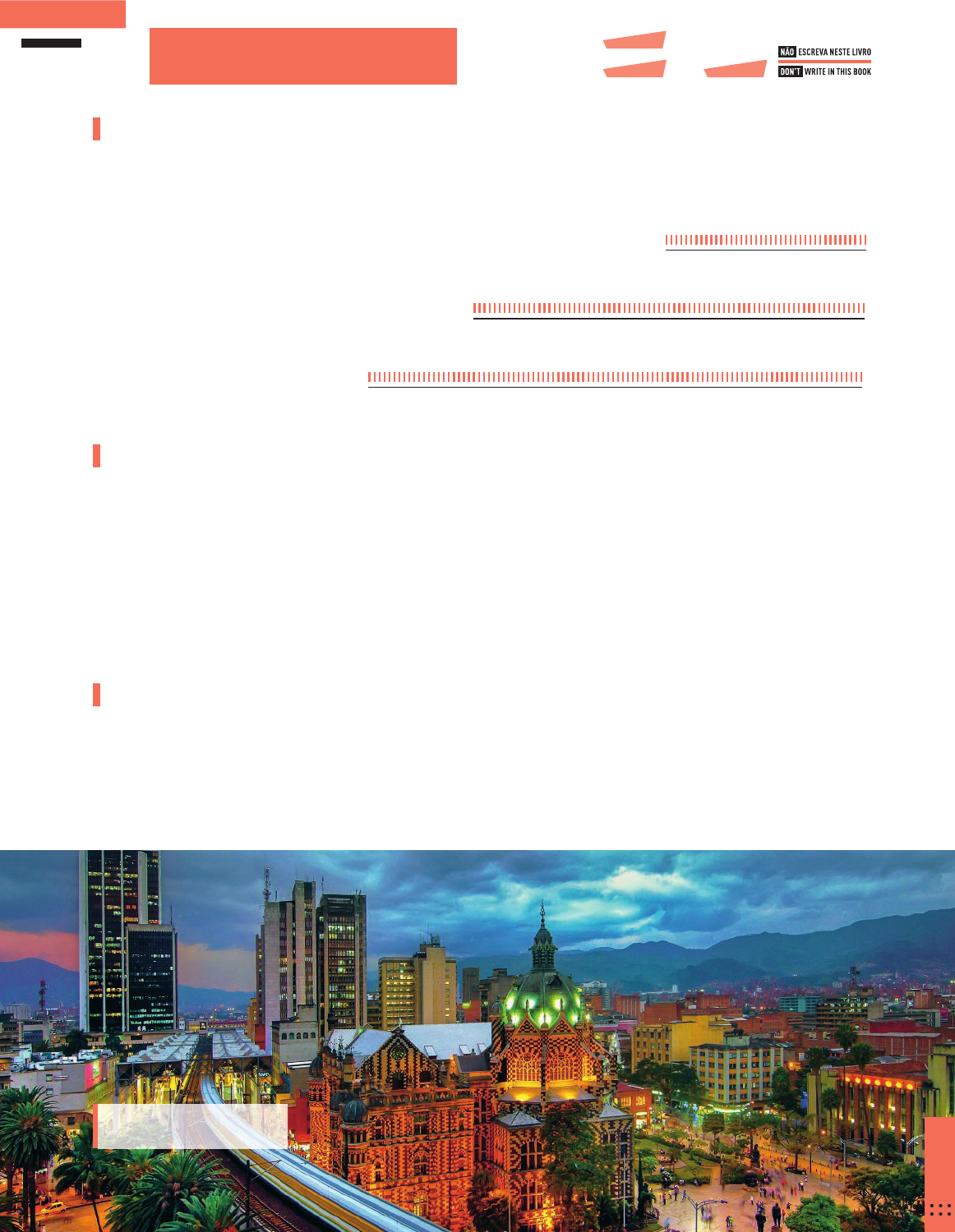 LANGUAGE ANALYSIS 1 Read the following extract from Read on and choose the best alternative to complete each sentence. Write the answers in your notebook. Since Perrograff started the Graf� tour three years ago, it has brought hundreds of visitors to the once-neglected streets of Comuna 13. A This text was published in 2015, so Perrograff started Graffi tour . • in 2012 X • in 2016 B The pronoun it in the sentence refers to . • Perrograff • Graffi tour X C Because of Graffi tour, now . • people neglect the streets of Comuna 13 • people visit the streets of Comuna 13 X 2 Read the sentence in activity 1 again and classify the sentences as T (true) or F (false) in your notebook. A Graffi tour started in the past and there is a time reference about it in the sentence. T B The streets of Comuna 13 are visited now because of the effect of an action that happened in the past: the creation of Graffi tour. T C There are no time references about the beginning of Graffi tour. F D The effects of creating Graffi tour are restricted to when it was created. F E The impacts of creating Graffi tour are still going on, as people still take the tour. T 3 Read the sentence below, also from the text in Read on. Then answer the questions in your notebook. Grassroots efforts like the Graf� tour have been a vital part of Medellín’s transformation A Are there other initiatives to transform Medellín? B Did Medellín fi nish this transformation process or is it a continuous process? Yes, there are. It is a continuous process. Botero Square, Medellín (Colombia), 2012. Anthony John Coletti/Getty Images EM13LGG103 EM13LGG604EM13LGG403 251 VU_INGLES_Julia_g21At_240a257_U14_LA.indd 251VU_INGLES_Julia_g21At_240a257_U14_LA.indd 251 9/28/20 9:44 AM9/28/20 9:44 AM 4 Read the sentences from Listen up! and Read on. Match them to the items in your notebook. I Copenhagen’s transformation hasn’t been easy. II Since Perrograff started the Graffi tour three years ago, it has brought hundreds of visitors to the once-neglected streets of Comuna 13. III Grassroots efforts like the Graffi tour have been a vital part of Medellín’s transformation. A They are affi rmative statements. II and III. B It is a negative statement. I C The subject of the sentence is in the third person singular. I and II. D The subject of the sentence is in the third person plural. E There is a form of the verb have in the sentence, but it doesn’t indicate possession. 5 Pay attention to the use of the verb have in the statements in activity 4 and write the base form of the verbs after have in your notebook. A Be, bring, be. X B Be, bring, go. 6 What is common to all three statements in activity 4? Answer in your notebook. A They are all in the Simple Past Tense. They describe actions that started in a specifi c time in the past and that fi nished in the past. B They all refer to something that happened or started in the past and still have effects or consequences from them in the present. So, they are all in the Present Perfect Tense. X 7 Read and choose the correct option to complete the text from the box, then write the missing examples. Use your notebook. III I, II and III. Past; present; auxiliary. THE PRESENT PERFECT The Present Perfect is used to talk about situations from the past / future that still have an effect or consequences occurring in the past / present. The verb have is an auxiliary / main verb in the Present Perfect Tense. The Present Perfect is formed with: Subject + have/has + verb in the past participle + complement. Examples: It has brought hundreds of visitors. • The negative form of the Present Perfect is formed with: Subject + have/has + not + verb in the past participle + complement. Examples: Copenhagen transformation has not (hasn’t) been easy. • The interrogative form of the Present Perfect is formed with: Have/has + subject + verb in the past participle + complement? Examples: Has Copenhagen transformation been easy? • Have grassroots efforts like the Graffi tour been a vital part of Medellín’s transformation? • Has Copenhagen transformation been easy? • Has it brought hundreds of visitors? • Have grassroots efforts like the Graffi tour been a vital part of Medellín’s transformation? 252 VU_INGLES_Julia_g21At_240a257_U14_LA.indd 252VU_INGLES_Julia_g21At_240a257_U14_LA.indd 252 9/28/20 9:44 AM9/28/20 9:44 AM