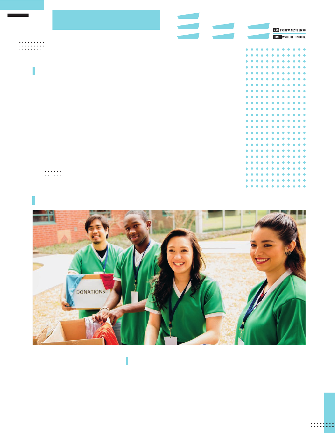 73 Pre-speaking 1 How do you usually express your opinion? Read the sentences below and write the ones that are true to you. Use your notebook. A I express my opinions online all the time. B I give my opinion only in person, talking to my closest friends. C I express myself about every topic, even when I don’t know much about the subject. D I express my opinion in a respectful way and I listen to what other people say. Personal answers. SPEAK YOUR MIND Speaking 2 Look at the picture and answer: What do you see in it? Possible answer: People giving clothes to others. 3 Work in pairs. You are going to express your opinion about the picture in activity 2. Follow these steps. • Plan what you are going to say individually. Read the following questions and think of how to answer them. Use what you learned in this Unit to justify your opinions and take notes in your notebook. P a m e la A lb in M o o re /f s to p 1 2 3 /E + /G e tt y I m a g e s EM13LGG402 EM13LGG304 EM13LGG204 EM13LGG201 EM13LGG403EM13LGG301 EM13LGG303 VU_INGLES_Julia_g21At_062a077_U04_LA.indd 73VU_INGLES_Julia_g21At_062a077_U04_LA.indd 73 9/27/20 11:00 AM9/27/20 11:00 AM 74 A Is this people attitude ethical? Why (not)? B Is this attitude related to any aspects of sustainable fashion (environmental, social and ethical)? If so, to which ones? How? C Do you think it is important to donate things? Why (not)? • Share your opinions and arguments with your partner and listen to what he/she has to say. Follow the examples: • Analyze your partner’s point of view and arguments. Do you agree with him/her? Tell your partner and don’t forget to justify your opinion. The following expressions can help: Post-speaking 4 Could you express yourself using arguments to justify your opinions? 5 After listening to your classmates’ presentations, did you change your opinions? 6 Did you learn anything new about the topic from your classmates’ presentations? What? Personal answer. Personal answer. Personal answers. I agree with you, because… I disagree with you, because… I think (that) this people attitude is ethical, because... I believe that... In my point of view, this people attitude isn’t wrong... From my point of view... • After talking to your partner, prepare yourself to present your opinions to the other classmates and teacher. Adjust your arguments, if necessary. • Present your opinions to the rest of the class and listen carefully to the others’ points of view. M o n k e y B u s in e s s I m a g e s / S h u tt e rs to ck VU_INGLES_Julia_g21At_062a077_U04_LA.indd 74VU_INGLES_Julia_g21At_062a077_U04_LA.indd 74 9/27/20 11:00 AM9/27/20 11:00 AM