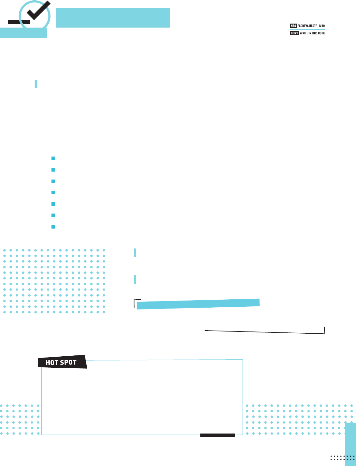 SELF–ASSESSMENT Nesta unidade, conve rsamos sobre temas relacionados à tecnologia aplicada à educação. Chegou o momento de refl etir sobre seu aprendizado ao longo da unidade. Vamos começar? 1 Como você avalia a sua aprendizagem com relação aos tópicos a seguir? Enumere os itens de 1 a 3 de acordo com a legenda. Use o caderno. 1 Ainda sinto muita dificuldade com este assunto e não consegui realizar a maioria das atividades propostas. 2 Aprendi o assunto, mas em algumas ocasiões senti dificuldade em realizar as atividades propostas. 3 Aprendi o assunto e realizei a maioria das atividades propostas com facilidade. ( ) Ler um infográfico sobre tecnologia e educação. ( ) Reconhecer e utilizar vocabulário relacionado ao tema da unidade. ( ) Ouvir sobre recentes mudanças na educação. ( ) Fazer uma pesquisa sobre digital literacy em sites confiáveis. ( ) Conhecer e utilizar as formas do Present Continuous. ( ) Preencher um formulário para inscrição em um curso on-line. ( ) Fazer uma introdução pessoal em um curso on-line. Respostas pessoais. 2 O que você mais gostou de aprender nesta unidade? O que menos gostou? 3 O que não aprendeu muito bem e precisa de estudo extra? Os links a seguir podem ajudá-lo(a) em seus estudos: • EZEKIEL, Rebecca. Learn English Tenses: Present Continuous (Present Progressive). Learn English with Rebecca. Disponível em: https://www.youtube.com/watch?v=w04YVmJR4w4. • WHAT Are Credible Websites? Hartness Library. Disponível em: https://www.youtube.com/watch?v=AFEwwG7rq0E. Acesso em: 5 ago. 2020. Keep a record of every new word you learn and try to use it whenever you can. How can I become a lifelong learner? 29 VU_INGLES_Julia_g21At_014a029_U01_LA.indd 29VU_INGLES_Julia_g21At_014a029_U01_LA.indd 29 9/27/20 10:58 AM9/27/20 10:58 AM 2 Social Networks for Social Transformation LEARNING PATH Nesta Unidade, você vai: • ler um meme e conhecer as características do gênero; • ler um article sobre o uso de redes sociais e seu impacto na sociedade; • conhecer o vocabulário relacionado a redes sociais; • pesquisar cultura de cancelamento; • ouvir trecho de um programa jamaicano sobre cuidados a serem tomados em redes sociais; • reconhecer e utilizar there is / there are, some / any, many / much; • produzir um vídeo-minuto para divulgar um movimento social; • produzir um meme com base nos temas discutidos. A BNCC NESTA UNIDADE Competências gerais: 1 e 5 Competências específicas de Linguagens e suas Tecnologias para o Ensino Médio: 1, 2, 3, 4 e 7 Temas contemporâneos transversais: Vida familiar e social, Ciência e tecnologia As habilidades estão listadas no início de cada seção. V K A /S h u tt e rs to ck Veja encaminhamentos para o trabalho com esta Unidade no Manual do Professor. 30 VU_INGLES_Julia_g21At_030a045_U02_LA.indd 30VU_INGLES_Julia_g21At_030a045_U02_LA.indd 30 9/27/20 10:58 AM9/27/20 10:58 AM