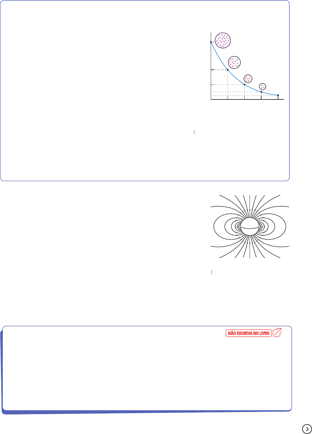 ARTICULAÇÃO DE IDEIAS 1. Explique por que é difícil propor uma definição para “vida” e como os biólogos fazem esse tipo de definição atualmente. 2. Retome as propriedades que indicam processos de vida. Escolha um organismo vivo e explique como ele apresenta cada uma dessas propriedades. 3. Que evidências são utilizadas pelos paleontólogos na reconstrução da história da vida? 4. Por que os fósseis podem ser usados como evidência direta para determinação da idade relativa das rochas? 5. Como o tempo de meia-vida de radioisótopos pode ser uma ferramenta para determinar a idade de fósseis e rochas? 6. Suponha que um paleontólogo tenha coletado o fóssil de uma presa de um tigre-dentes-de-sabre soterrada no interior de uma caverna. Análises químicas de sua composição indicam uma taxa de carbono-14 de 6,25 ppm. Sabendo que o tempo de meia-vida do carbono-14 é de 5 730 anos, calcule a idade aproximada desse fóssil. Tempo de meia-vida O tempo de meia-vida é o tempo necessário para que metade dos núcleos radioativos de uma amostra se desintegre. Em outras palavras, é o tempo para que uma amostra radioativa seja reduzida à metade. Cada radioisótopo apresenta um tempo próprio de meia-vida. Os paleontólogos utilizam o ra- dioisótopo carbono-14 (C-14) para determinar a idade das rochas sedimen- tares e, consequentemente, a idade dos fósseis ali encontrados. O carbono-14 é encontrado nos seres vivos em uma concentração cons- tante de 10 ppb (partes por bilhão). Os seres vivos absorvem esse radioi- sótopo ao longo da vida. Após a morte, cessa a absorção e o radioisótopo começa a se desintegrar. O resultado da desintegração do nêutron nuclear do carbono-14 origina como produto o átomo de nitrogênio-14. Analisando o gráfico (�gura 3.27), suponha que uma amostra fóssil tenha sido coletada e que seu teor de C-14 fosse de 2,5 ppb. Isso corresponde a 25% do teor de C-14 encontrado em organismos vivos. Portanto, são duas meias-vidas completas: 100% ~ 50% ~ 25% 5 730 anos 5 730 anos 5 730 anos 3 2 5 11 469 anos! Além do carbono-14, também são utilizados outros elementos radioativos para identificar a idade absoluta de fósseis bem mais antigos. O urânio-234, por exemplo, tem meia-vida de 80 mil anos; o urânio-235, de 704 milhões de anos; e o potássio-40, de 1,25 bilhão de anos. 100 50 10,0 g 5,00 g 2,50 g 1,25 g25 12,5 0 Decaimento do carbono-14 C a rb o n o -1 4 r e st a n te Número de meias-vidas (1 meia-vida 5 5 730 anos) 21 3 4 # Figura 3.27 – A meia-vida do C-14 é de 5 730 anos. B a n c o d e i m a g e n s /A rq u iv o d a e d it o ra Há ainda outros métodos, como a datação paleomagnética. Quando se formam rochas sedimentares e vulcânicas, o ferro presente nas rochas se ali- nha ao campo magnético da Terra. Sabe-se que, ao longo do tempo, os polos magnéticos do planeta se revertem. Porém, as rochas preservam o registro magnético de quando foram formadas, uma vez que os átomos de ferro se tornam imóveis com o endurecimento da rocha. Desse modo, é possível estimar a idade relativa dessas rochas com base em sua relação com os padrões do magnetismo terrestre. Esse tipo de datação é utilizado quando os paleontólogos não têm certeza se determinadas rochas são contemporâneas exatas ou apenas temporalmente próximas. Se suas po- laridades são diferentes, elas não podem ser contemporâneas exatas. Outras ferramentas de medição de idade dos fósseis são importantes, como o relógio molecular. Essa é uma técnica que utiliza conhecimentos em genética e evolução molecular. A partir de sequenciamento de moléculas de DNA ou proteínas de espécies diferentes, é possível observar diferenças moleculares entre elas. O número de diferenças observado está relacionado a seu parentesco ao longo da história da vida. Dessa forma, quanto mais aparentados, menor o tempo de separação entre as espécies. N S # Figura 3.28 – Modelo do campo magnético da Terra. B a n c o d e i m a g e n s /A rq u iv o d a e d it o ra 127A vida na Terra e as evid•ncias de sua origem 110a132_V1_CIE_NAT_Mortimer_g21Sc_U2_Cap3_LA.indd 127110a132_V1_CIE_NAT_Mortimer_g21Sc_U2_Cap3_LA.indd 127 9/3/20 6:40 PM9/3/20 6:40 PM # Figura 3.31 – Representação esquemática de pegadas hipotéticas. Os elementos não estão representados em proporção. Cores fantasia. Elaborado com base em: NATIONAL Academy of Sciences. Teaching about Evolution and the Nature of Science. Washington, DC: The National Academies Press, 1998. Disponível em: https://doi.org/10.17226/5787. Acesso em: 25 ago. 2020. No Brasil há vários locais onde foram encontrados registros fósseis de pegadas de animais que � caram petri� - cadas e que podem ser observadas atualmente. Nesta investigação, faremos nossas primeiras aproximações desse tipo de estudo, fundamental para compreendermos o modo como os cientistas reconstroem a história da vida. MATERIAL Material para anotação. O QUE FAZER 1. Observe as imagens a seguir. a) A primeira é um mapa do Vale de Pegadas, um registro encontrado no Nordeste do Brasil por um grupo de pesquisadores. A análise de pega- das permite construir ilustrações que descrevam como era o ambiente naquela época e como eram os dinossauros que ali viviam. Análise do registro fóssil INVESTIGAÇÃO # Figura 3.29 – Mapa do Vale de Pegadas. CARVALHO, I. de S.; BORGHI, L.; LEONARDI, G. Preservation of dinosaur tracks induced by microbial mats in the Sousa Basin (Lower Cretaceous), Brazil. Cretaceous Research, v. 44, p. 112-121, 2013. b) A � gura a seguir apresenta registros fósseis hipotéticos de pegadas de animais. # Figura 3.30 – (a) Fotogra� a de pegadas. Sousa, PB, 2018. (b) Reconstrução artística feita com base nos estudos das evidências fossilizadas encontradas em Sousa, PB, 2017. (a) (b) T ia g o D o n iz e te L e m e / A rq u iv o d a e d it o ra D e l� m M a rt in s /P u ls a r Im a g e n s D e l� m M a rt in