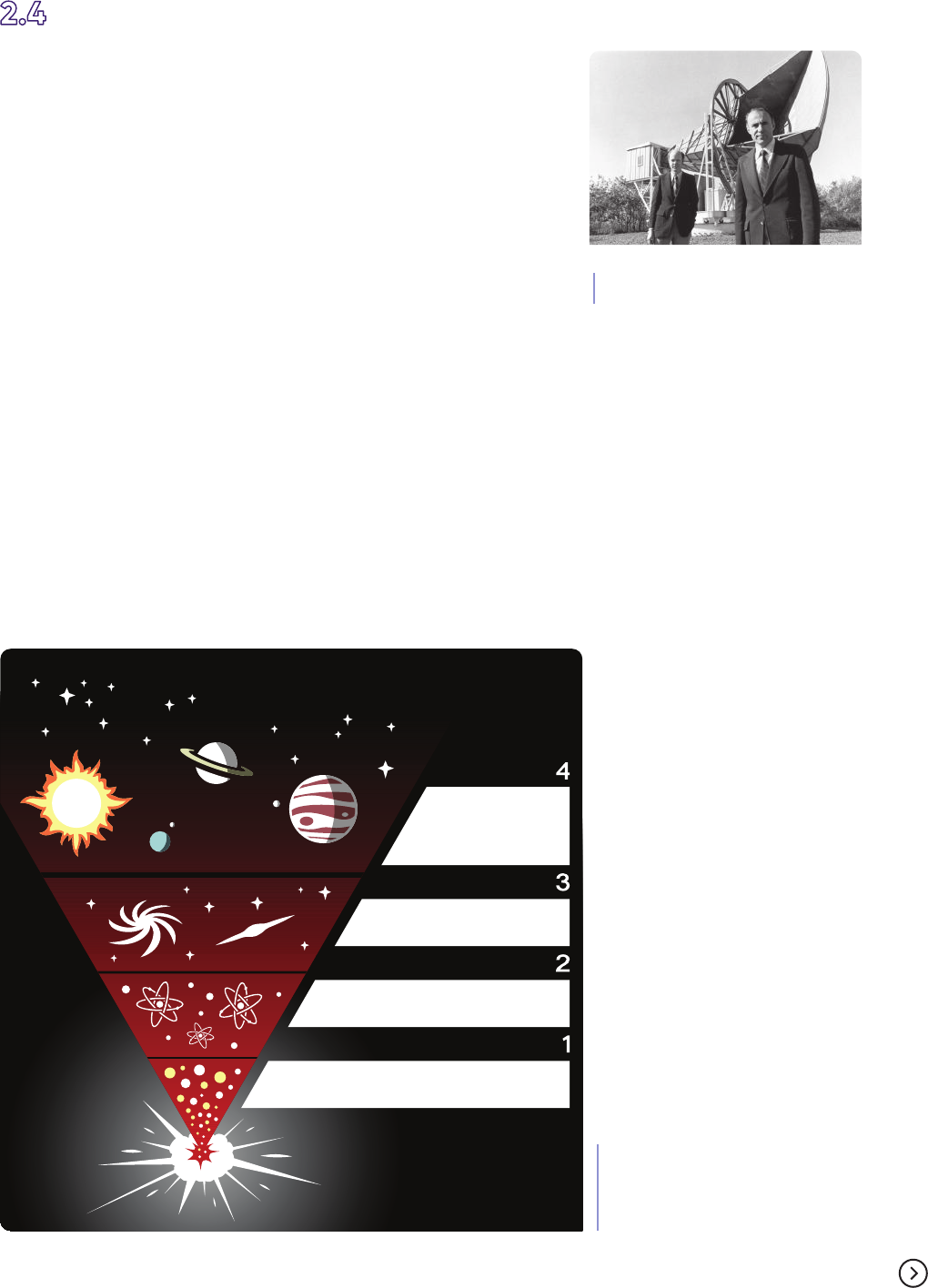 O eco do big bang Em 1965, quando trabalhavam na companhia ATT-Bell Laboratories, os pesquisadores Arno Penzias (1933-) e Robert Wilson (1941-) (�gura 2.52) tiveram dificuldade em eliminar um ruído captado por antenas que seriam destinadas à comunicação por micro-ondas em radares. Inicial- mente, eles acreditaram que as antenas estavam com defeito, porém, após entrar em contato com trabalhos de pesquisadores que tentavam entender a expansão do Universo, associaram o ruído de micro-ondas captado ao eco de uma grande explosão. A detecção dessa radiação foi considerada um forte indício para a validade da teoria do big bang. A busca pelo entendimento da constituição da matéria nos levou a concebê-la como formada por partículas, consideradas inicialmente in- divisíveis, mas que se revelaram compostas de outras mais elementares, como o átomo. Este é constituído de elétrons, prótons e nêutrons, e os dois últimos são formados por quarks. Nos grandes aceleradores de partículas, o objetivo é quebrar as partículas e verificar quais delas são elementares, ou seja, indivisíveis. É como se quiséssemos voltar no tempo. O chamado big bang ocorreu há cerca de 14 bilhões de anos. No início, o Universo era tão quente que não havia os átomos, mas apenas uma sopa de partículas elementares. Com a expansão, a temperatura do Universo diminuiu e as partículas elementares combinaram-se e formaram estruturas maiores. Os prótons e nêutrons formaram-se dos quarks e, cerca de 300 mil anos depois do big bang, foram constituídos os primeiros átomos, com a combinação de elétrons, prótons e nêutrons. A matéria produzida com a formação dos átomos começou a se agregar em diversas regiões do espaço e as primeiras estrelas e galáxias começaram a se constituir cerca de 300 milhões de anos depois do big bang. Como veremos mais adiante, os elementos químicos foram formados pelas primeiras estrelas, que depois explodiram e geraram estrelas de segunda geração e seus planetas. Estima-se que o Sistema Solar e a Terra foram criados cerca de 9,5 bilhões de anos depois da explosão, ou seja, há 4,5 bilhões de anos. Essa estimativa é baseada na idade das rochas mais antigas da Terra. A �gura 2.53 representa alguns eventos importantes da história do Universo. # Figura 2.53 – Representação da evolução do Universo conforme a teoria do big bang. Os elementos não estão representados em proporção e distâncias. Cores fantasia. U n iverso em exp an são e resfriam en to ˆ14 bilhões de anos atrás: big bang primeiros segundos após o big bang de partículas subatômicas à 300 mil anos depois: elétrons e núcleos combinados na forma de átomos à 300 milhões de anos depois: início da formação de estrelas e galáxias à 9,5 bilhões de anos depois: formação do Sistema Solar e da Terra b a n d e rl o g /S h u tt e rs to ck # Figura 2.52 – Penzias e Wilson em frente à antena de micro-ondas Holmdel. Cerca de 1963. E m ili o S e g re V is u a l A rc h iv e s /a m e ri c a n In s ti tu te O f P h y s ic s /S P L /F o to a re n a 89Do big bang à formação da Terra 062a109_V1_CIE_NAT_Mortimer_g21Sc_U1_Cap2_LA.indd 89062a109_V1_CIE_NAT_Mortimer_g21Sc_U1_Cap2_LA.indd 89 9/3/20 6:37 PM9/3/20 6:37 PM Na Mecânica newtoniana, o tempo e o espaço são quantidades absolutas, isto é, não se modificam em função do movimento dos corpos. Mas, com a teoria da relatividade de Einstein, esses conceitos deixaram de ser absolutos e passaram a depender da velocidade dos corpos. Nesta atividade, iniciaremos nossas reflexões sobre a relatividade. O QUE FAZER Observe as tirinhas a seguir. A dilatação do tempo e a contração do espaço INVESTIGAÇÃO # Figura 2.54 – Tirinha representando o paradoxo dos gêmeos. REFLEXÃO 1. Como você interpreta cada uma das tirinhas? Escreva um pequeno texto apresentando sua compreensão sobre cada uma delas. # Figura 2.55 – Tirinha representando um dos efeitos previstos pela teoria da relatividade. R e p ro d u ç ã o /w w w .s c ie n c e a b c .c o m R e p ro d u ç ã o /( a g ê n c ia d e p u b lic id a d e , e d it o ra , g ra v a d o ra , p ro d u to ra e /o u d is tr ib u id o ra ) 90 Cap’tulo 2 062a109_V1_CIE_NAT_Mortimer_g21Sc_U1_Cap2_LA.indd 90062a109_V1_CIE_NAT_Mortimer_g21Sc_U1_Cap2_LA.indd 90 9/3/20 6:37 PM9/3/20 6:37 PM