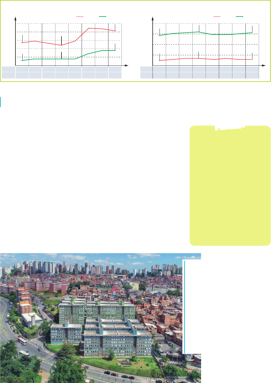 A desigualdade de renda entre as áreas urbana e rural pode ser constatada em um estudo feito pela Fundação Getúlio Vargas (FGV), que mostra grande disparidade nos Índices de Gini e no rendimento domiciliar per capita dessas áreas. Brasil: Desigualdade de renda rural e urbana – 2012-2019 Fonte: FGV publicado em Valor Econômico, 2019. Disponível em: https://valor.globo.com/brasil/noticia/2019/09/19/ desigualdade-cresce-mais-no-meio-rural.ghtml. Acesso em: 18 set. 2020. Os dados consideram apenas a renda oriunda de trabalho remunerado no segundo semestre de cada ano. É desconsiderada qualquer renda proveniente de programas de transferência de renda ou aposentadorias, por exemplo. Observe os gráficos acima, sobre desigualdade de renda entre as áreas urbana e rural. 1. Qual era a diferença, em reais, do rendimento do- miciliar per capita entre as áreas urbana e rural no se- gundo trimestre (indicado por 2T nos eixos horizontais dos gráficos) de 2019? E no segundo trimestre de 2015? 2. Considerando o que você já estudou a respeito do Ín- dice de Gini ao longo deste capítulo, o que significam os dados apresentados so- bre o Índice de Gini da ren- da do trabalho per capita? PENSE+PENSE+ C a s a d e I d e ia s /A rq u iv o d a e d it o ra C e s a r D in iz /P u ls a r Im a g e n s A urbanização de favelas é uma das soluções para transformar aglomerações informais, com moradias precárias, em espaços integrados à cidade, dotados de infraestrutura de saneamento e equipamentos urbanos. Infelizmente, tais iniciativas têm acontecido de modo insuficiente para sanar o problema no país. Na imagem, vista aérea da comunidade de Paraisópolis em São Paulo (SP). No primeiro plano, é possível identificar conjuntos habitacionais do Projeto Nova Paraisópolis, parte do Programa Municipal de Urbanização de Favelas. Fotografia de 2020. 0,670 1 200 950 700 450 200 0,652 0,634 0,629 0,616 0,598 0,580 Índice de Gini da renda do trabalho per capita Rendimento domiciliar per capita — em reais 0,624 0,655 925,24 987,59 366,50328,67 981,41 345,43 Rural 0,591 2T 2012 2013 2014 2015 2016 2017 2018 2019 2T 2T 2T 2T 2T 2T 2T 2T 2012 2013 2014 2015 2016 2017 2018 2019 2T 2T 2T 2T 2T 2T 2T 0,593 0,613 Urbana Rural Urbana Mas, se as áreas mais urbanizadas apresentam redes de infraestrutu- ra mais desenvolvidas, por que nessas áreas também é possível identi- ficar desigualdade no acesso a serviços públicos? A favelização é uma possível resposta a essa pergunta. Segregação urbana e favelização Denomina-se favelização o processo de ocupação irregular de áreas não urbanizadas que, por serem irregulares, não contam com uma rede de infraestrutura que garanta serviços públicos básicos, por exemplo, saneamento básico. Esse tipo de ocupação costuma ocor- rer à medida que as cidades se expandem muito rapidamente e sem nenhum planejamento. Nessas áreas de ocupação irregular, em geral, o Estado encontra-se ausente, embora, como visto, seja o responsável pela prestação e fisca- lização de serviços públicos e de interesse coletivo, como saúde, educa- ção, saneamento básico, energia elétrica, segurança e, até mesmo, lazer. Logo, o processo de favelização, que já é decorrente de desigualda- des sociais – e, muitas vezes, também regionais –, acaba por gerar ainda mais desigualdade nas áreas urbanas. 121 VU_MAT_HUM_g21At_100a125_Cenario4_Desigualdades_LA.indd 121VU_MAT_HUM_g21At_100a125_Cenario4_Desigualdades_LA.indd 121 22/09/2020 19:4722/09/2020 19:47 Observe os mapas a seguir e, considerando a espacialização do analfabetismo por regiões, respon- da às perguntas. 7. ATIVIDADES NÃO ESCREVA NESTE LIVRO a) Onde se concentram as maiores e as menores taxas de analfabetismo de pessoas pretas? b) Quais das regiões brasileiras concentram as maiores taxas de analfabetismo de pessoas brancas e pessoas pretas? Que tal refl etir um pouco mais sobre as desigualdades regionais e de acesso a serviços públicos discutidas até aqui? Para tanto, reúna-se com dois ou três colegas e sigam as orientações. a) Elaborem duas perguntas abertas sobre os dados apresentados até este momento (não podem ser perguntas cujas respostas sejam apenas sim ou não). Em seguida, desenvolvam as respostas para as perguntas formuladas. Atenção: É importante que as perguntas não sejam nem muito amplas nem muito restritas; além dis- so, devem ser perguntas cujas respostas demonstrem o que o grupo descobriu por meio da análise dos dados. Fazer um brainstorming – anotando, in icialmente, todas as perguntas sem a preocupação de avaliar a qualidade delas – pode auxiliar no desenvolvimento desta atividade. Para avaliar a relevância das perguntas, é importante verifi car se as respostas a elas estão fundamentadas em suposições. Caso estejam, é sinal de que a pergunta ainda não está bem formulada. Refaçam o procedimento quantas vezes for necessário, de acordo com os critérios anteriores. b) Em uma roda de conversa com toda a turma, debatam o que pode ser feito para erradicar as desigualdades regionais do país. c) Pesquisem iniciativas públicas que buscam reduzir ou eliminar as desigualdades regionais do país. 8. V e s p u c io C a rt o g ra fi a /A rq u iv o d a e d it o ra Brasil: Analfa betismo por cor e raça (Branca) – 2010 Brasil: Analfabetismo por cor e raça (Preta) – 2010 Trópico de Capricórnio 50°O 0° Equador DF GO MG BA TO RJ ES MT PAAM RR AP MA CE RN PI AC RO MS RS SC PR SP PB PE AL SE OCEANO PACÍFICO OCEANO ATLÂNTICO 0° 0 580 km Até 10,00 De 10,01 a 20,00 De 20,01 a 30,00 Acima de 30,00 Pessoas de 5 anos ou mais de idade (%) DF GO MG BA TO RJ ES MT PA AM RR AP MA CE RN PI AC RO MS RS SC PR SP PB PE AL SE 50°O 0° Equador OCEANO PACÍFICO OCEANO ATLÂNTICO Trópico de Capricórnio 0 580 km Até 10,00 De 10,01 a 20,00 De 20,01 a 30,00 Acima de 30,00 Pessoas de 5 anos ou mais de idade (%) Fonte: elaborado com base em IBGE. Atlas geogr