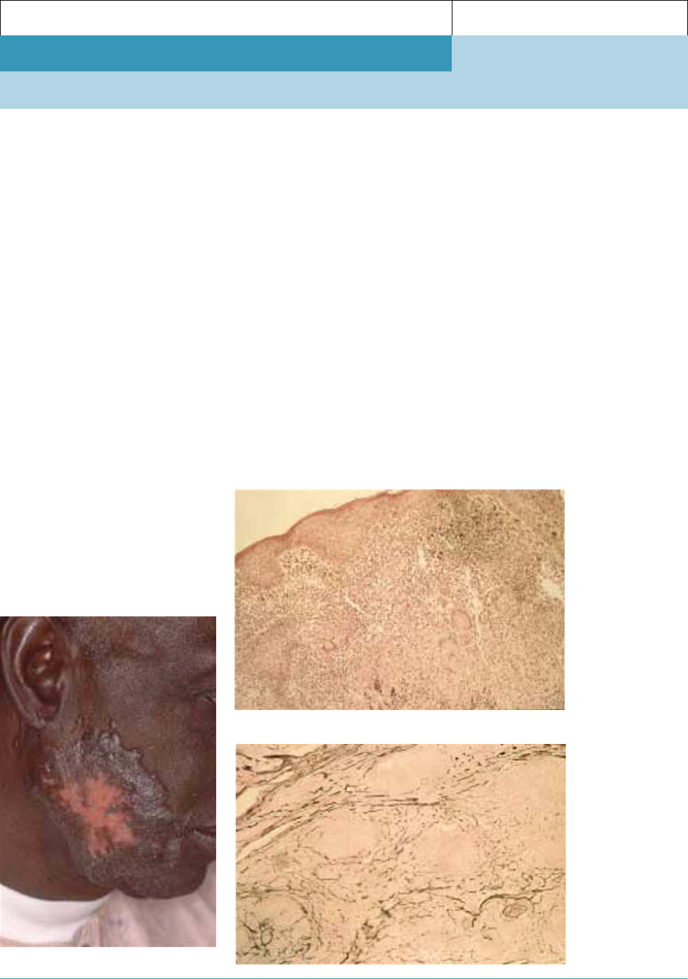 296 Ann Dermatol Venereol 2005;132:296-7Formation médicale continue Document iconographique Lupus tuberculeux* P. DIOUSSÉ (1), F. LY (2), A. GAULIER (3), A. MAHÉ (2) n homme de 70 ans, sans an- técédent particulier, consul- tait pour des lésions cutanées évoluant depuis 2 ans. A l’examen, il existait sur la joue gauche un placard in- filtré violacé à centre cicatriciel (fig. 1), ainsi que des lésions analogues de plus petite taille à proximité d’une narine, au vertex, et sur une épaule. L’état général était conservé. L’examen histologique de la lésion de la joue montrait un granulome épithélioï- de giganto-cellulaire concernant toute la hauteur du derme, accompagné d’infil- trats lymphocytaires (fig. 2). La colora- tion de Ziehl et le PAS étaient négatifs. La coloration de Gomori-Grocott objec- tivait une disparition du réseau réticuli- nique au centre des granulomes (fig. 3). L’IDR à la tuberculine était positive à 20 mm. La radio pulmonaire était nor- male. La recherche de bacilles acido-al- coolo-résistants (BAAR) dans les crachats était négative. Devant ce ta- bleau, un traitement spécifique anti-tu- berculeux était prescrit. Un mois après le début du traitement, les lésions cuta- nées étaient considérablement amélio- rées. Au huitième mois, les lésions avaient entièrement régressé, seule per- sistant une zone cicatricielle souple au niveau de la joue. Commentaires Le cas décrit correspond à une forme ty- pique de lupus tuberculeux dans sa varié- té commune dite vulgaire. Il s’agit de la plus fréquente des tuberculoses cuta- nées, qui semble toutefois rare en Afri- que en dehors du Maghreb [1, 2]. Cette (1) Centre Hospitalier Régional de Thiès, Sénégal. (2) Service de Dermatologie/MST, Institut d’Hygiène Sociale, Dakar, Sénégal. (3) Laboratoire d’anatomie pathologique, CH Victor Dupouy, Argenteuil. Tirés à part : F. LY, Institut d’Hygiène Sociale, BP 5825, Dakar, Sénégal. E-mail : lyfaty@yahoo.fr *dermatologie tropicale. Fig. 1. Lupus tuberculeux du visage : aspect clinique. Fig. 2. Lupus tuberculeux : granulome épithélioïde su- perficiel dermique et infil- trat lymphoïde (HES, × 25). Fig. 3. Lupus tuberculeux : disparition du réseau réticuli- nique au sein des granulo- mes (Gomori-Grocott, × 25). U 297 Ann Dermatol Venereol 2005;132:296-7Lupus tuberculeux variété est classée parmi les tuberculoses cutanées endogènes, et survient typique- ment chez des sujets préalablement con- taminés, ayant une forte sensibilité à la tuberculine. Volontiers localisé au visa- ge, le lupus vulgaire comporte initiale- ment des micronodules dermiques mous, qui par coalescence constituent des placards papuleux ; il existe de nom- breuses variantes cliniques (lupus plan, vorax, tumidus,…). Le caractère lupoïde (mise en évidence de grains « gelée de pomme » à la vitropression) n’est pas ap- préciable sur peau intensément pigmen- tée. Le diagnostic repose surtout sur l’histologie. Le granulome tuberculoïde est toujours présent, contrairement à la nécrose caséeuse ; la destruction de l’ar- mature réticulinique au centre des gra- nulomes en représente un équivalent utile au diagnostic. Les BAAR ne sont en règle pas mis en évidence par la colora- tion de Ziehl, ni la culture. Une tubercu- lose évolutive associée, qui serait plus volontiers ganglionnaire, est très incons- tamment associée. Récemment, des techniques de détection d’ADN myco- bactérien par amplification génique (PCR) ont été développées, techniques beaucoup plus sensibles mais d’interpré- tation délicate [3]. Le traitement de la tu- berculose cutanée est identique à celui de la tuberculose pulmonaire. Une sur- veillance à long terme est nécessaire du fait du risque de survenue de carcinome épidermoïde sur les lésions cicatricielles. Références 1. Zahaf A, Turki H, Masmoudi A. Lupus tuber- culeux. Ann Dermatol Venereol 2004;131:503-7. 2. Morand JJ, Cuguillière A, Sayag J. Tuberculose cutanée. EMC 98-360-A-10. 3. Hsiao PF, Tzen CY, Chen HC, Su HY. Polymerase chain reaction based detection of Mycobacterium tuberculosis in tissues showing granulomatous in- flammation without demonstrable acid-fast bacilli. Int J Dermatol 2003;42:281-6.