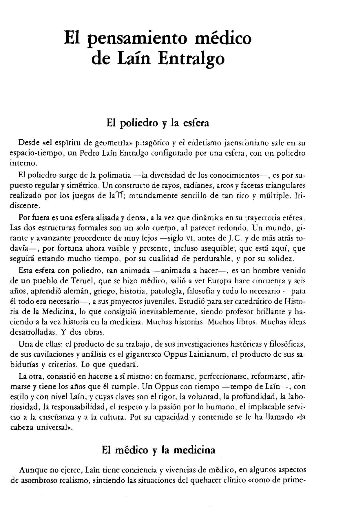 El pensamiento médico de Laín Entralgo El poliedro y la esfera Desde «el espíritu de geometría» pitagórico y el eidetismo jaenschniano sale en su espacio-tiempo, un Pedro Laín Entralgo configurado por una esfera, con un poliedro interno. El poliedro surge de la polimatia —la diversidad de los conocimientos—, es por su puesto regular y simétrico. Un constructo de rayos, radianes, arcos y facetas triangulares realizado por los juegos de laTf; rotundamente sencillo de tan rico y múltiple. Iri discente. Por fuera es una esfera alisada y densa, a la vez que dinámica en su trayectoria etérea. Las dos estructuras formales son un solo cuerpo, al parecer redondo. Un mundo, gi rante y avanzante procedente de muy lejos —siglo VI, antes de J.C. y de más atrás to davía—, por fortuna ahora visible y presente, incluso asequible; que está aquí, que seguirá estando mucho tiempo, por su cualidad de perdurable, y por su solidez. Esta esfera con poliedro, tan animada —animada a hacer—, es un hombre venido de un pueblo de Teruel, que se hizo médico, salió a ver Europa hace cincuenta y seis años, aprendió alemán, griego, historia, patología, filosofía y todo lo necesario —para él todo era necesario—, a sus proyectos juveniles. Estudió para ser catedrático de Histo ria de la Medicina, lo que consiguió inevitablemente, siendo profesor brillante y ha ciendo a la vez historia en la medicina. Muchas historias. Muchos libros. Muchas ideas desarrolladas. Y dos obras. Una de ellas: el producto de su trabajo, de sus investigaciones históricas y filosóficas, de sus cavilaciones y análisis es el gigantesco Oppus Lainianum, el producto de sus sa bidurías y criterios. Lo que quedará. La otra, consistió en hacerse a sí mismo: en formarse, perfeccionarse, reformarse, afir marse y tiene los años que él cumple. Un Oppus con tiempo —tempo de Laín—, con estilo y con nivel Laín, y cuyas claves son el rigor, la voluntad, la profundidad, la labo riosidad, la responsabilidad, el respeto y la pasión por lo humano, el implacable servi cio a la enseñanza y a la cultura. Por su capacidad y contenido se le ha llamado «la cabeza universal». El médico y la medicina Aunque no ejerce, Laín tiene conciencia y vivencias de médico, en algunos aspectos de asombroso realismo, sintiendo las situaciones del quehacer clínico «como de prime- 242 ra mano». Igualmente entiende al enfermo en sus anhelos y reacciones y percibe tam bién la enfermedad como hecho anonadante que le sucede a una persona antes sana, alterando diversamente su existencia. Acto médico, profesión de clínico, situación de enfermar, enfermedad como aconte cimiento humano y relación médico-paciente son los temas de un estudio prolongado y reiterado que le ocupa a Laín la vida entera, y que desde la vastedad y hondura de sus conocimientos le sirven para crear una teoría de la patología humana: antropología y filosofía de la medicina. Elaboración mental pura y aplicable; grandiosa y original. La obra —las dos—, de Laín, son el resultado de una decisión precoz y mantenida, de su vocación hacia el hombre y hacia el saber, apoyada en exigencias intelectuales de la mayor altura. Y han supuesto asimismo la preparación de un soporte metodológi co e instrumental muy complicado, en un ambiente contrario al sistema que Laín iba necesitando. Se tiene que armar de una cultura clásica y a la vez moderna, en áreas científicas, históricas y literarias con sus correspondientes expresiones y de las antenas aptas para Ja captación de las señales de su tiempo y de los signos —crípticos o simbólicos— del pasado. Grecia, el prehelenismo, Roma. El Medioevo, el nacimiento de Occidente y el Renaci miento. El siglo XVI en España y Europa. El Nuevo Mundo, La razón, y los siglos XVII y XV11I. El XDt y la reinvención de la Ciencia. Los cambios sociales, las ideologías y revo luciones. Siglo XX, el Progreso y los retrocesos, los probabilismos de la futurología. La realidad de antes y la de hoy, incluso la de mañana del enfermar humano. En los conceptos, los autores, las escuelas y las corrientes doctrinales de toda época y lugar, Laín, va avanzando, haciéndose, en su praxis, en su logos y en cuanto persona. Mientras habla, explica, dirige y escribe. El lenguaje le preocupa y ocupa, al darse cuenta inmediatamente de sus posibili dades y de sus limitaciones en la ideación; el lenguaje permite e impide ya que es el pensamiento mismo. A la vez, el pensamiento son los lenguajes, pues ambos surgen genéticamente en interestimulación y en interfecundación. El lenguaje médico —tema de una serie de artículos que está publicando tnjano ahora—, reviste para Laín una importancia fundamental. Es la base, el instrumento facilitador de los conceptos posibles y su calidad de preci sión revela la riqueza intelectual de un contenido. O su pobreza y chabacanería, tan frecuentes en bastantes comunicaciones actuales, realizadas con tópicos vulgares y un exiguo vocabulario; en ocasiones, es desolador. Laín aboga por un lenguaje sobrio y preciso, sin miedo a los neologismos —en Me dicina indispensables—, ni a las novedades lingüísticas procedentes de la invención técnica. Un lenguaje cuidado y cuidadoso en el que las palabras y las ideas sean una realidad simultánea, como un cuerpo y su piel —piel ceñida y sin arrugas—. La retórica está pasada y sólo representa junto al exceso de citas, la pobreza mental del hablante o escribiente. Pero si la medicina es una actividad de alta categoría inte lectual deberá disponer de un léxico extenso que le permita realizar frases exactas ade cuadas a la complicación intrínseca de los fenómenos. 243 Los datos tecnológicos y científicos con sus variables, deben ser traducidos para una «única lectura posible» en el receptor del mensaje. Asistolia, cetogénesis, amaurosis lacunar... y cualquier expresión del diagnóstico y de la terapéutica tienen